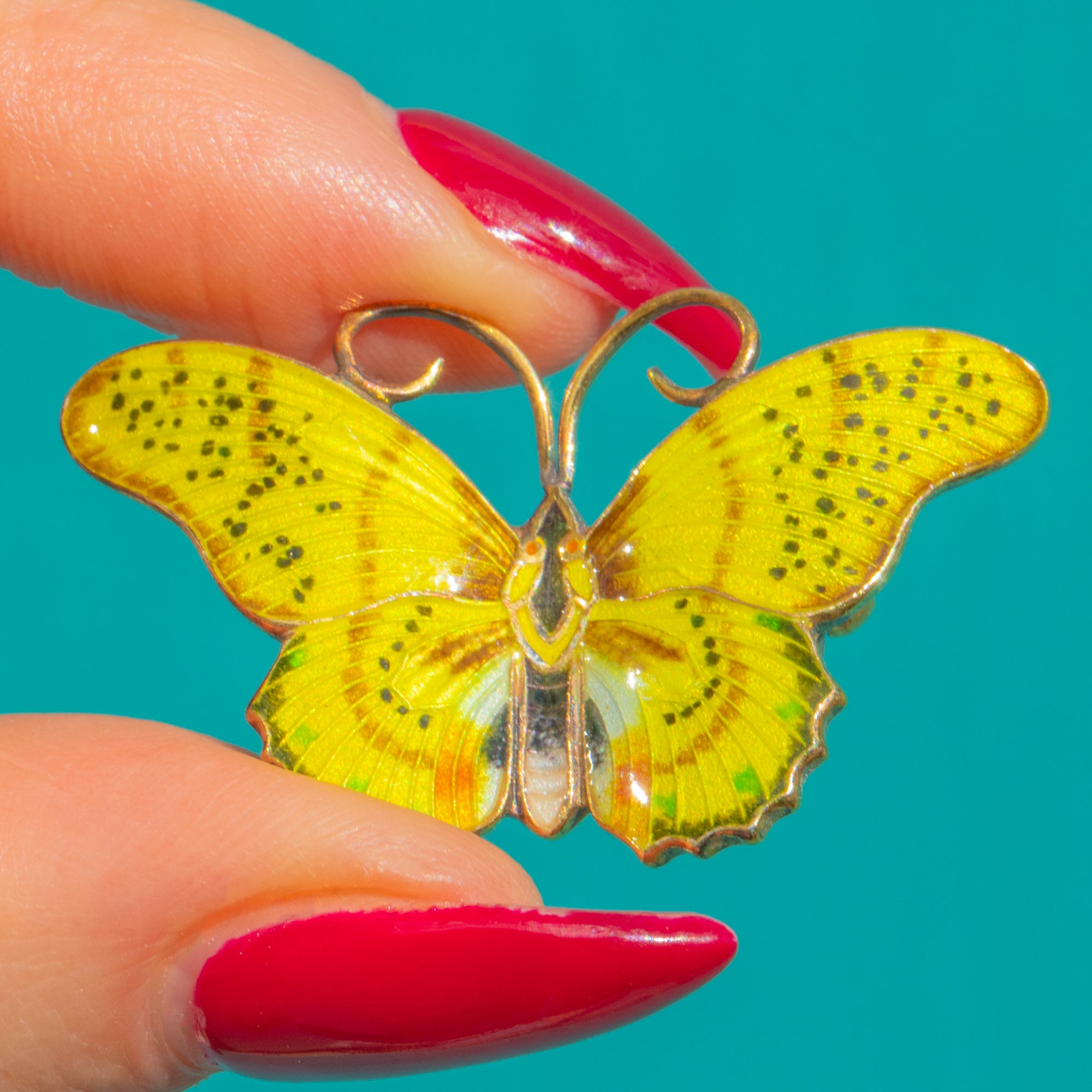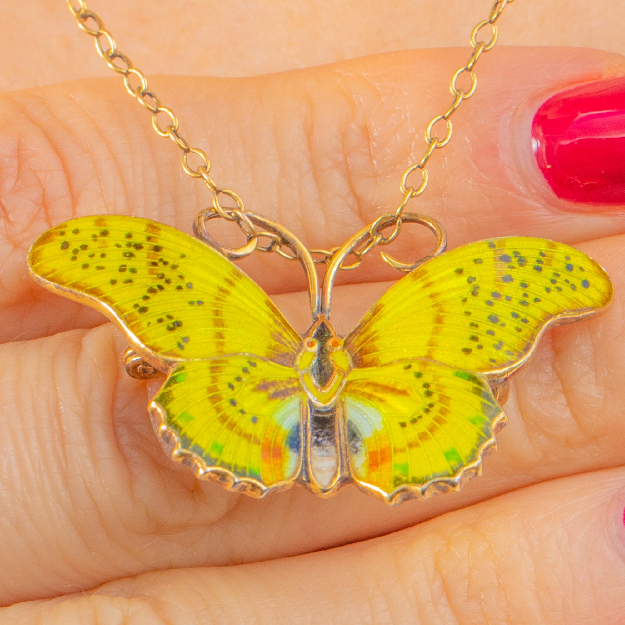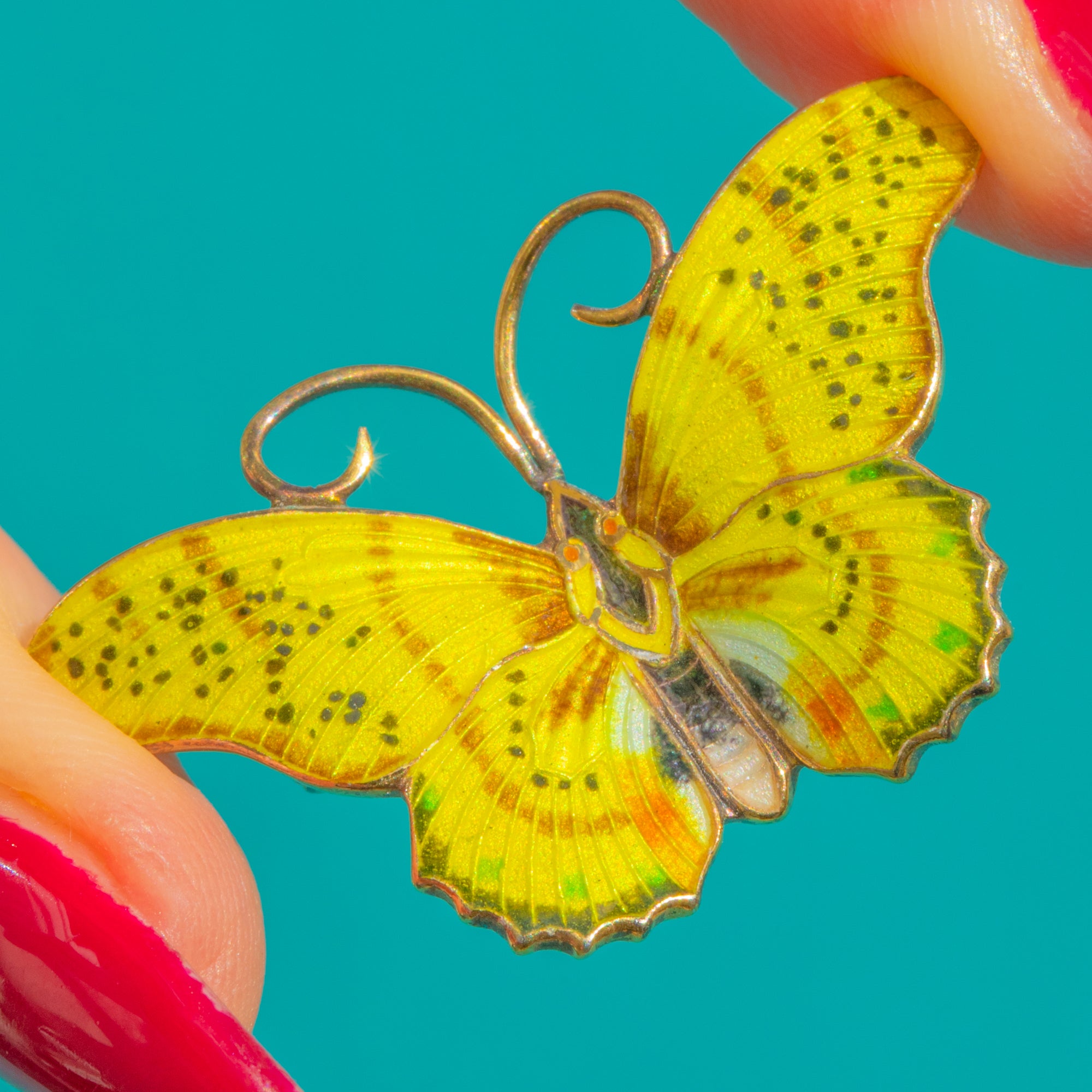 This joyous butterfly brooch captures the light with glossy Yellow Enamel wings delicately flecked with fine black speckling. The scalloped lower wings and radiating striations create beautiful movement and texture, while curled antennae add a charming, naturalistic flourish.