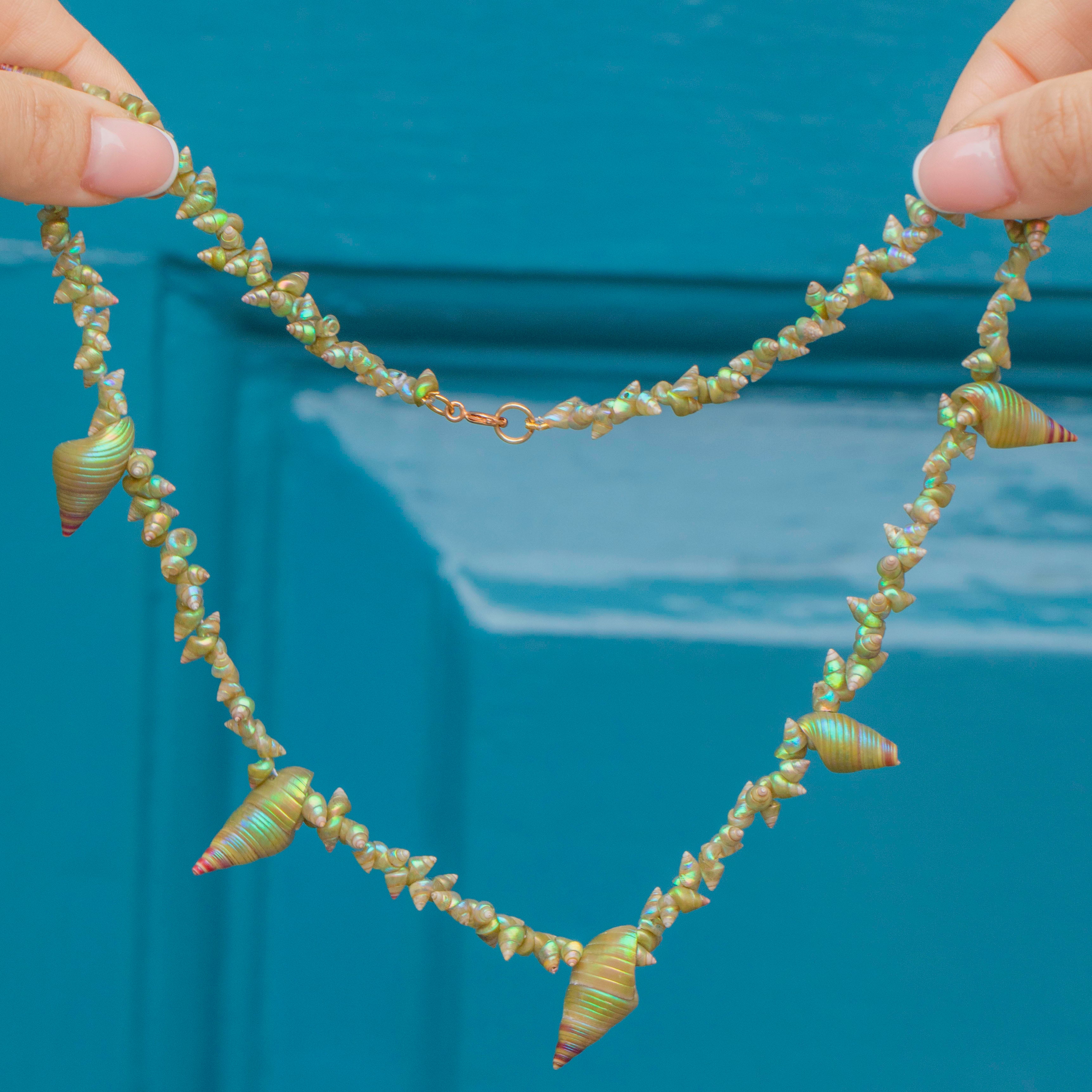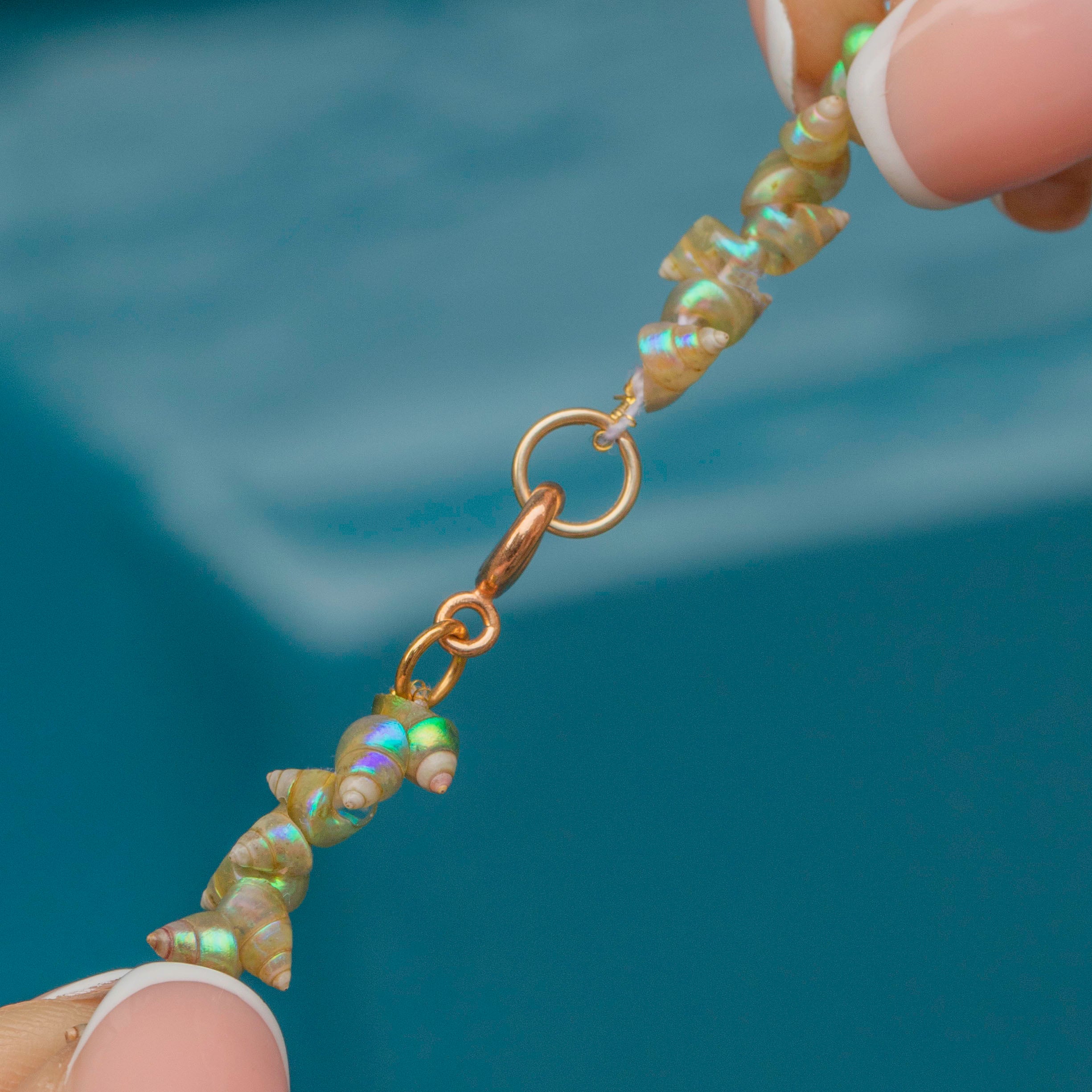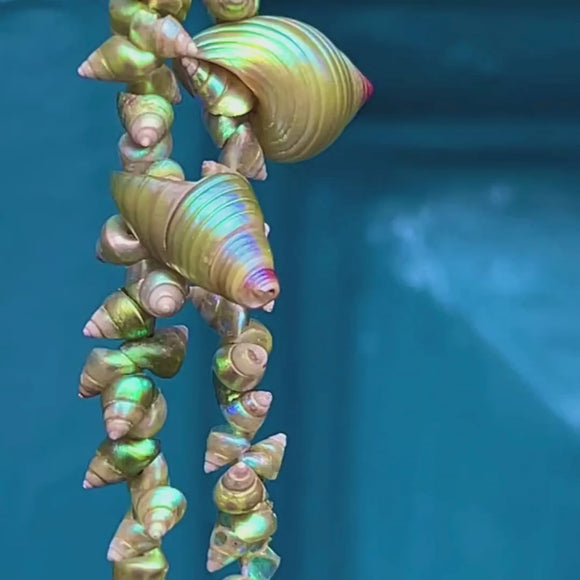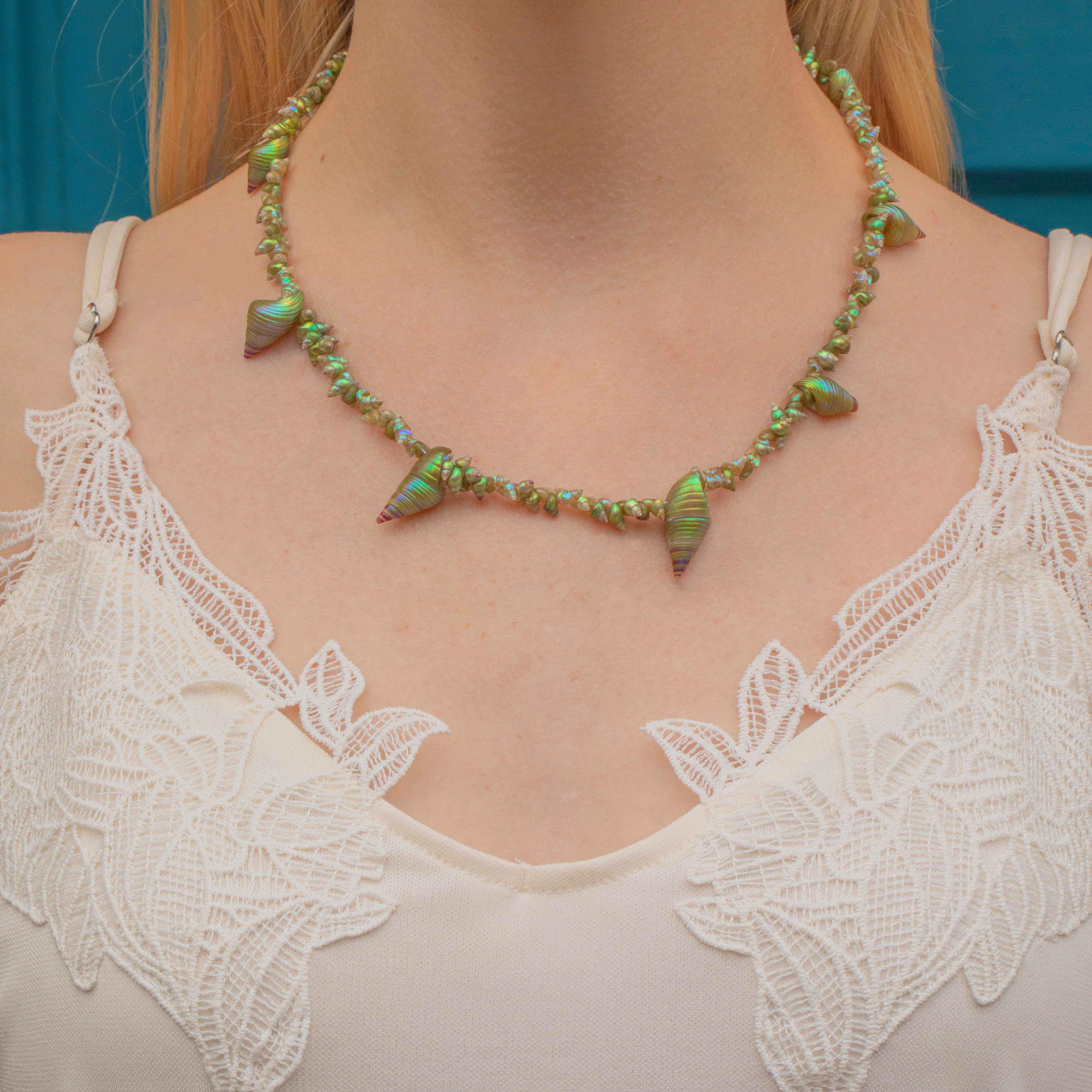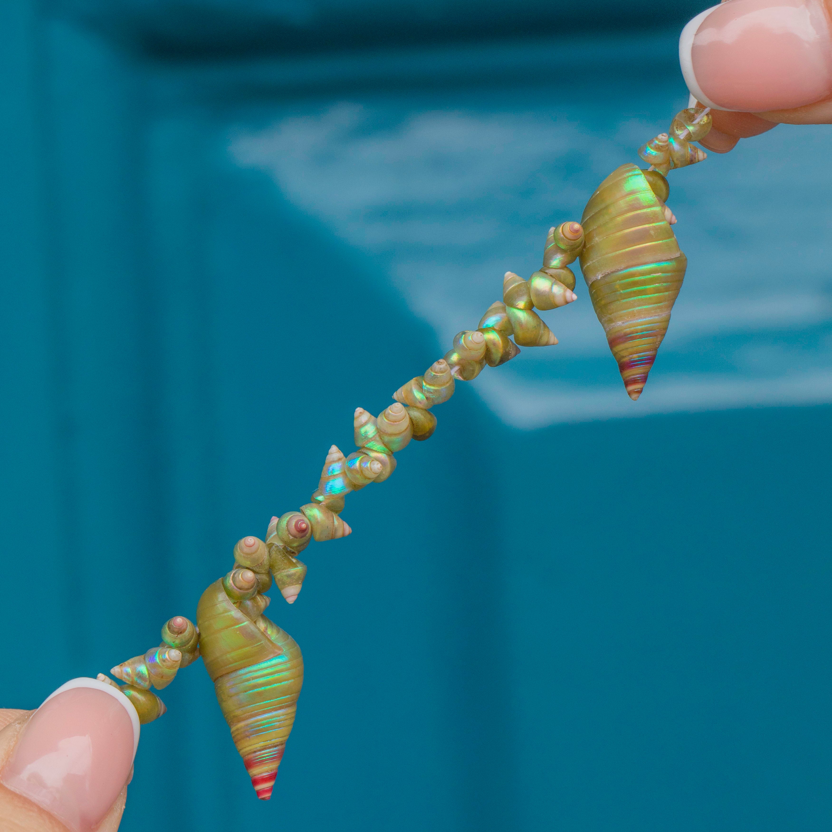 We are pleased to introduce this Tasmanian Green Marineer Shell necklace! Crafted many years ago by skilled artisans using delicate shells sourced exclusively from the Maireener species, this necklace embodies the rich cultural history and natural beauty of Tasmania. Akin to a piece from a fairytale, a treasure from under the sea, she exudes a magical allure like no other!