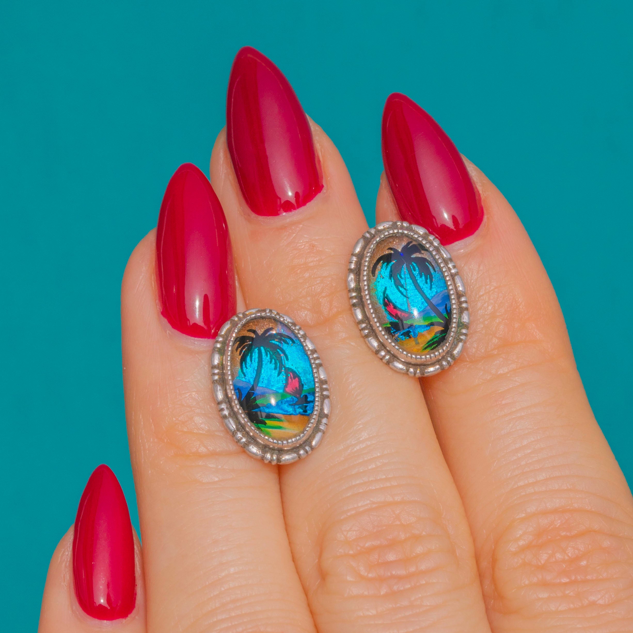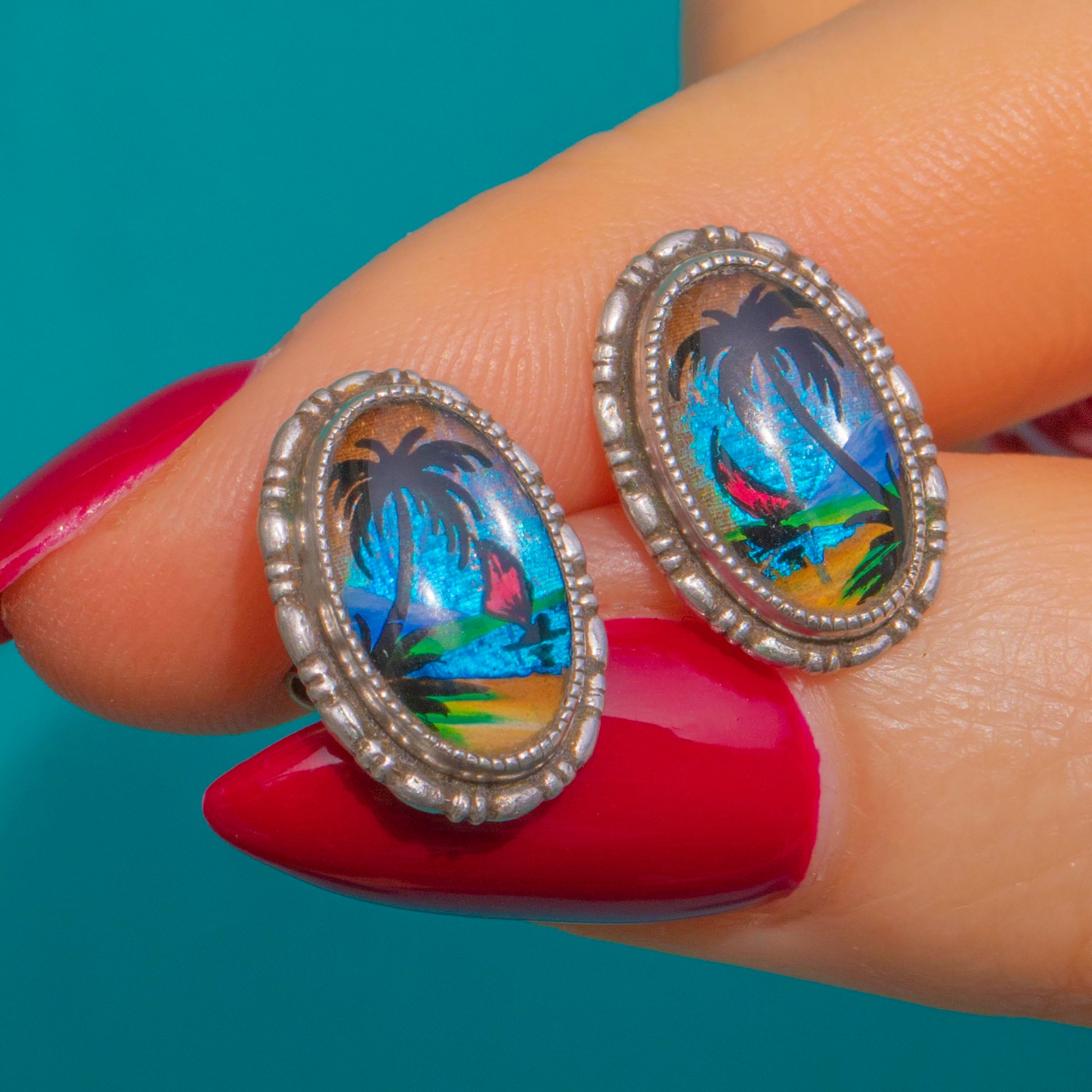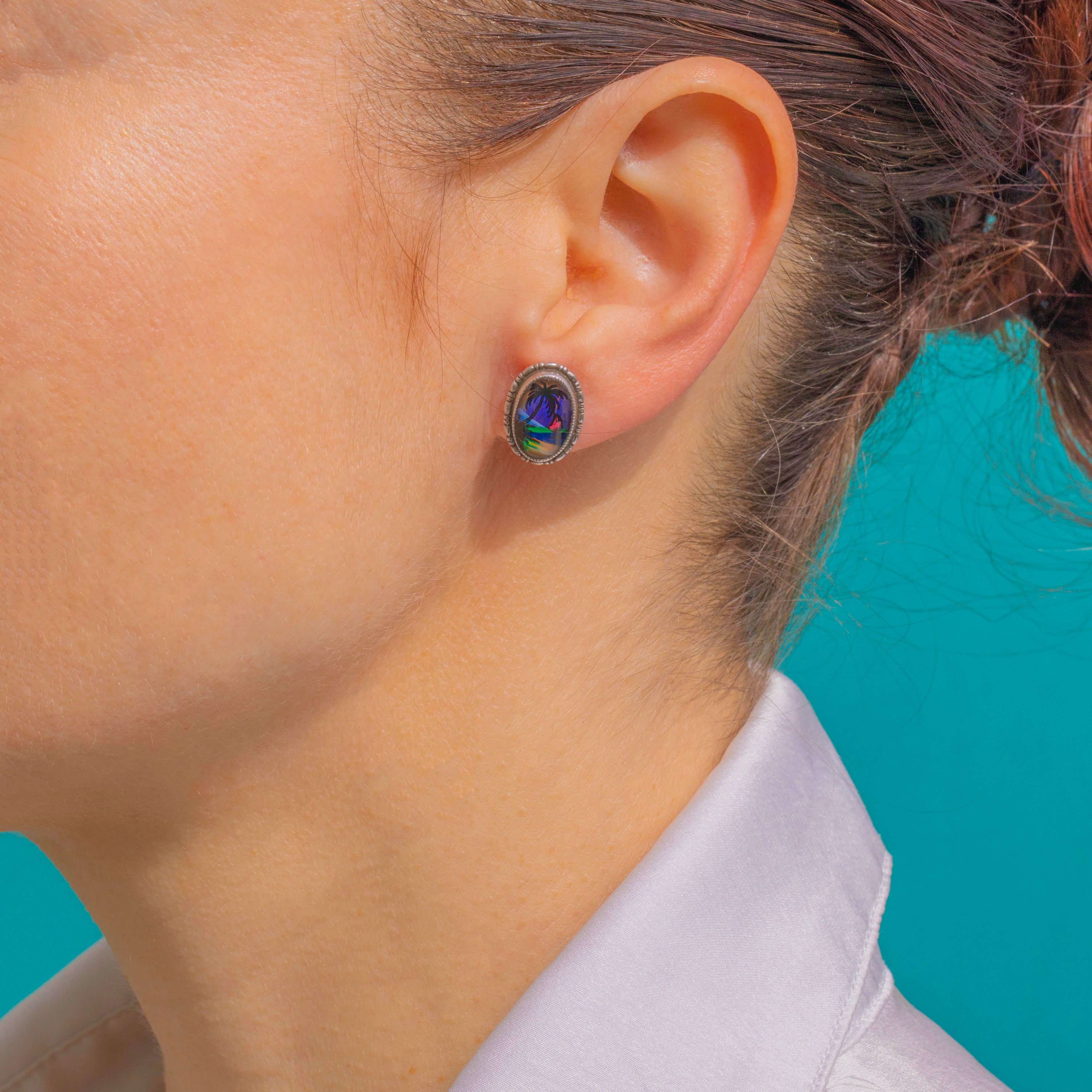 A joyful slice of the tropics from the Art Deco era, these petite Sterling Silver studs showcase a vibrant Morpho Butterfly Wing beneath a miniature silhouetted palm tree and shoreline. The iridescence shimmers with blues, purples and greens, creating a magical seascape effect that changes with the light.