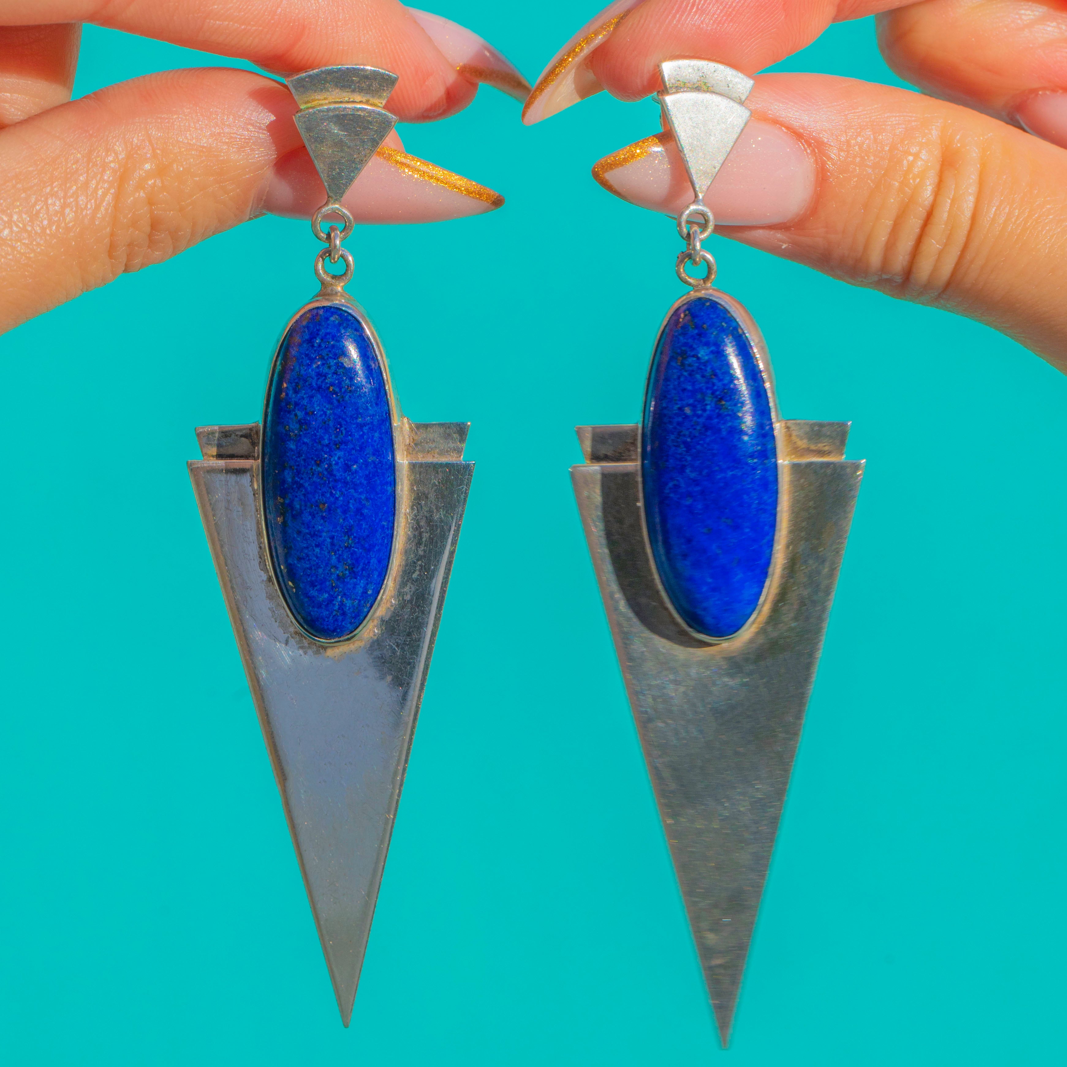 These incredible Van Peterson modernist earrings are a bold statement in sculptural Silver and vivid blue Lapis Lazuli. Crafted in the late 20th century, their sharp geometric silhouettes and elongated drops embody the sleek, architectural glamour the brand is known for.