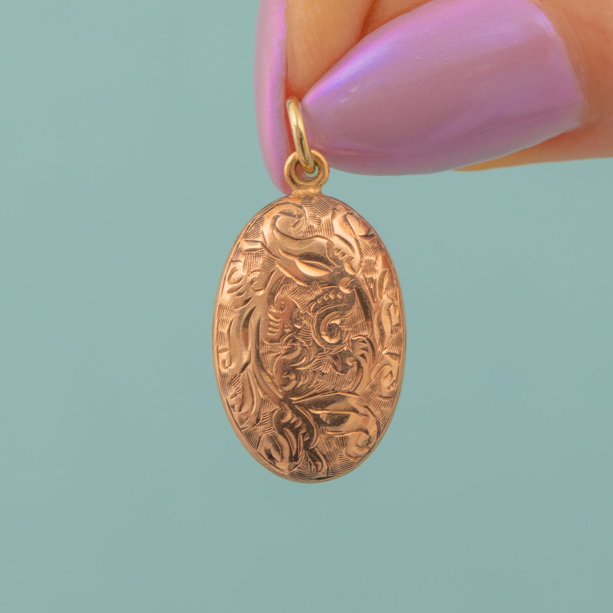 Crafted from warm, rosy-hued 10ct Gold, this oval pendant is lightweight and versatile - perfect for adding to a chain or bracelet. She is adorned with Baroque-style engravings on her front, providing ample texture and depth.