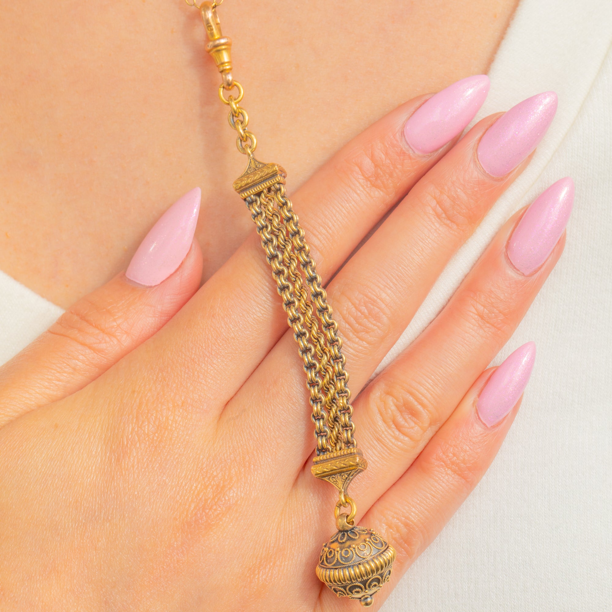 Opulent and romantic, this Victorian 15ct Gold cannetille orb fob captivates with its airy openwork and intricate beaded-wire detail. The spherical “orb” is richly adorned with fine granulation-style accents and architectural banding, its warm patina deepening the sculptural relief.