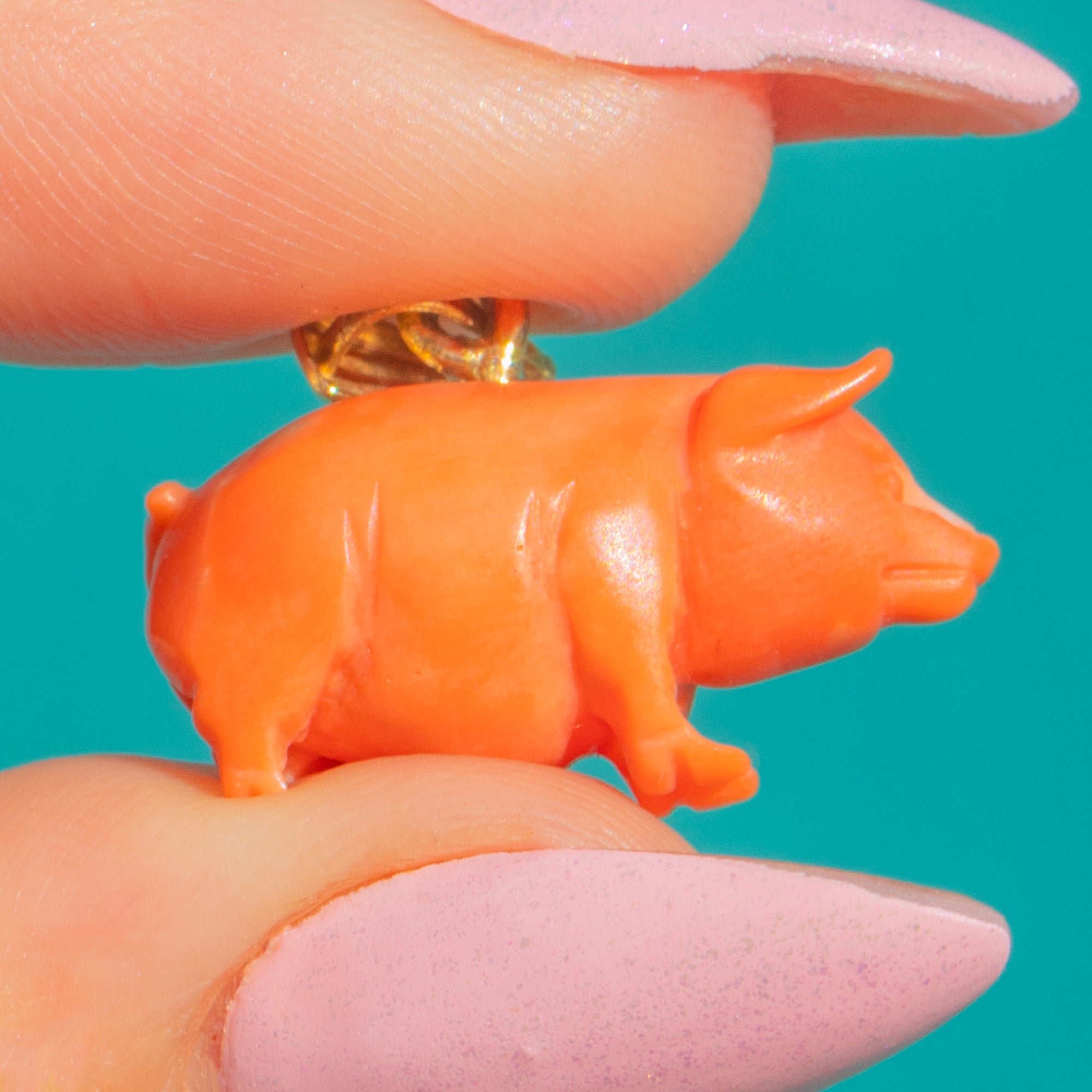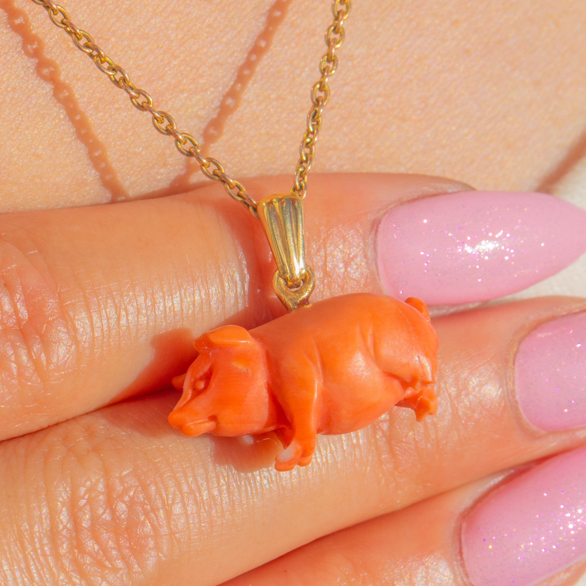 A joyful Victorian novelty, this charming pig has been finely carved in natural Coral and mounted with a 15ct Gold bail. Sculpted fully in the round with a plump silhouette, the piece is polished to a soft sheen with neatly incised ears, snout, legs and a sweet little tail—tactile, characterful and instantly endearing.