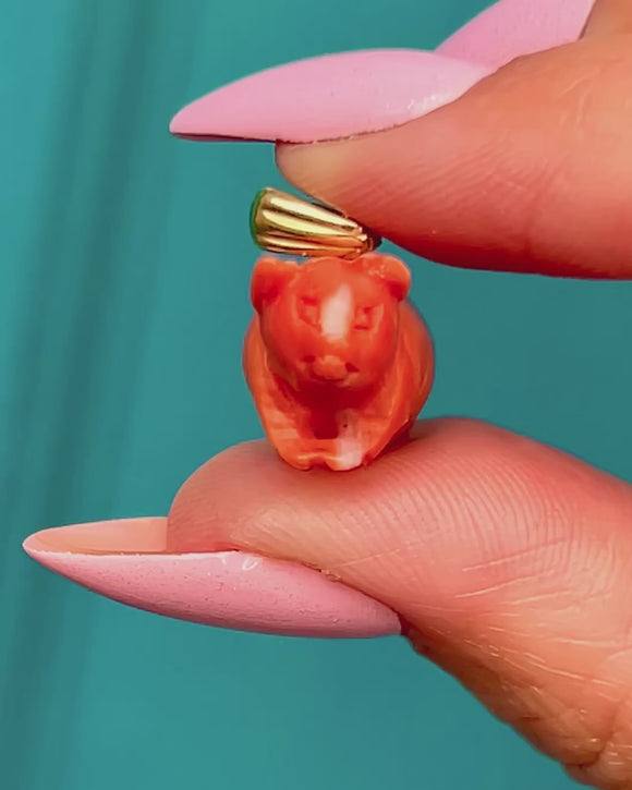 EXCELLENT: The Coral carving presents beautifully with a glossy polish and crisp detail; only the faintest abrasions to high points are seen under close inspection, with no visible cracks. The 15ct Gold bail is secure with a bright finish and minimal surface wear.