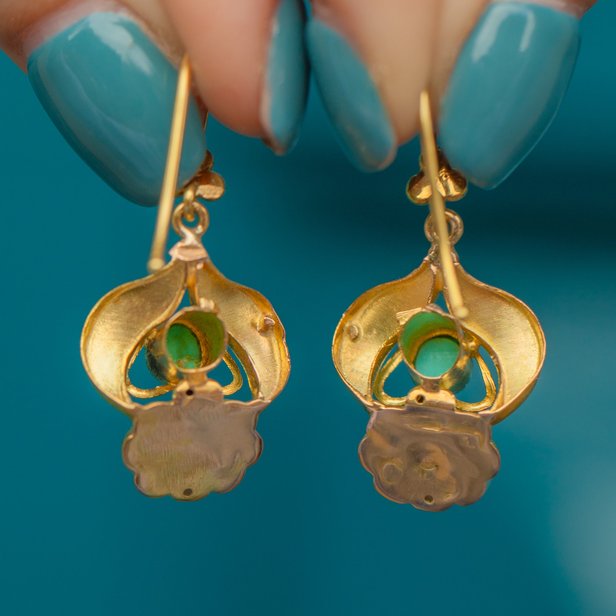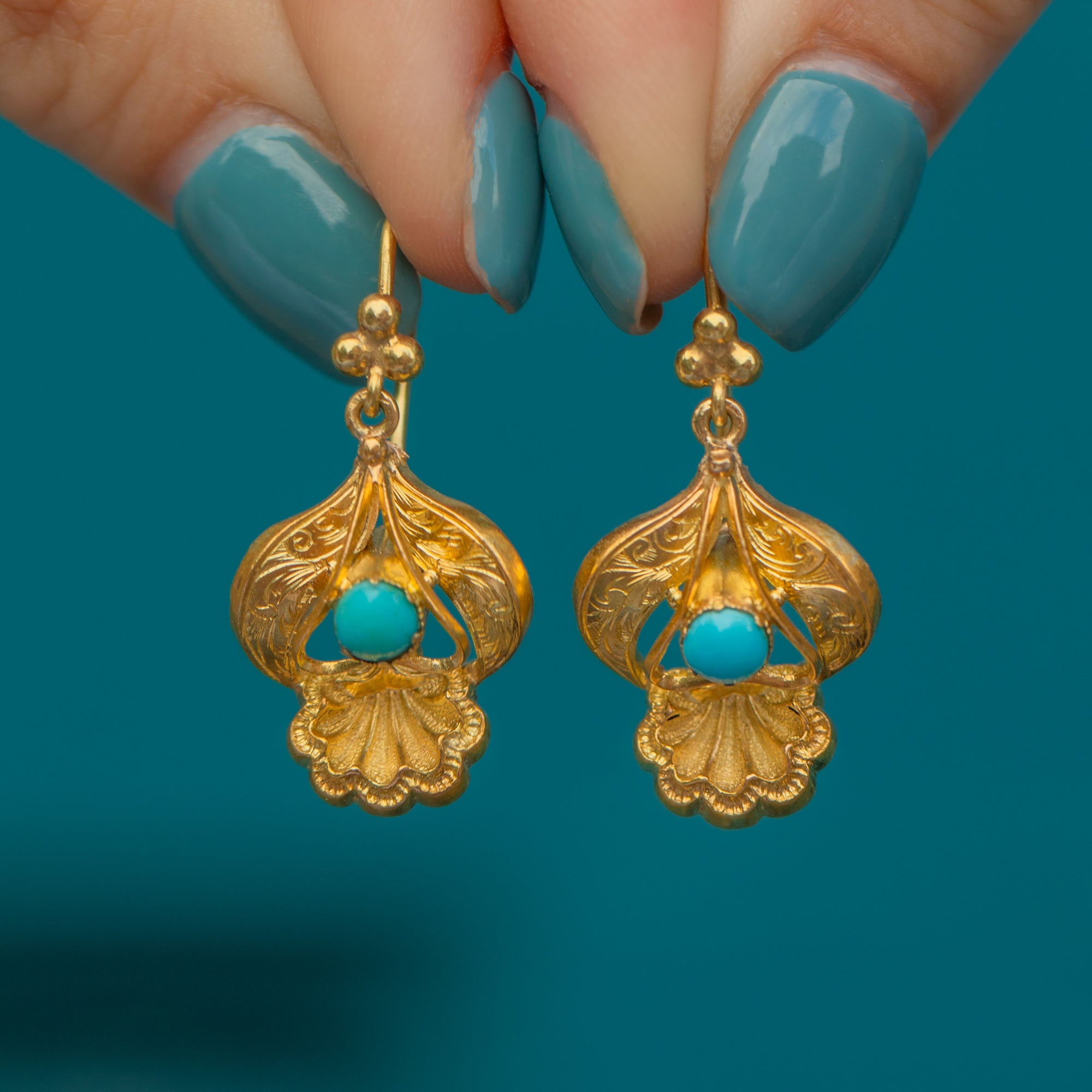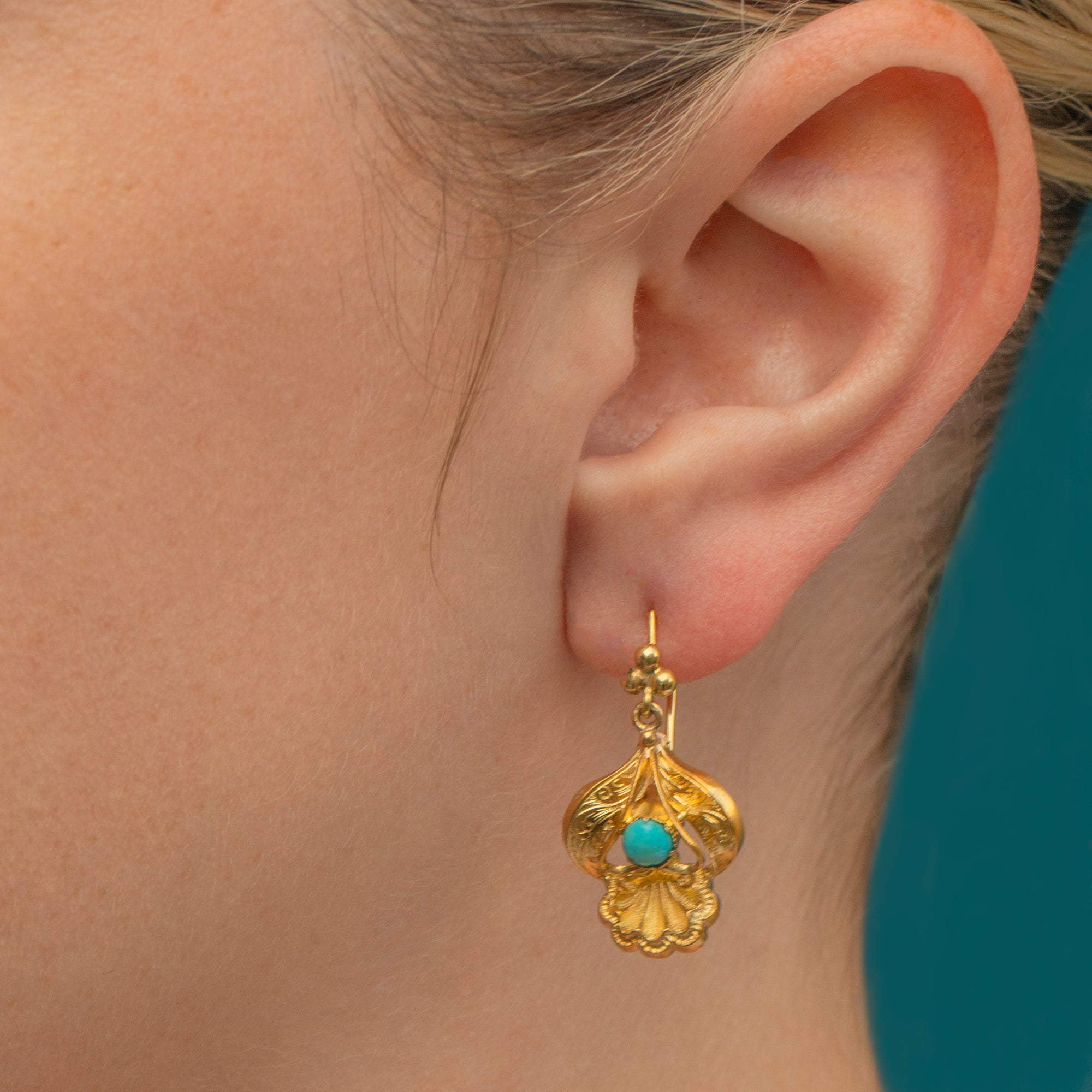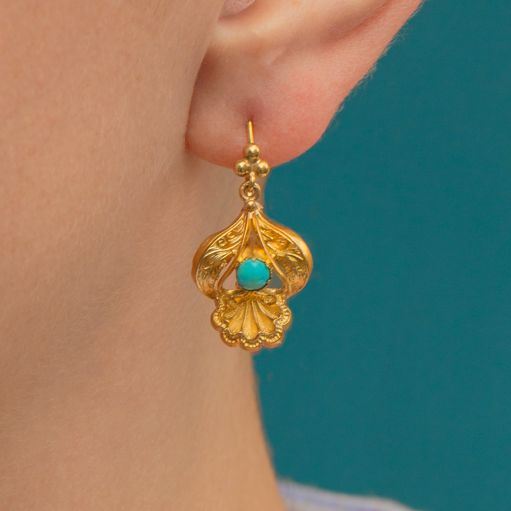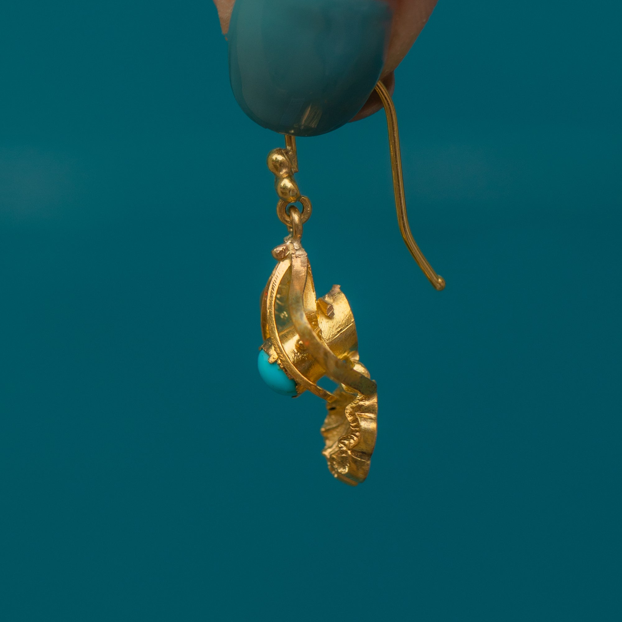 Victorian 15ct Gold Scallop-Shell Turquoise Earrings