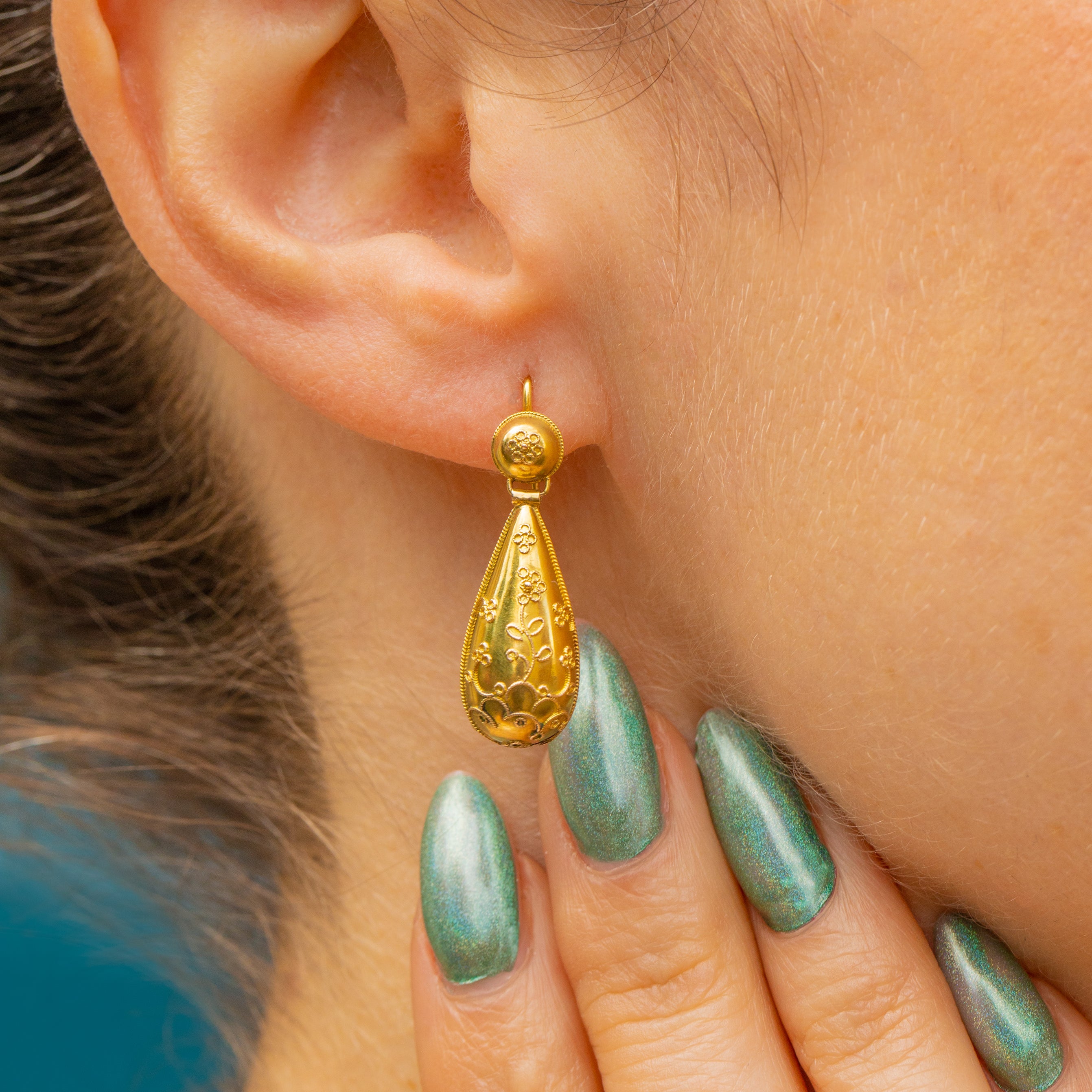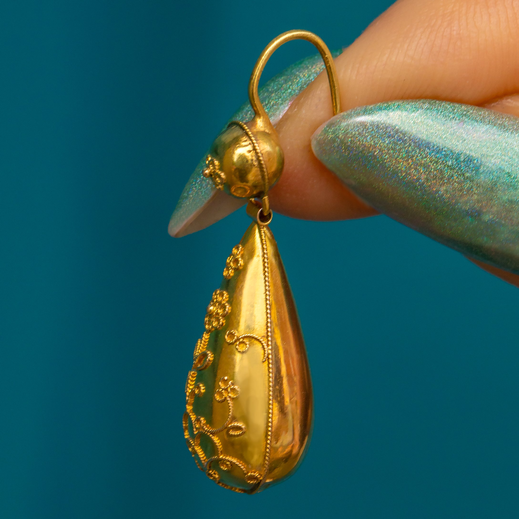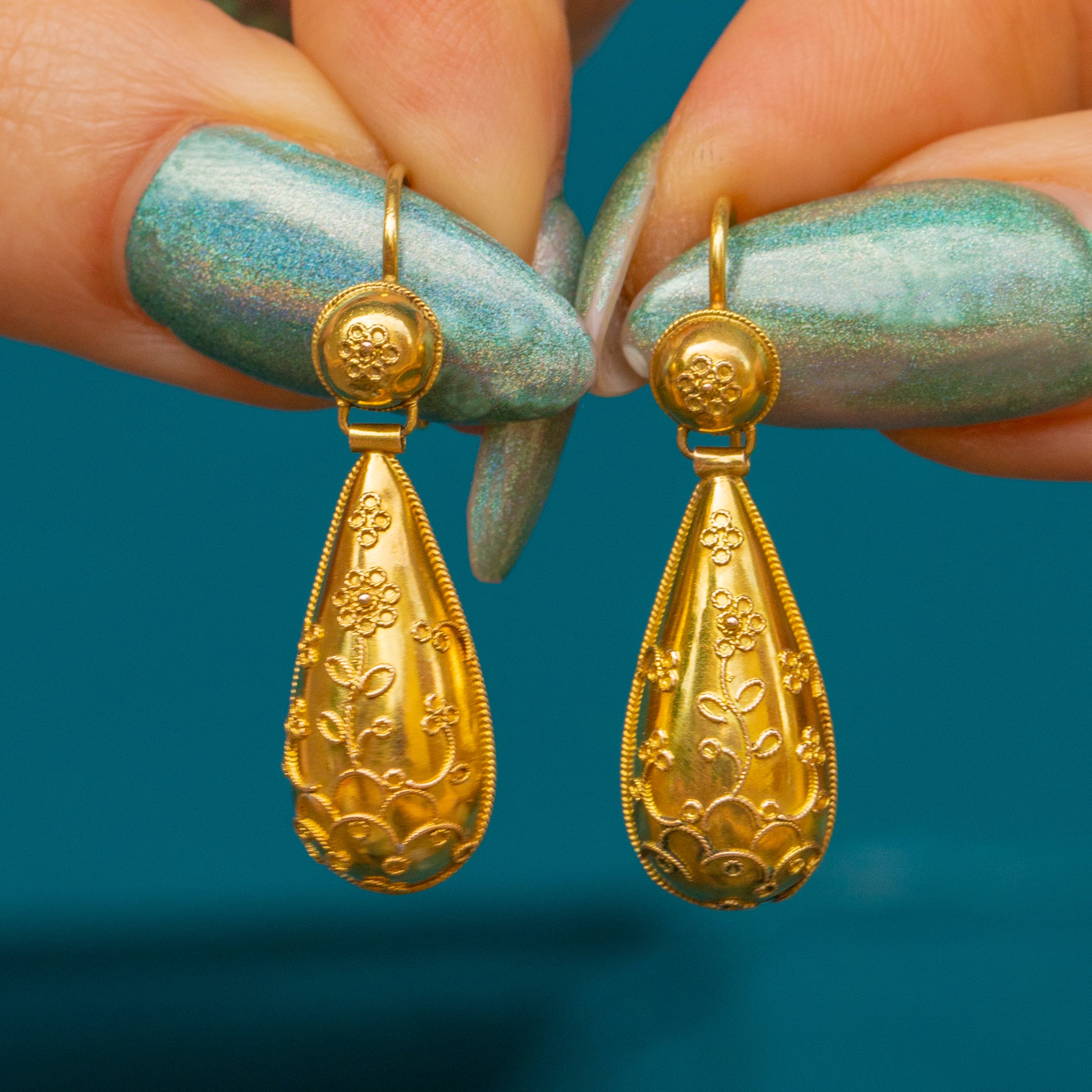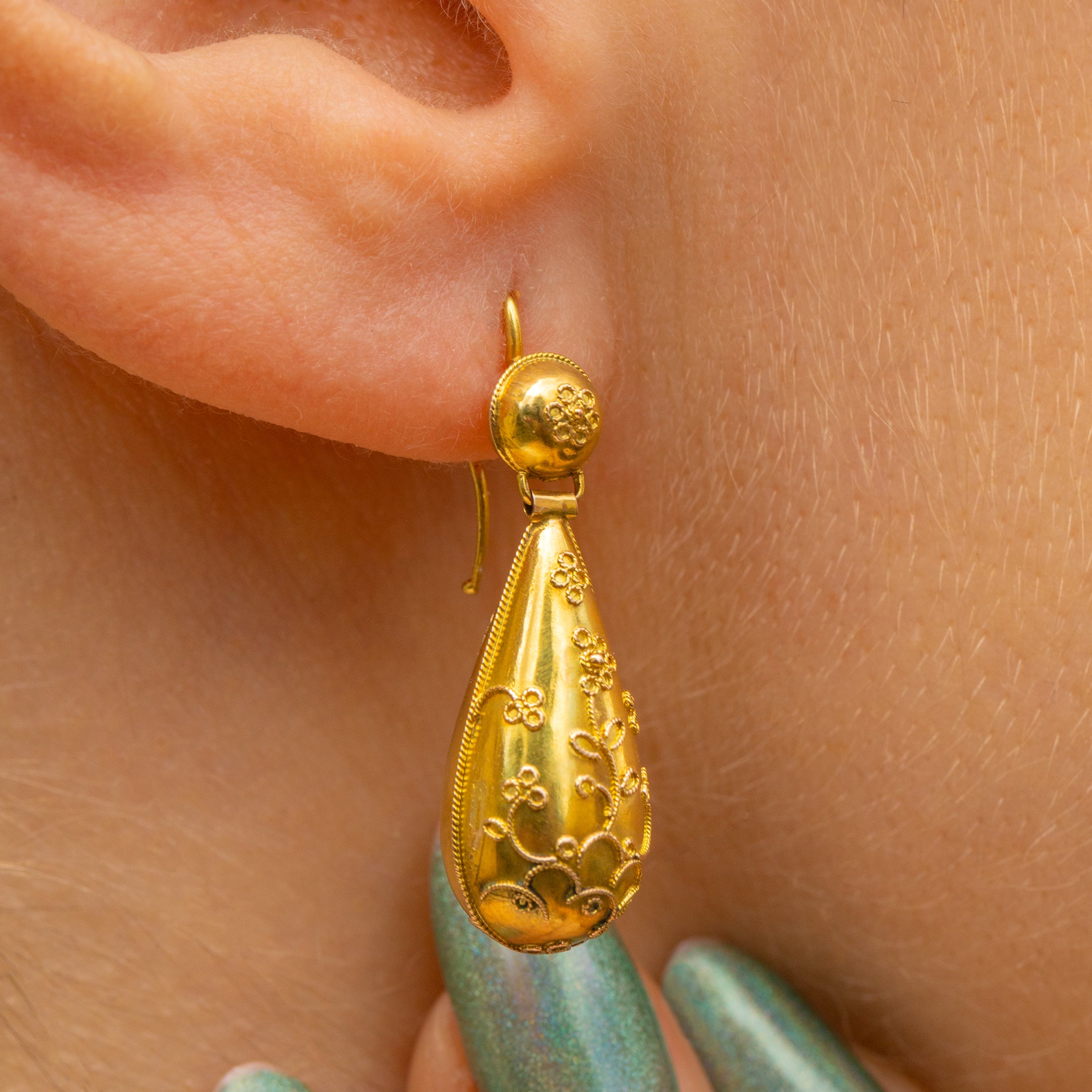 Enjoy the sophistication of these Victorian 15ct Gold floral torpedo drop earrings as they suspend from your lobes! Their torpedo drops are laced with delicate cannetille floral details and their plump form creates a statement as they adorn your ears.