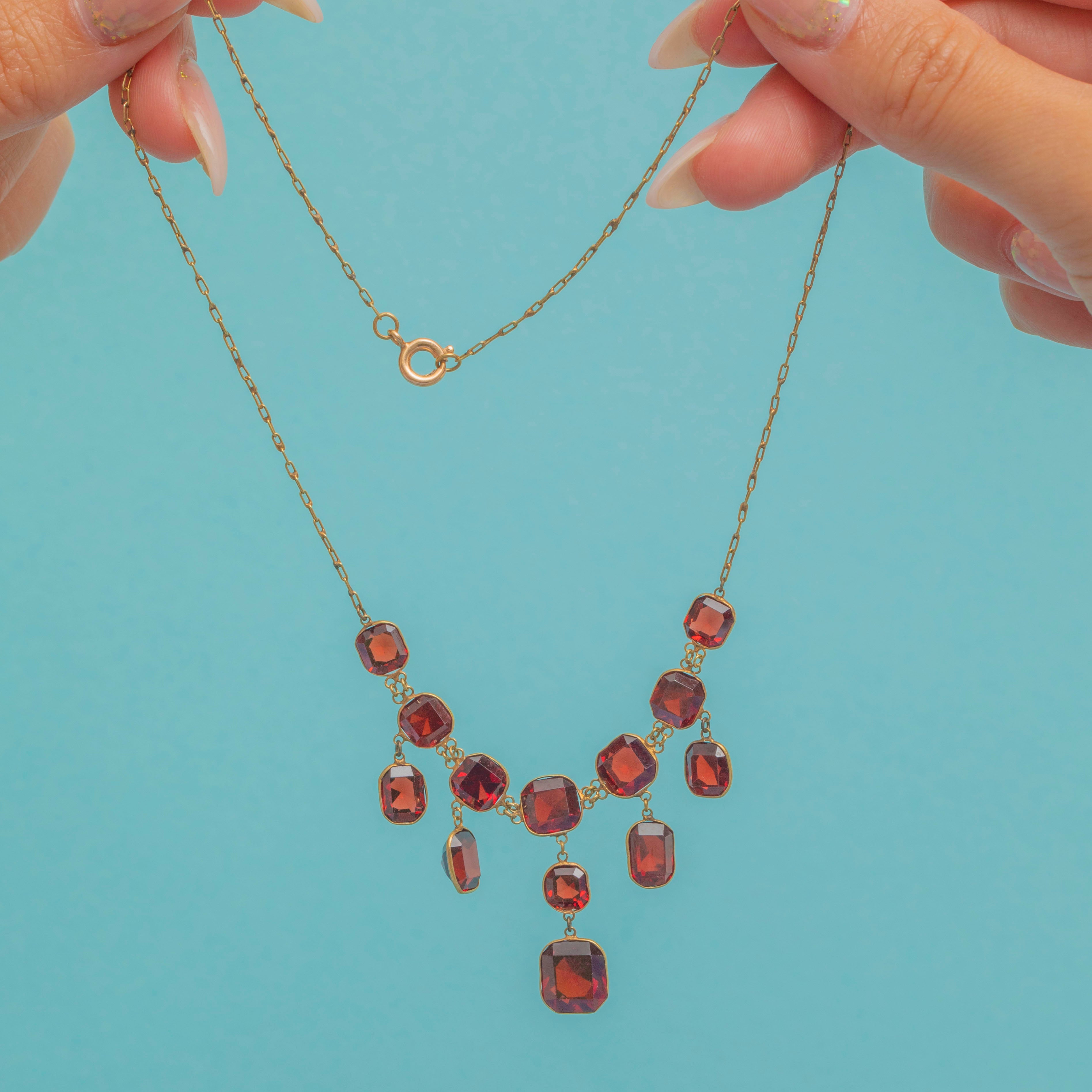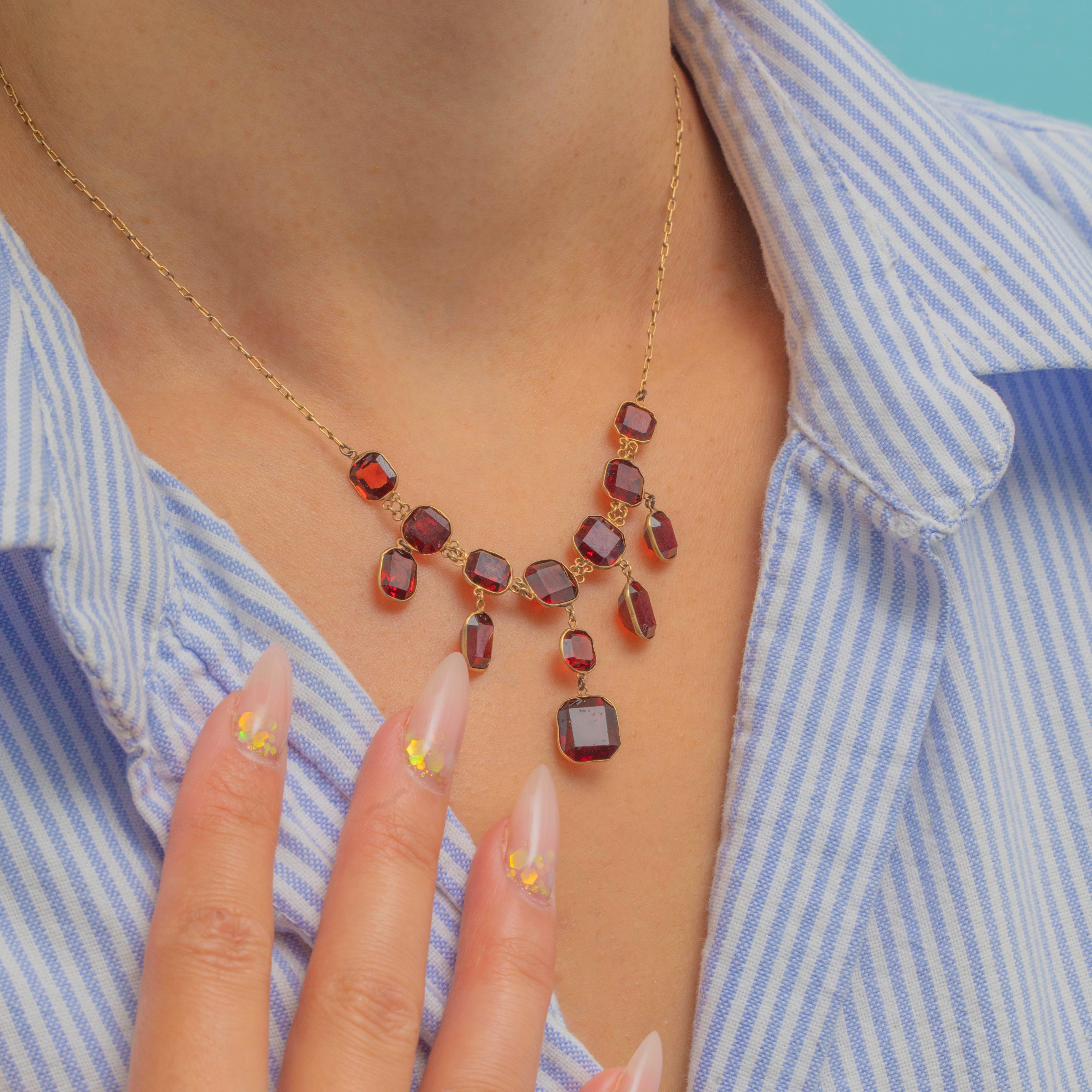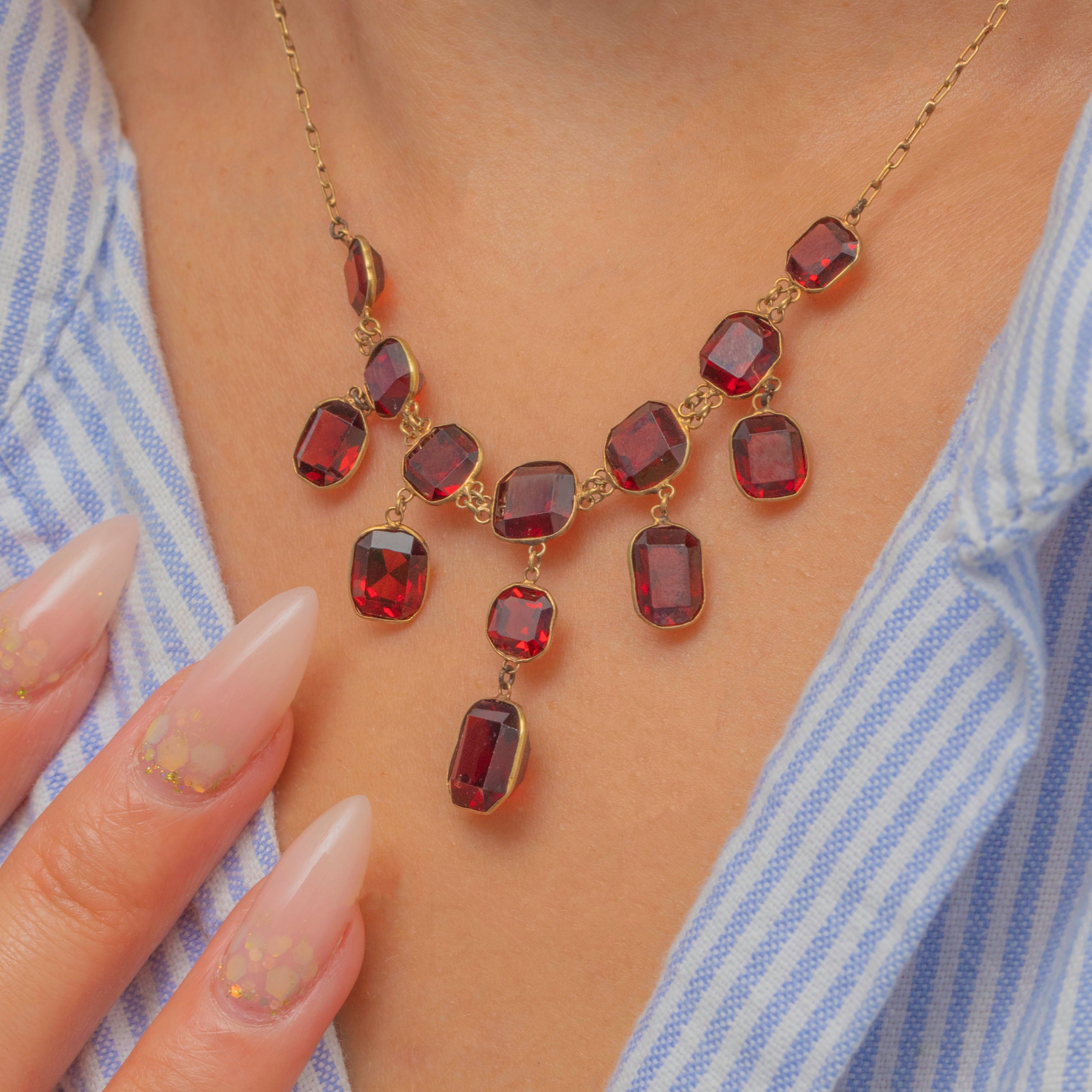 This exquisite Victorian necklace is a drop of rich Garnets, graduating in size to form a glowing river of deep red around the neckline. Crafted in 15ct Gold, the vibrant faceted stones catch the light beautifully, radiating warmth and elegance.