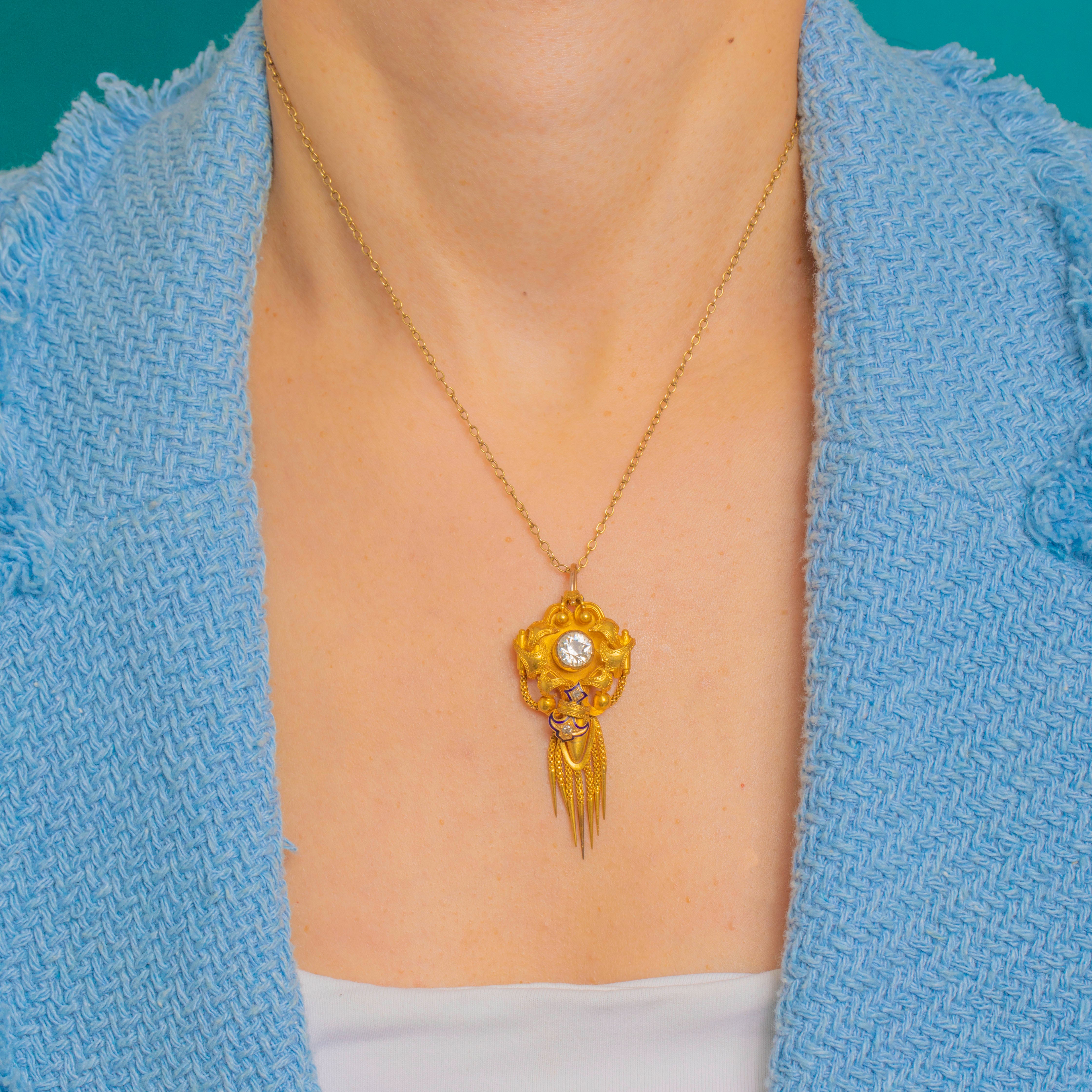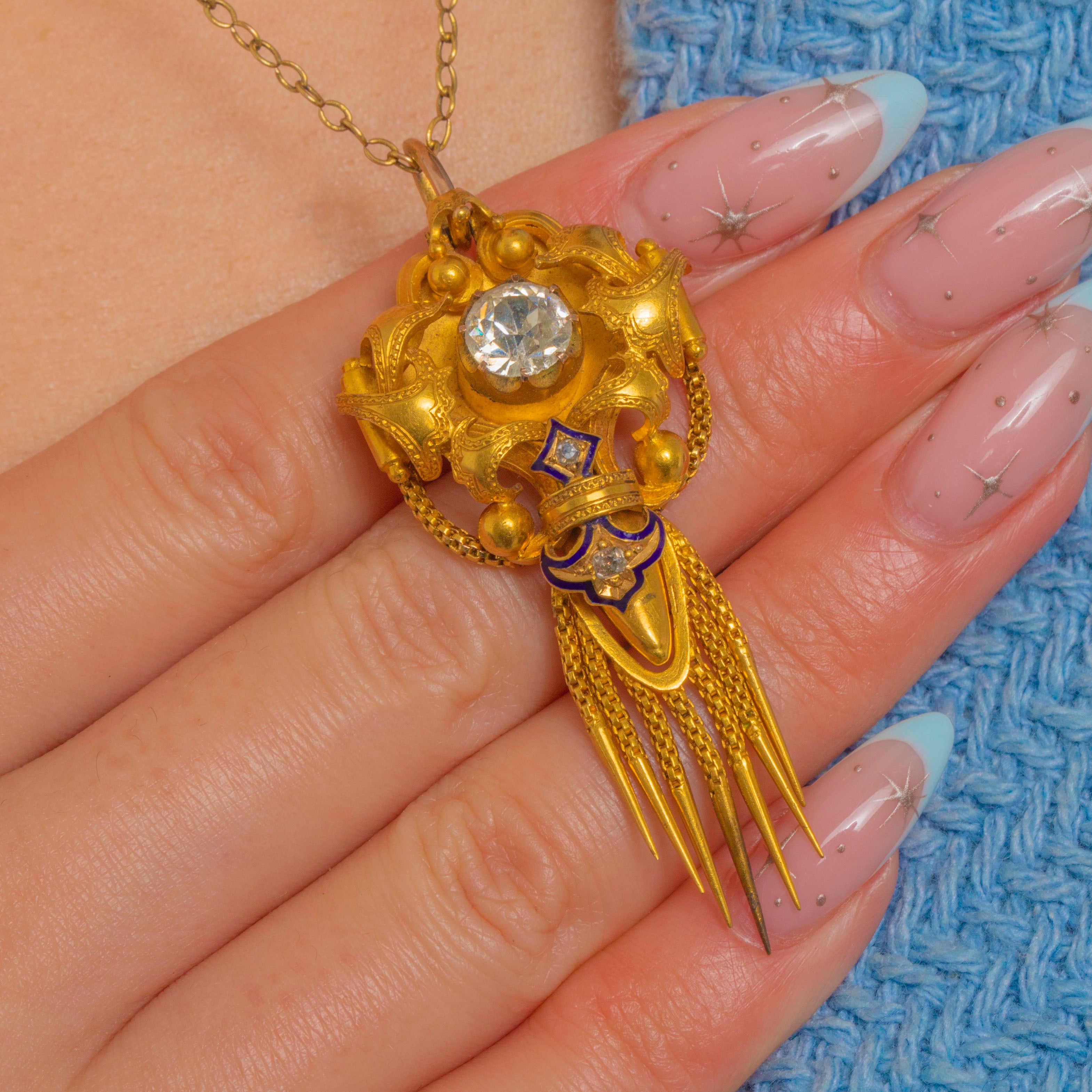 Sumptuous Victorian design meets Archaeological Revival allure in this exquisite antique pendant, crafted in richly hued 18ct Gold and accented with deep cobalt-blue Enamel. The sculptural, multi-part silhouette is centred by a raised round Rock Crystal in a high collet, framed by applied bead “granulation” and elegant scrolls. A lively articulated fringe of fine fox chain tassels with conical drops lends movement and drama, while a petite chain swag and star detail add a charming, classical touch.