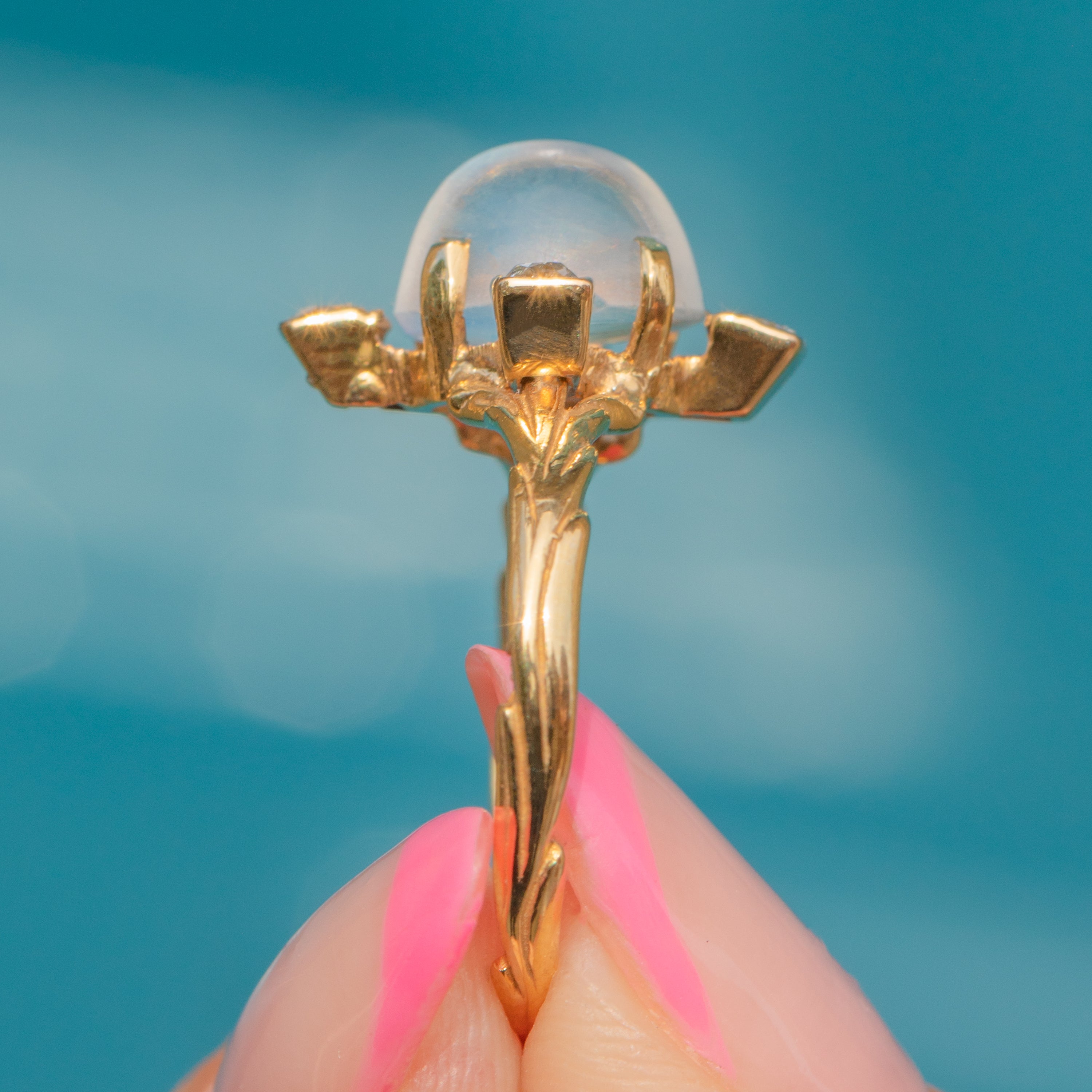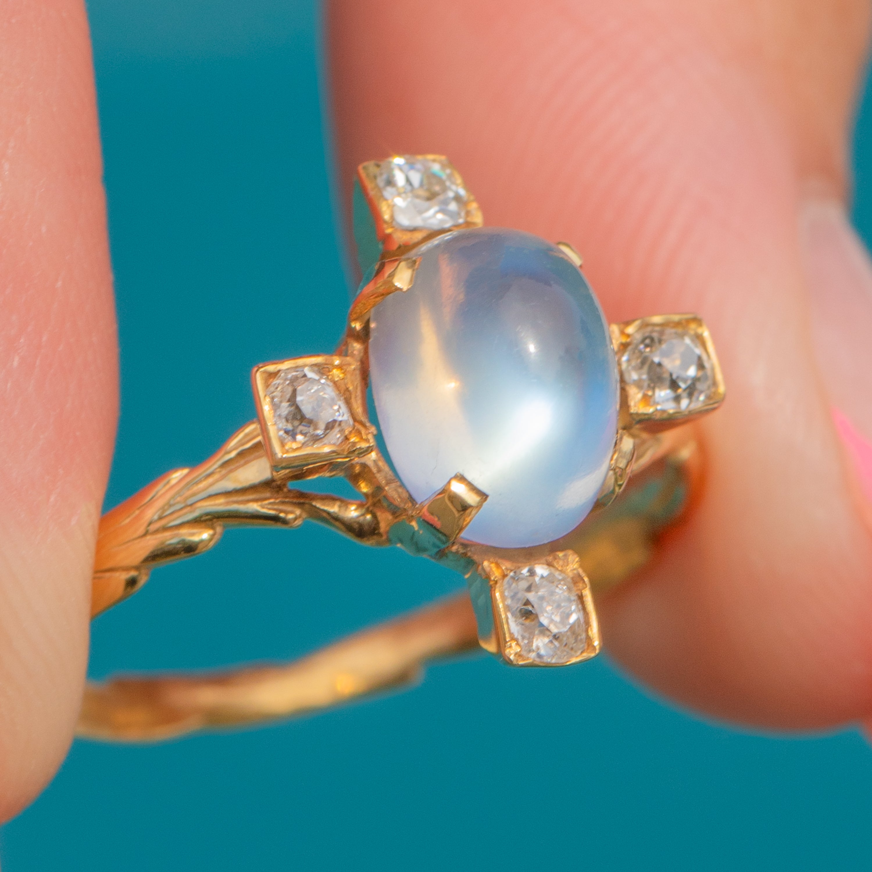 The 1.92ct Moonstone cabochon has an impressively high dome, revealing a spectacular silver adularescence, for which Ceylon Moonstones are so desired, as it moves in the light. The Moonstone is haloed by four old-mine-cut Diamonds, with a combined 0.28ct weight, adding a bright, scintillating accent to this spectacular Victorian ring!