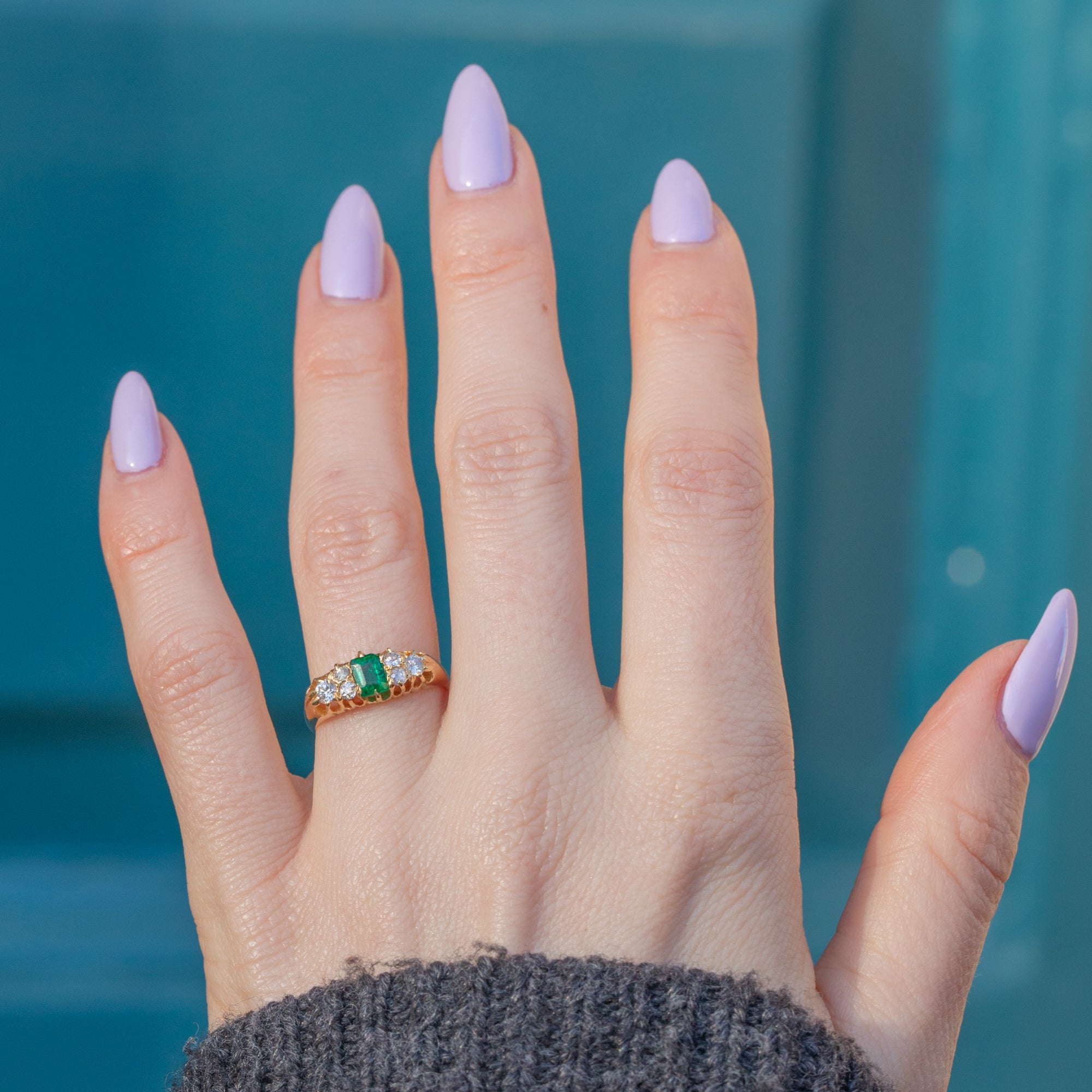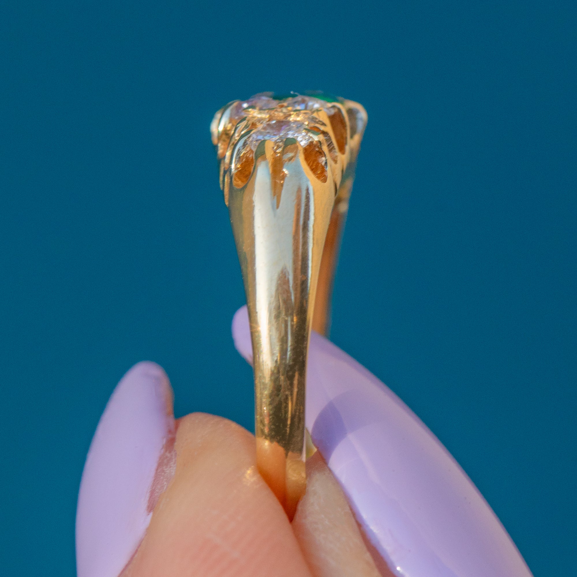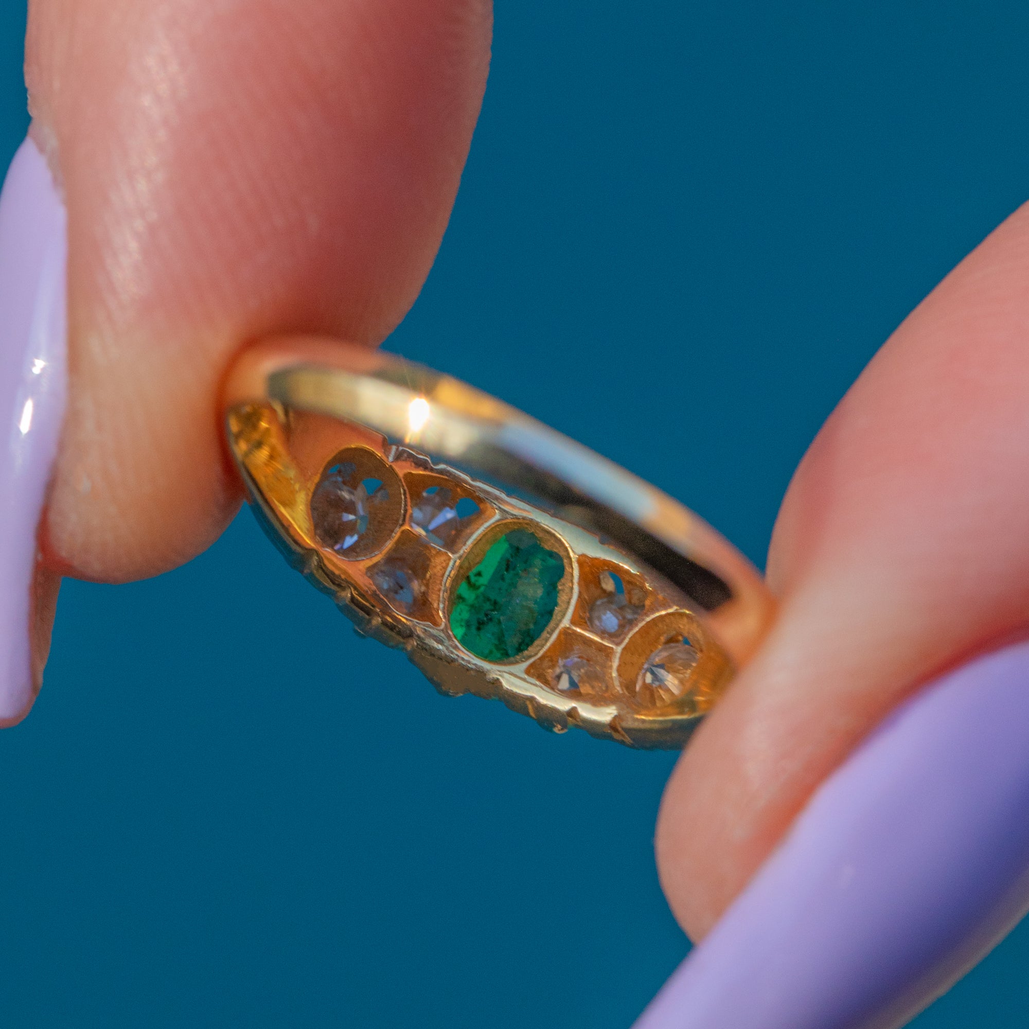 Comprised of seven gorgeous gemstones, this antique 18ct Gold ring boasts a vivid green Emerald in her centre adorned by six twinkling Diamonds, each scintillating brightly.