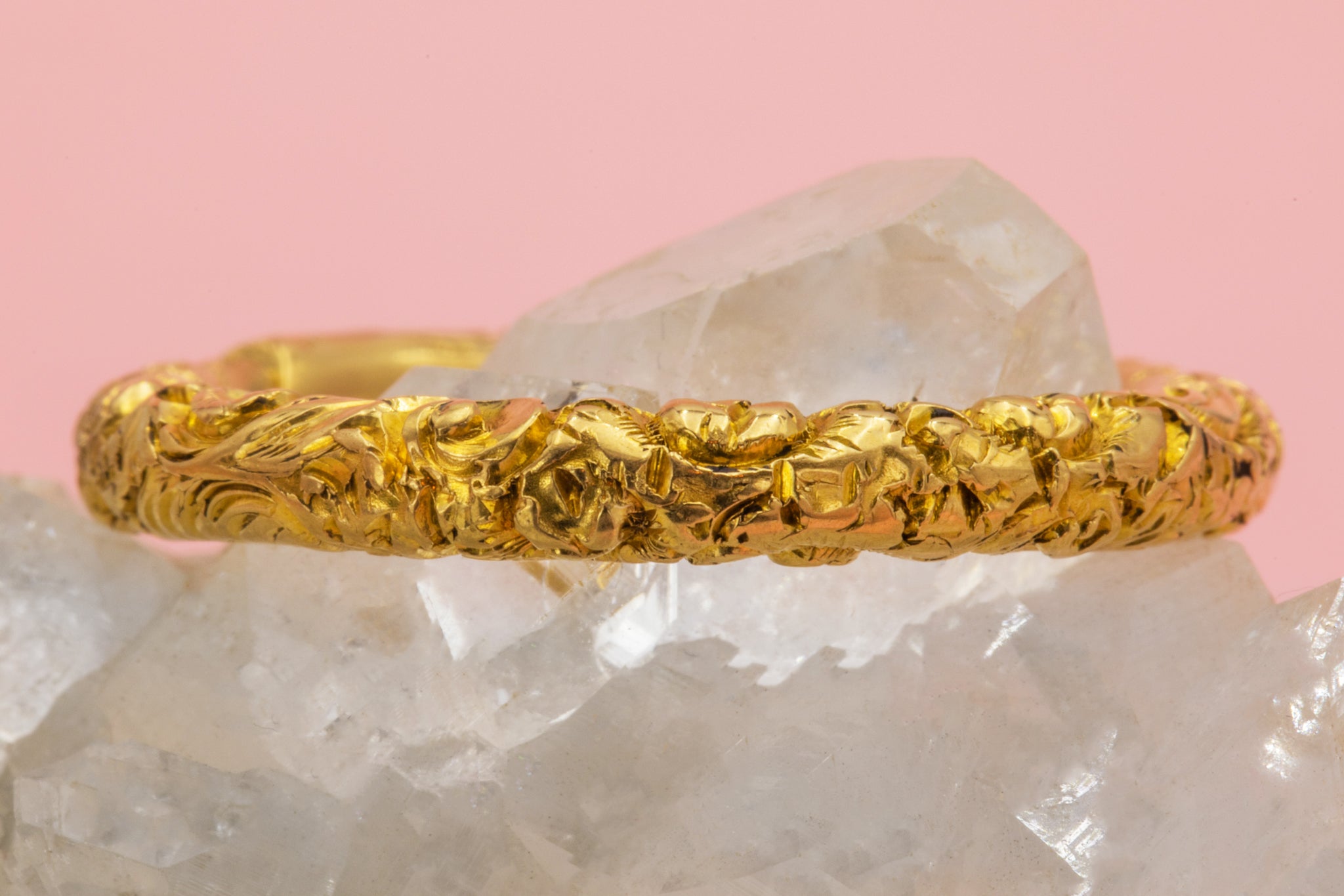 This incredible Victorian 18ct Gold engraved split-ring, weighing an impressive 10.3 grams, possesses a saturated sunshine hue and boasts gorgeous deeply grooved engravings and a wonderful texture throughout.