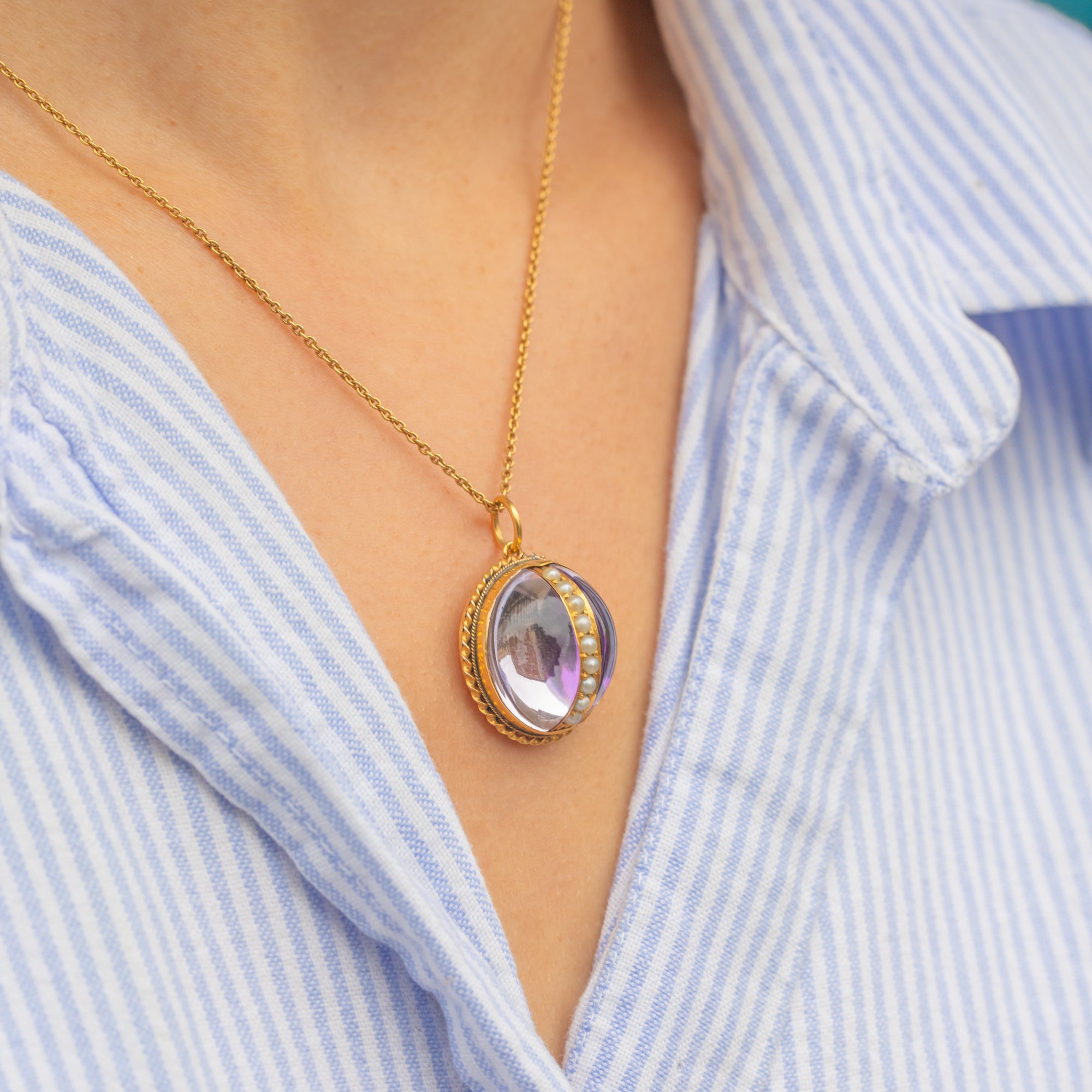 EXCELLENT: The pendant is in superb condition. The Quartz is securely set, with foil backing intact and facets crisp. The Pearl is smooth and well-matched, and the Gold mount is strong and polished. A beautifully preserved Victorian jewel.