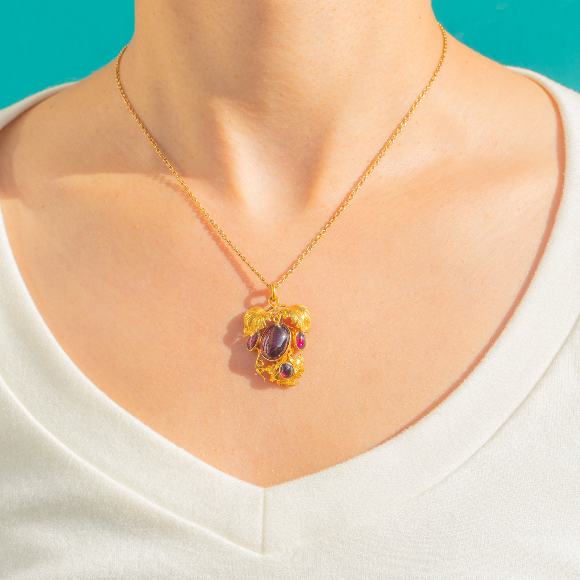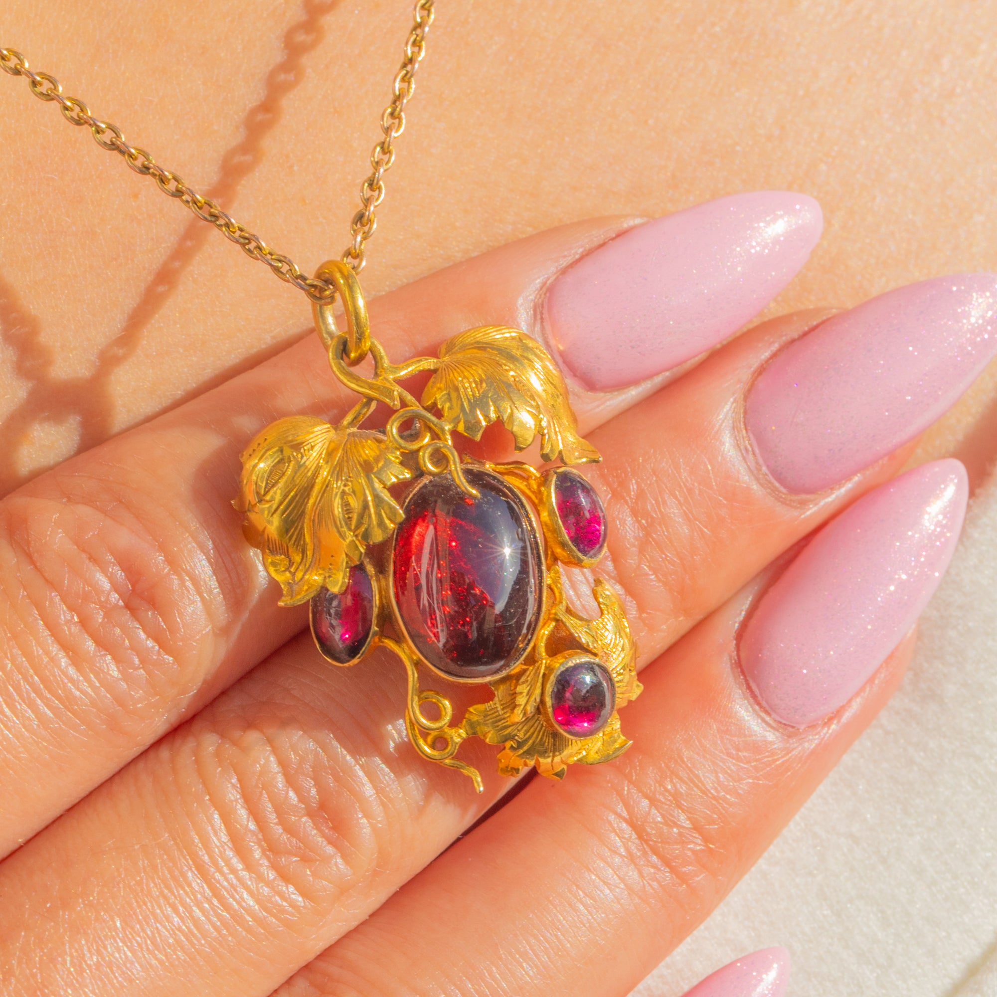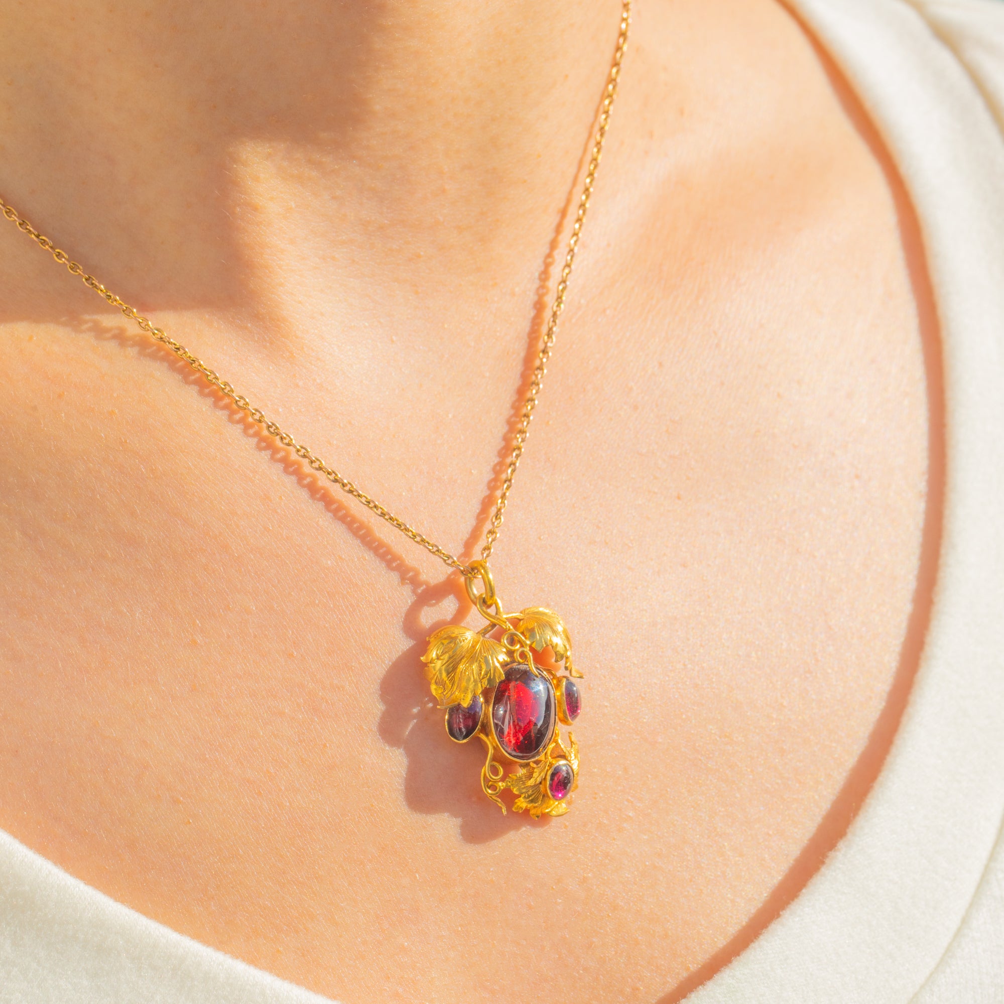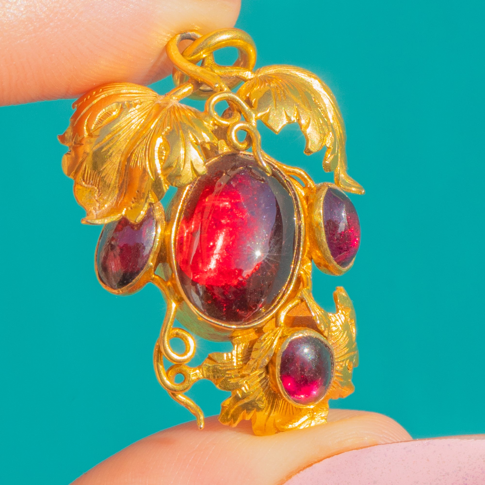 A sumptuous Victorian pendant in rich 18ct Gold, modelled as a romantic bunch of grapes entwined with foliate scrolls. The sculptural leaves and tendrils are hand‑finished with delicate chasing, embracing smooth Garnet cabochons that glow from deep red to purplish crimson.