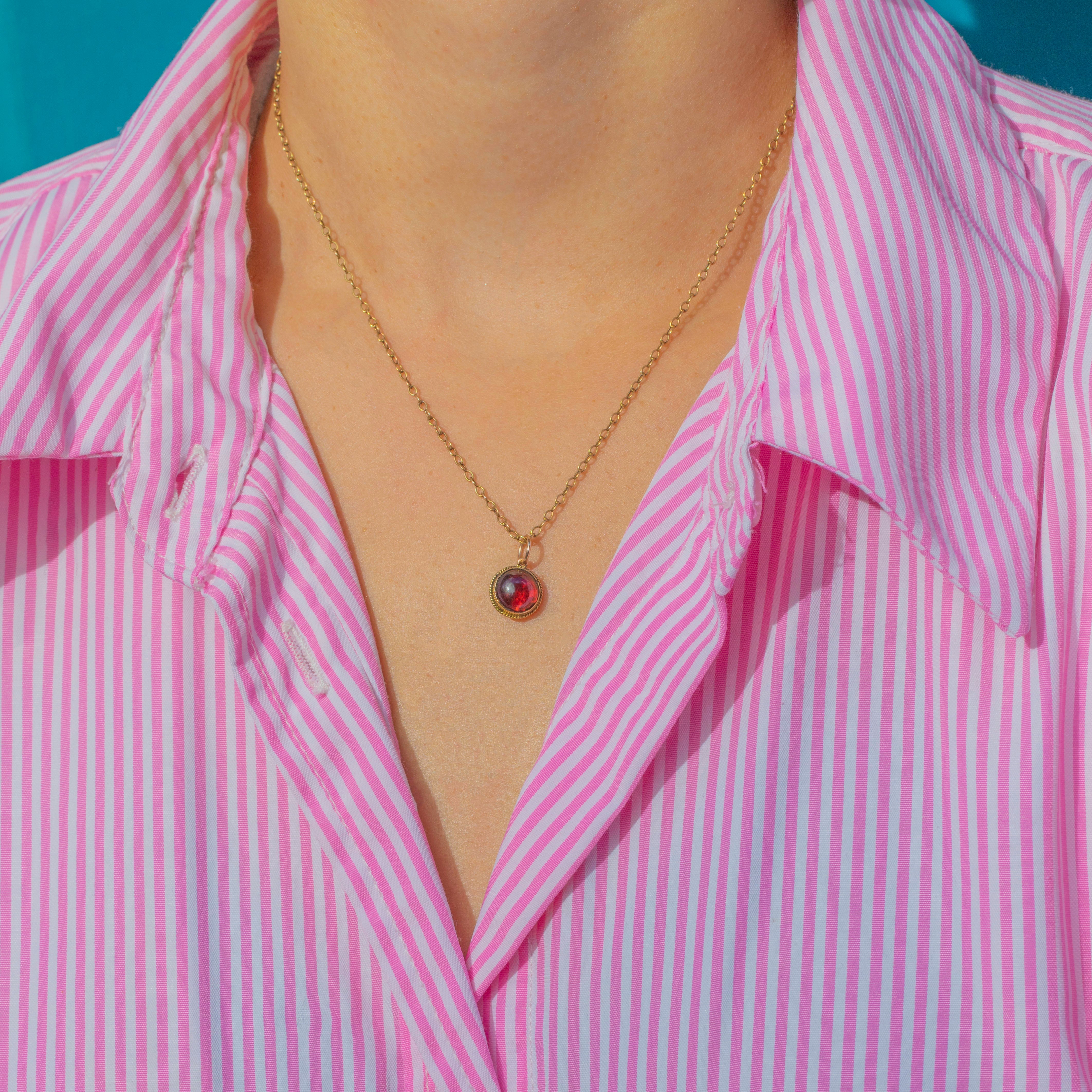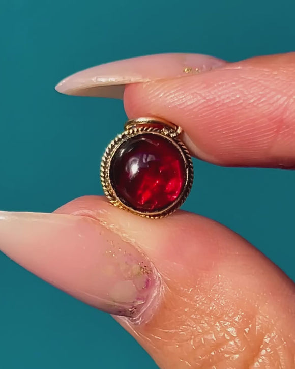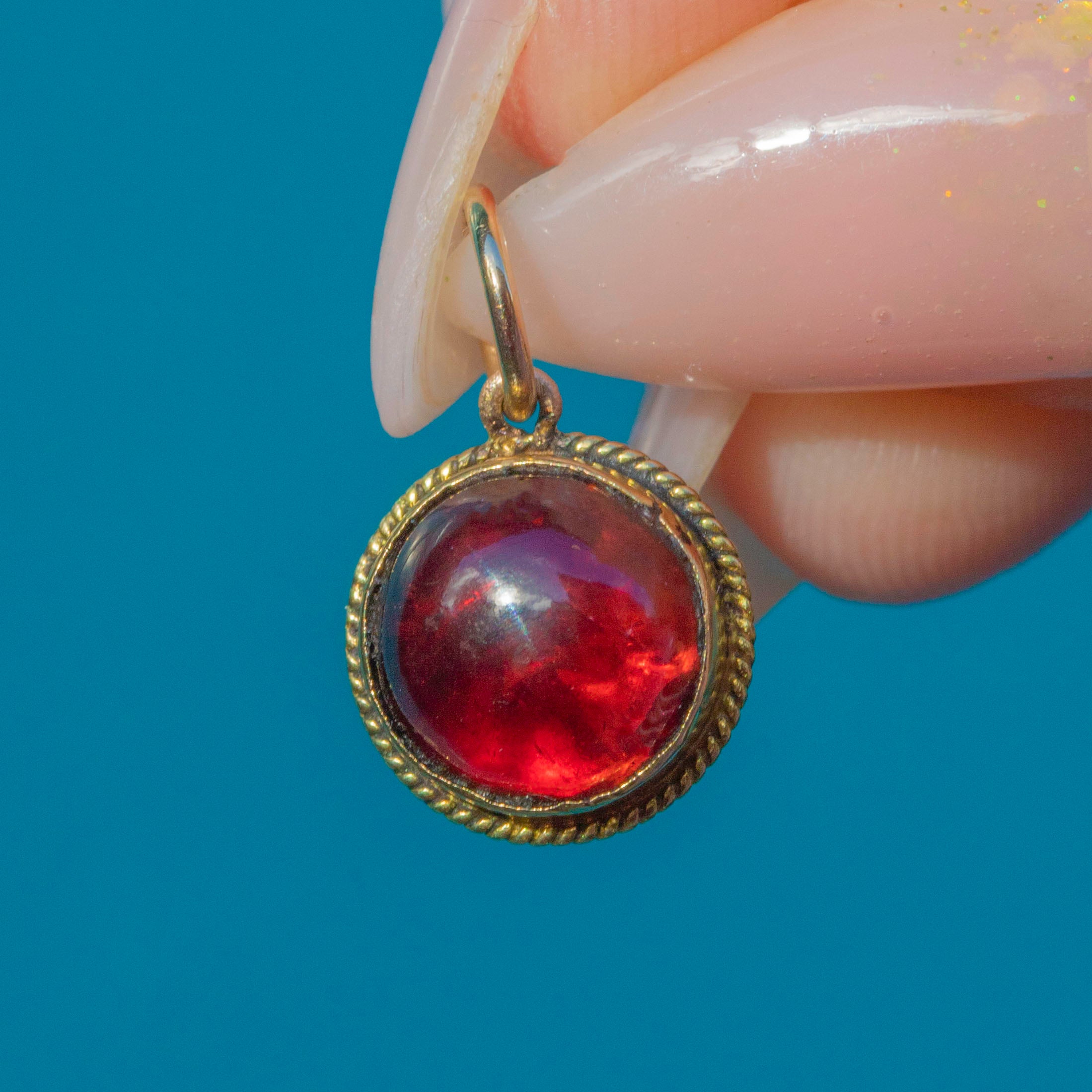 EXCELLENT: Garnet displays a rich, even colour and a smooth dome, with no chips or abrasions visible in wear. The Gold setting is crisp and secure. Some light wear to the back with evidence of an old conversion, stable and not distracting when worn.