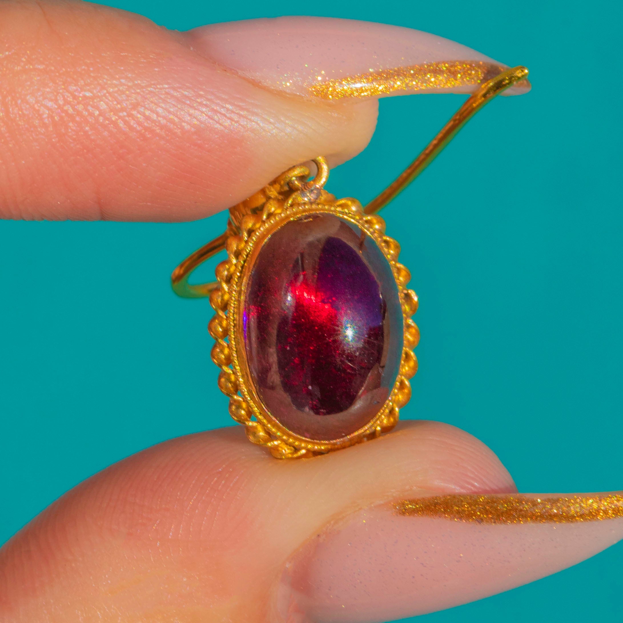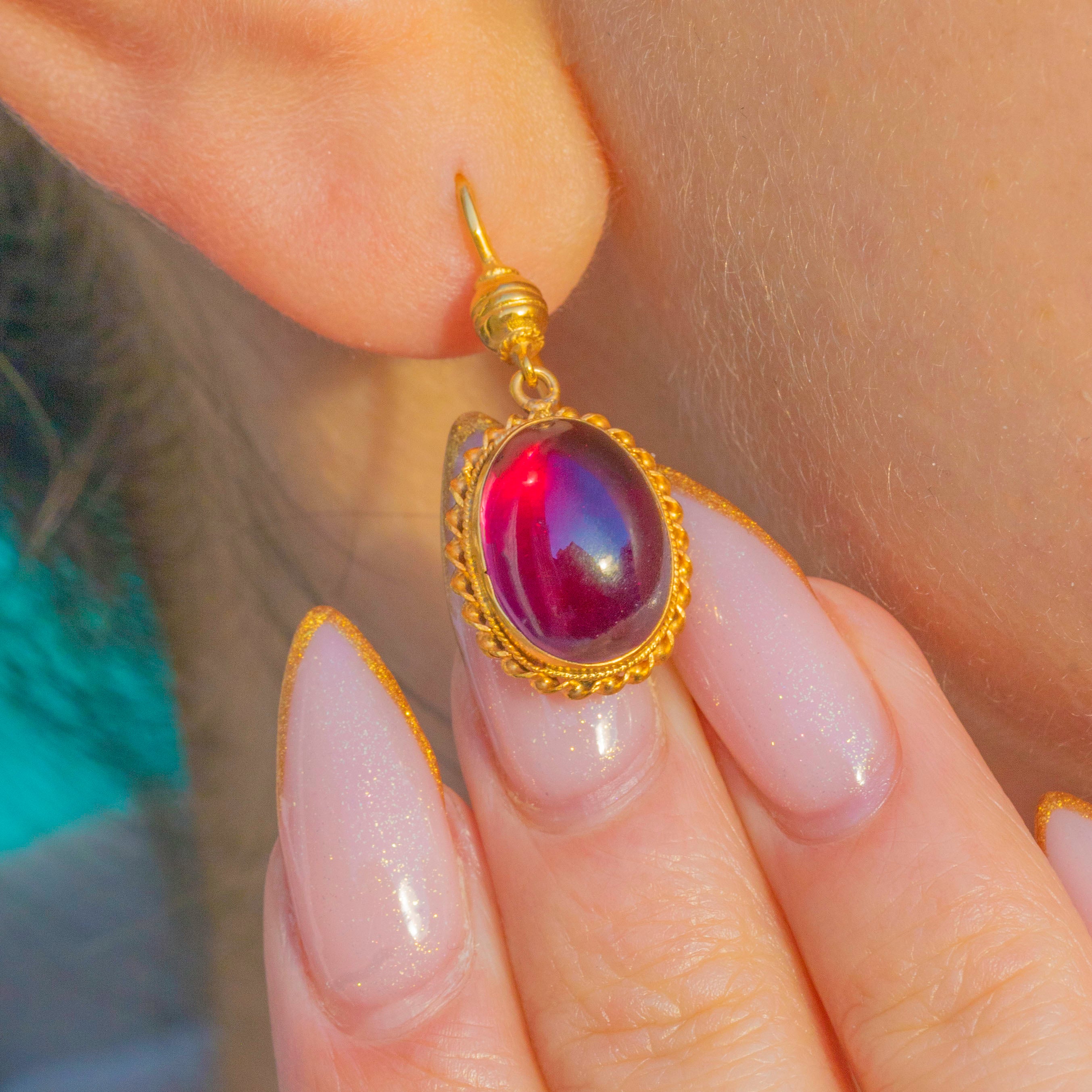 These Victorian 18ct Gold Garnet earrings are a glowing and elegant pair, each set with a rich red Garnet cabochon of exceptional size and colour with a total of 10.70cts!