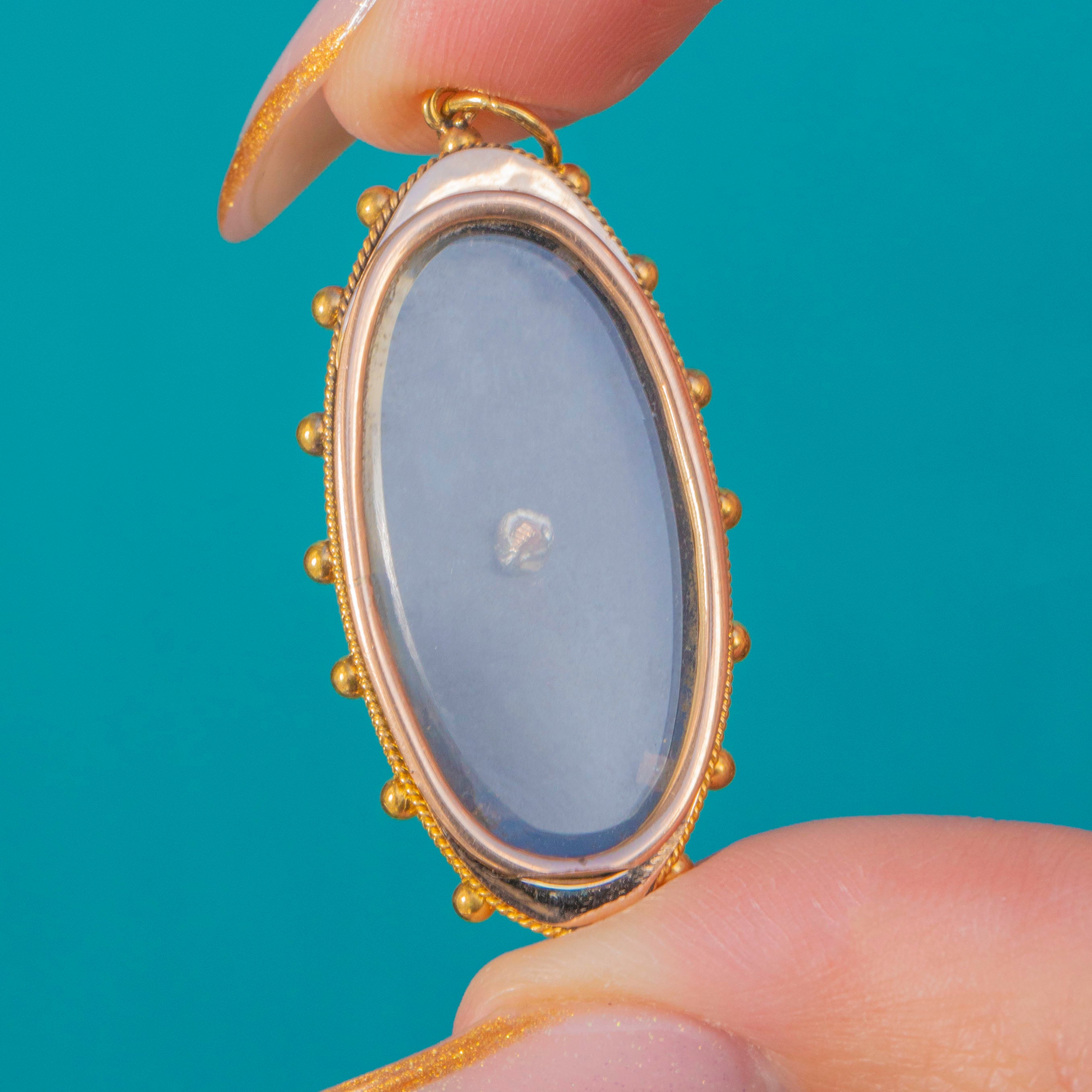 The reverse features a glass-fronted locket compartment within its original 9ct Gold frame, perfect for holding a photograph or treasured keepsake. Large, luxurious and beautifully detailed, this is a showstopping Victorian pendant with incredible presence on the neckline.