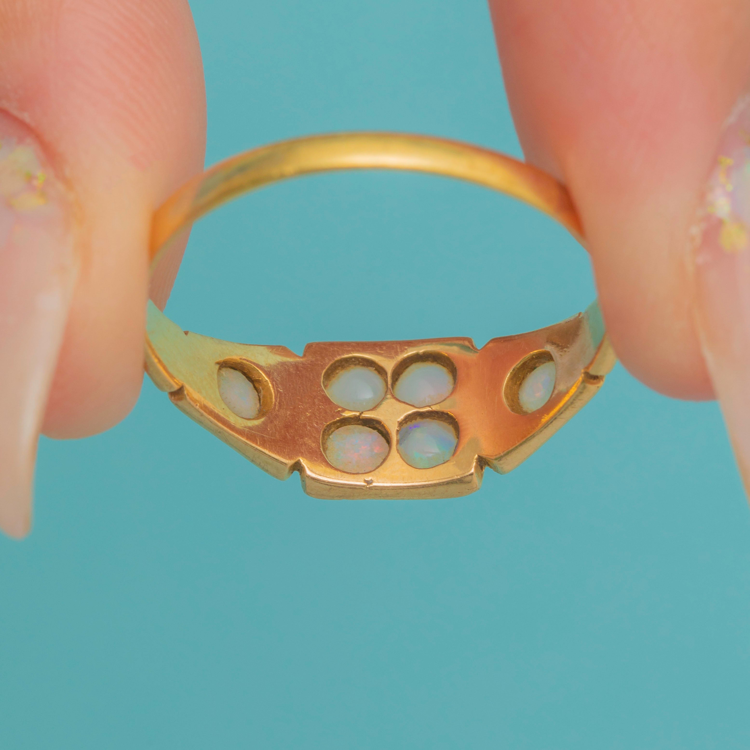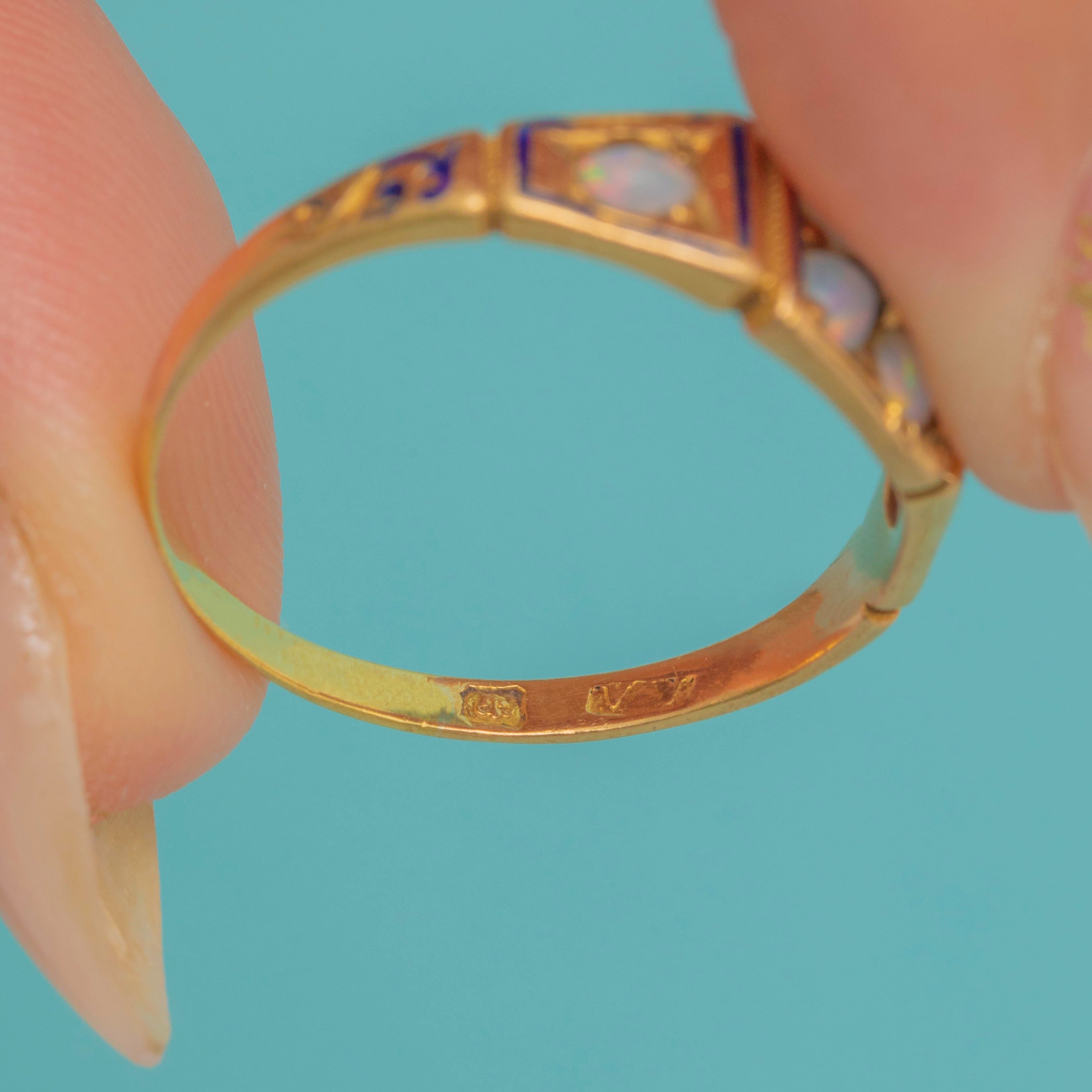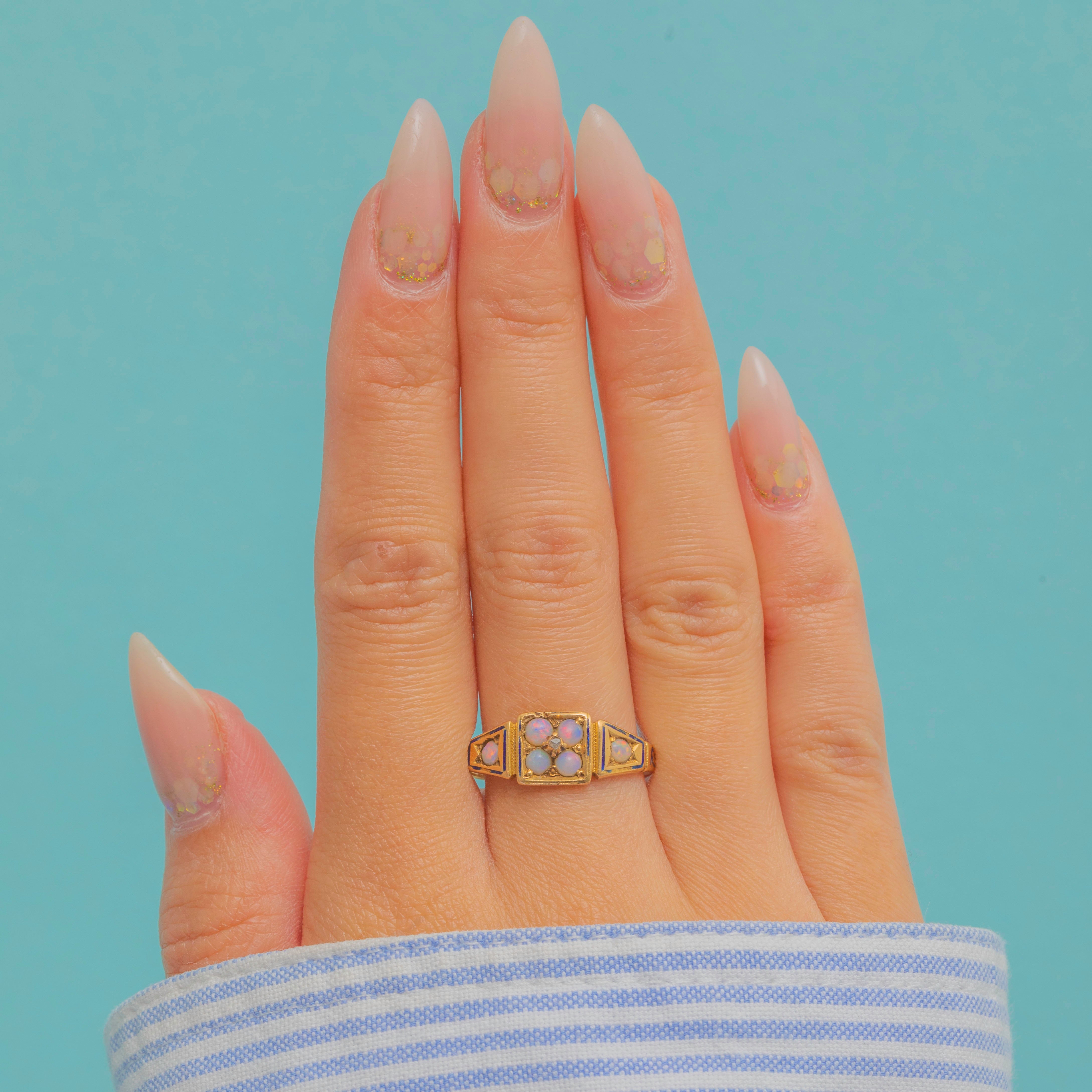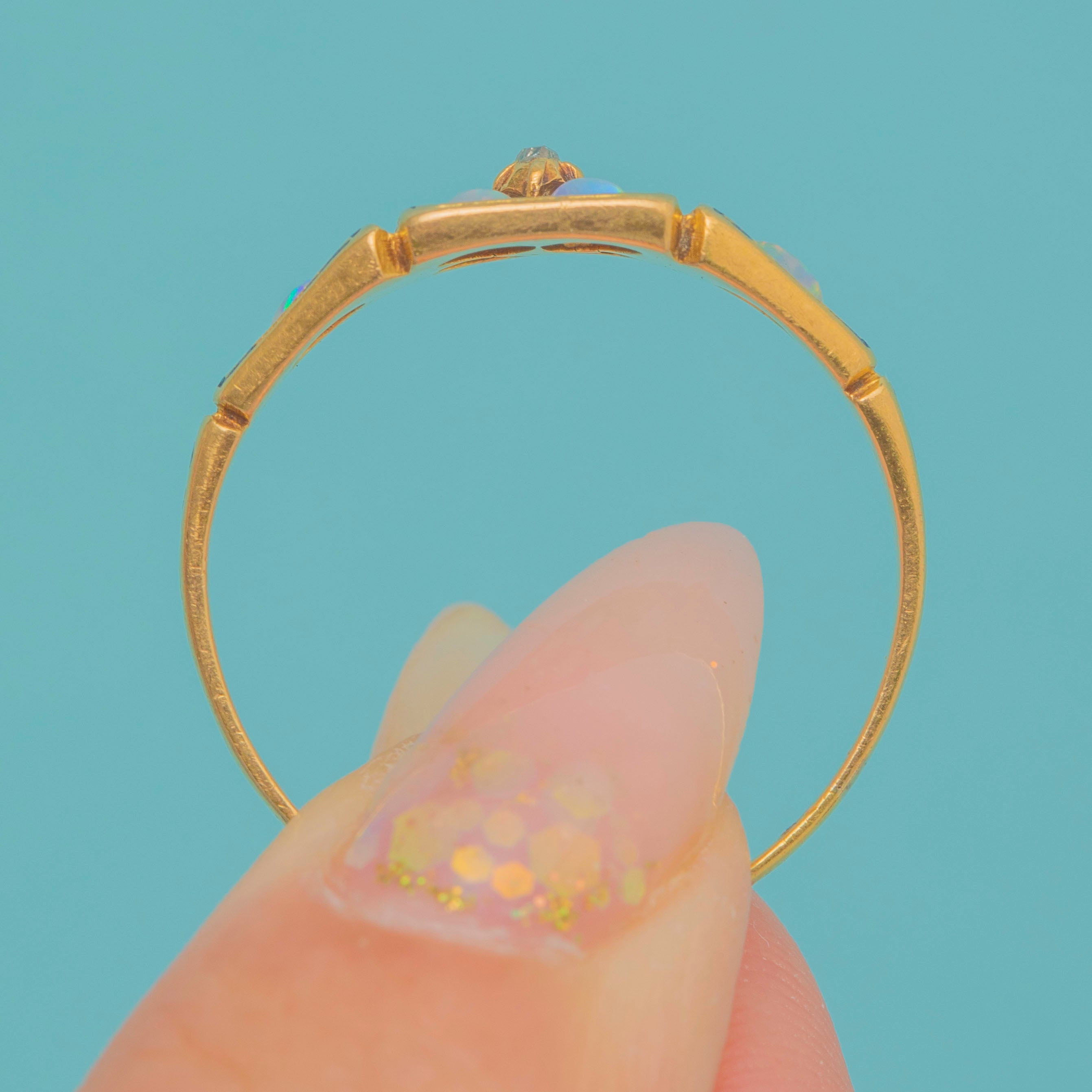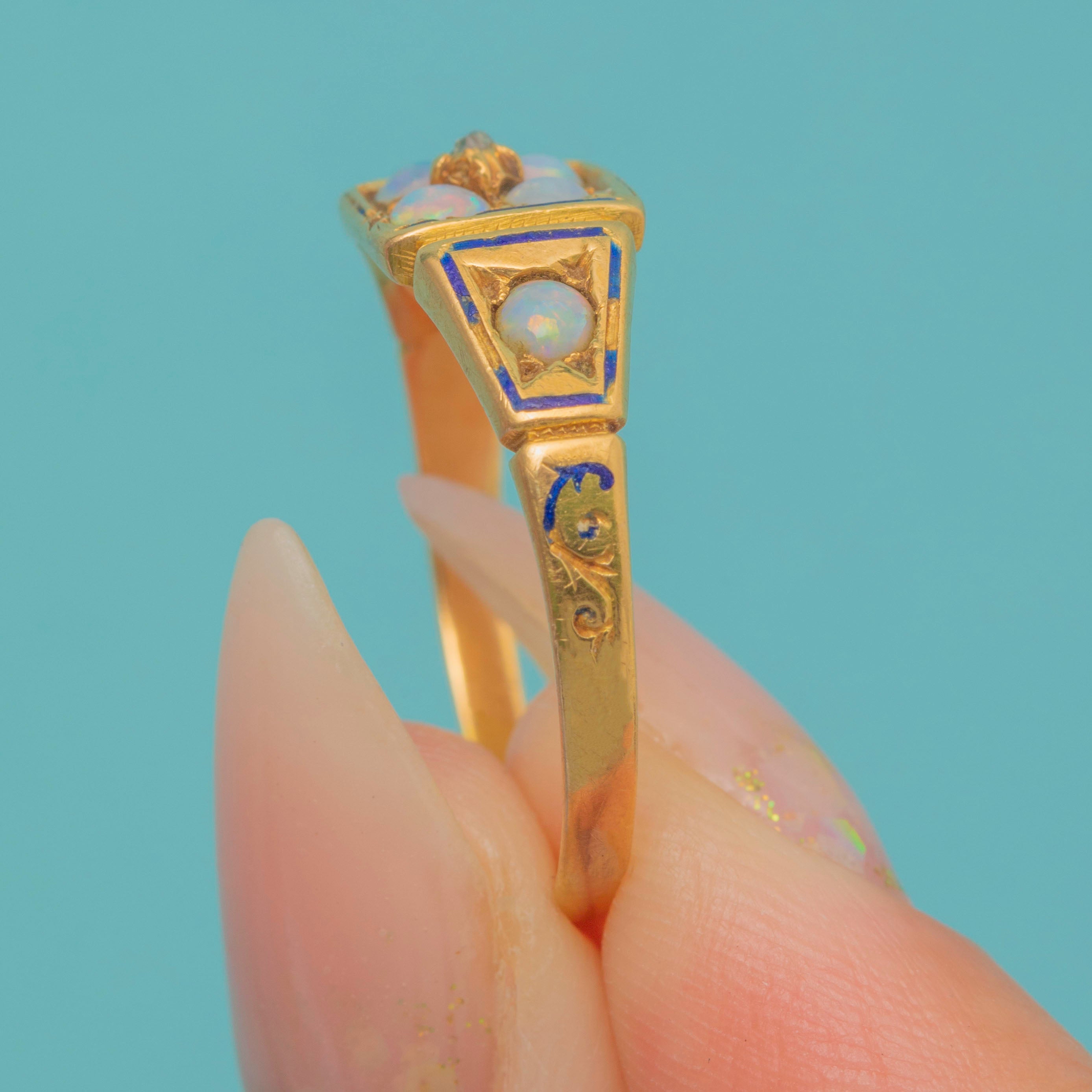 This Victorian ring combines glowing Opals, twinkling Diamonds and traces of black enamel in an ornate 18ct Gold setting. The play-of-colour in the Opals contrasts beautifully with the sparkle of the Diamonds, while the enamel detail, though much worn with age, hints at the grandeur the piece once carried.
