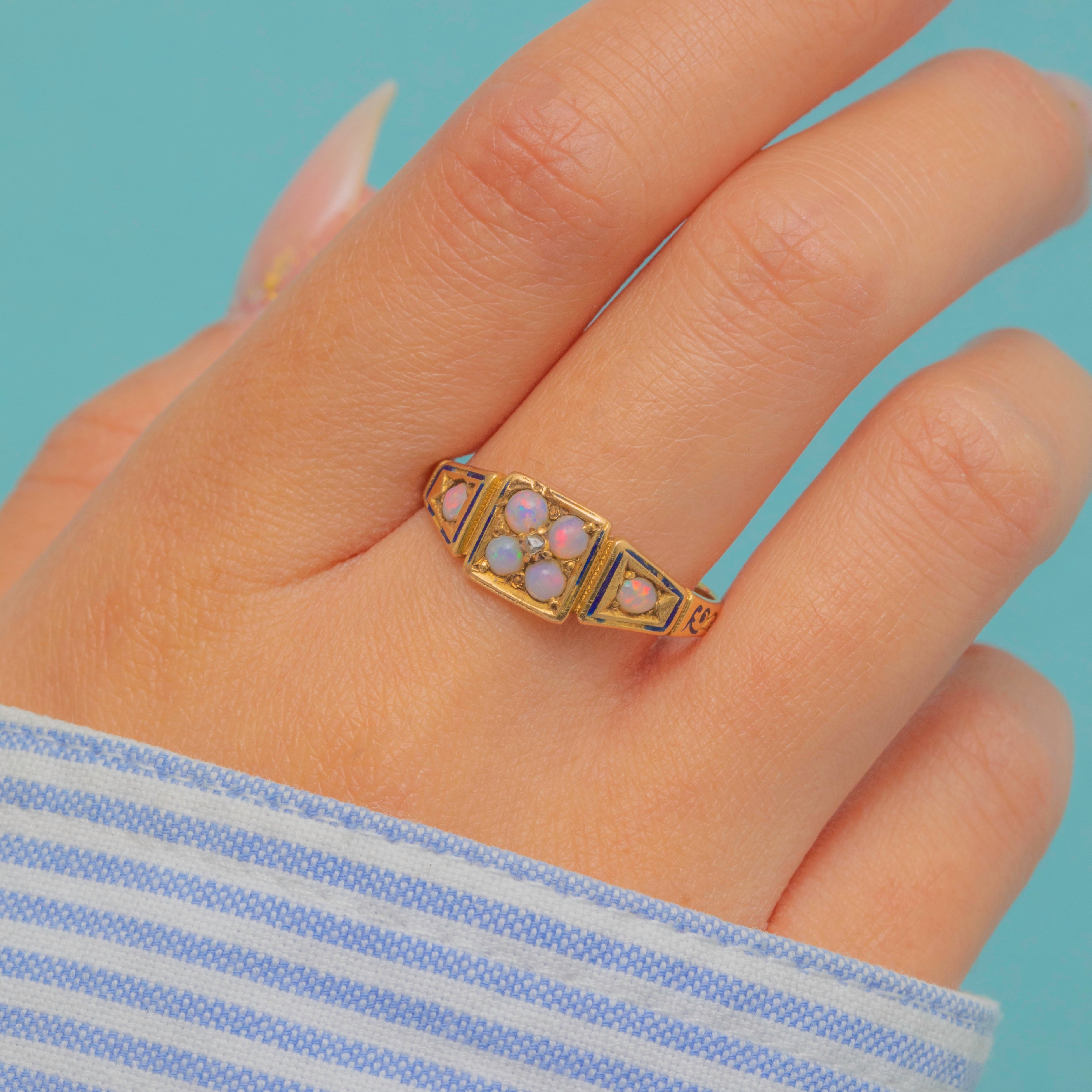 VERY GOOD: The Opals are luminous with lovely play-of-colour, and the Diamonds are bright and securely set. The Gold remains in excellent condition. Much of the black enamel has been lost with age, but the ring retains a wonderful aura and antique charm overall.