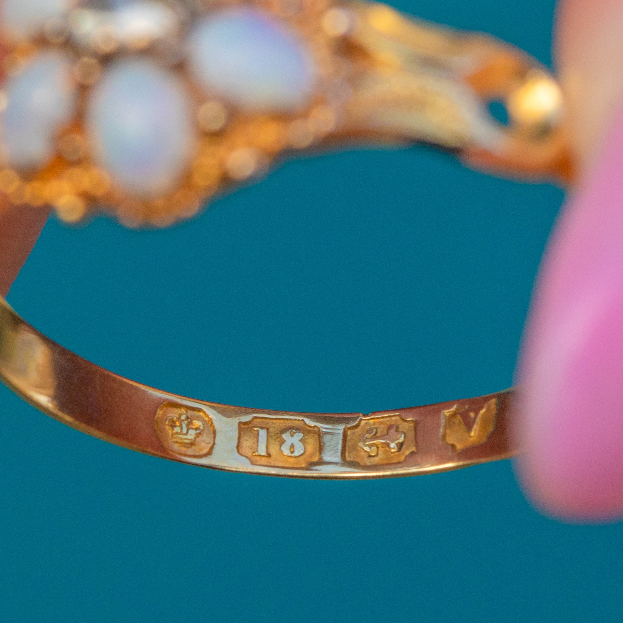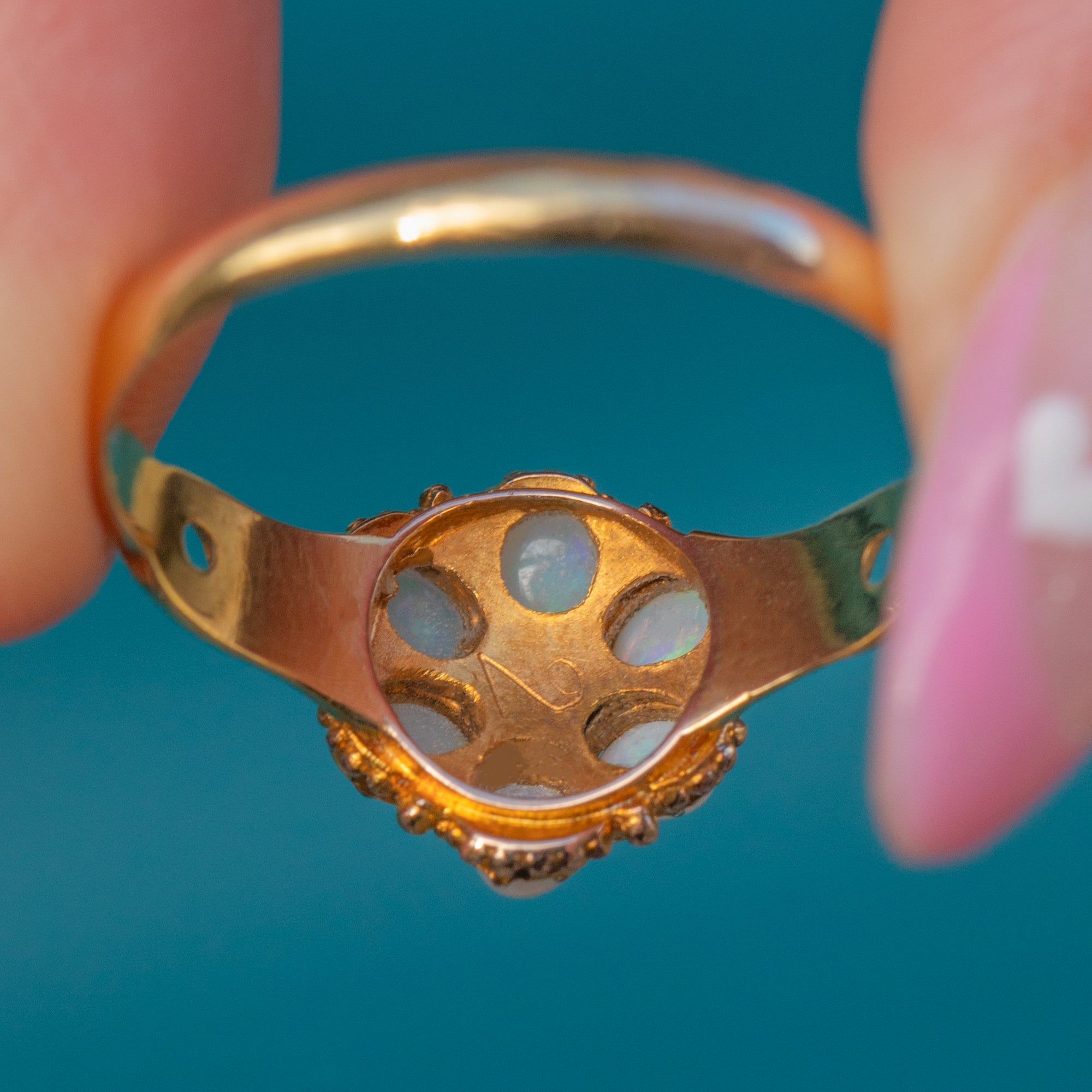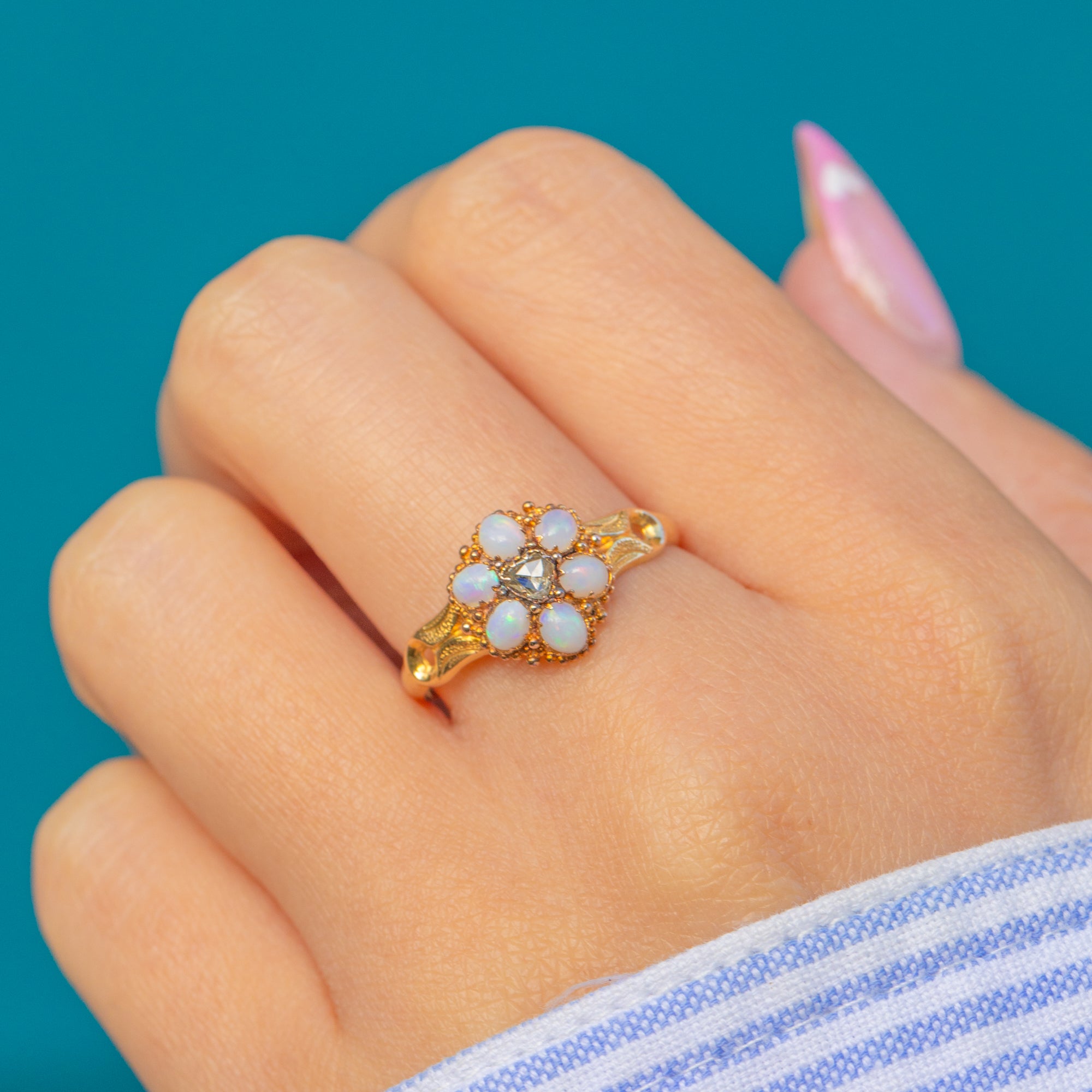 This beautiful Early Victorian flower ring is set with ethereal Opals and a glistening rose-cut Diamond at the centre. The combination of the shimmering Opals and the antique cut Diamond creates a gentle play of light, perfectly capturing the romantic spirit of the 19th century.