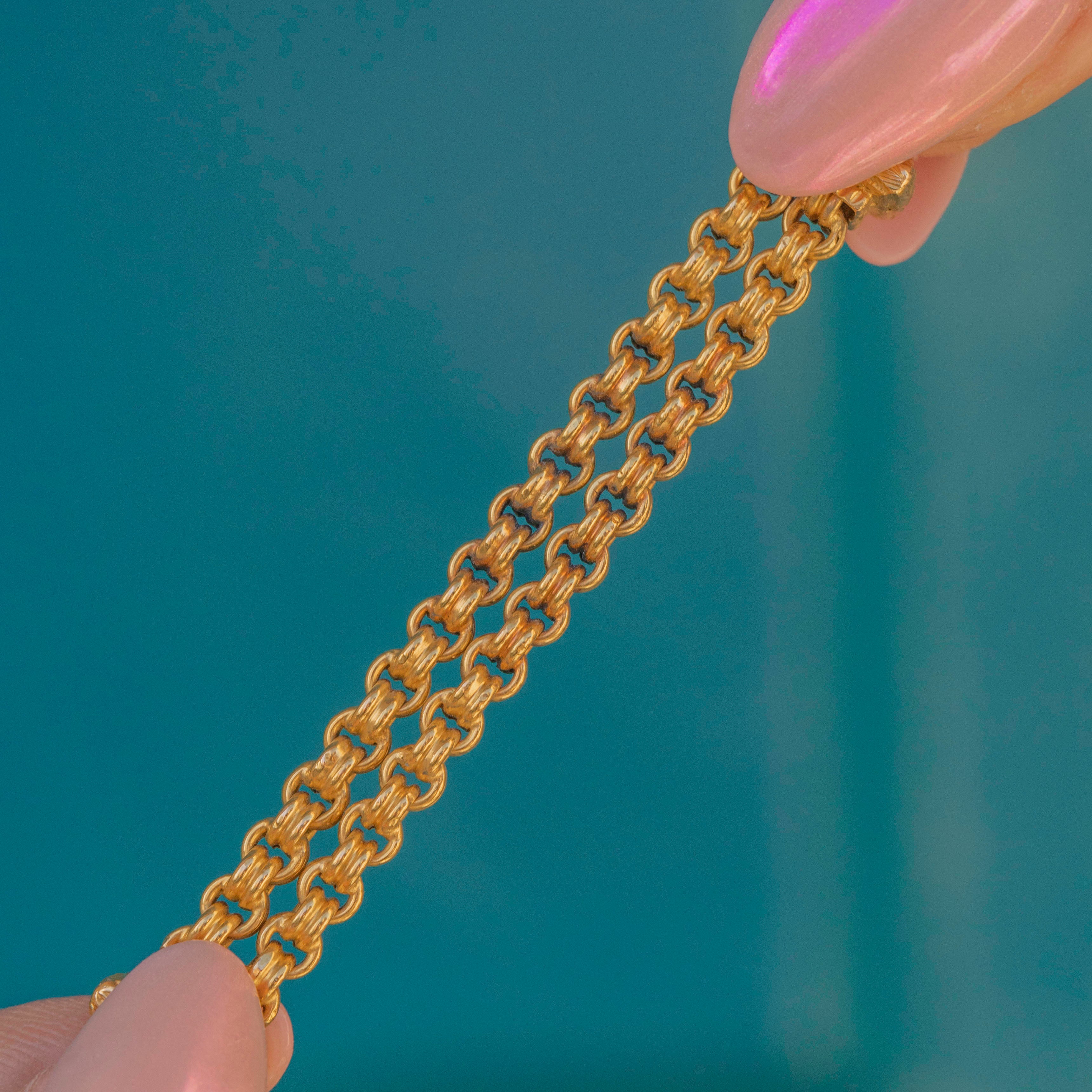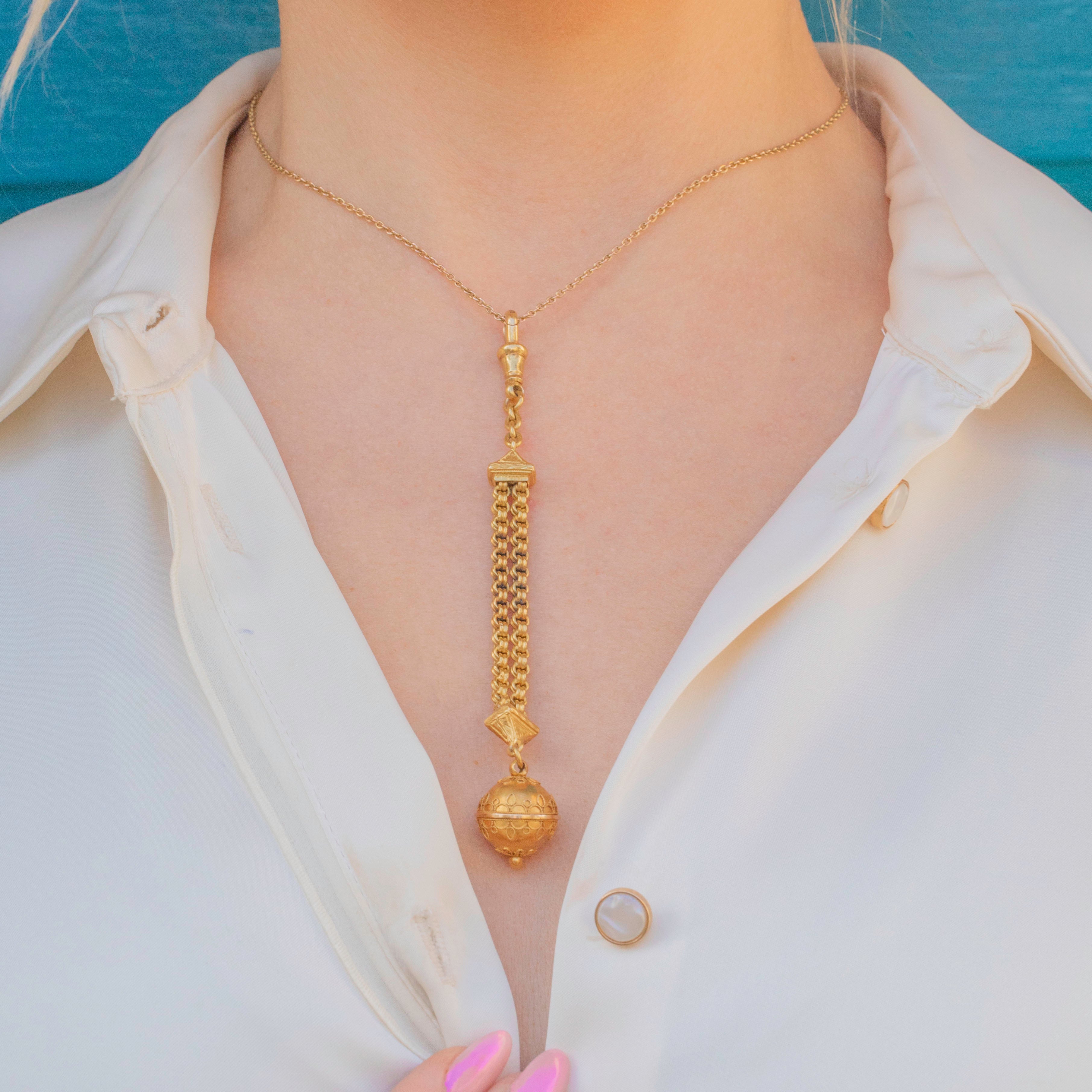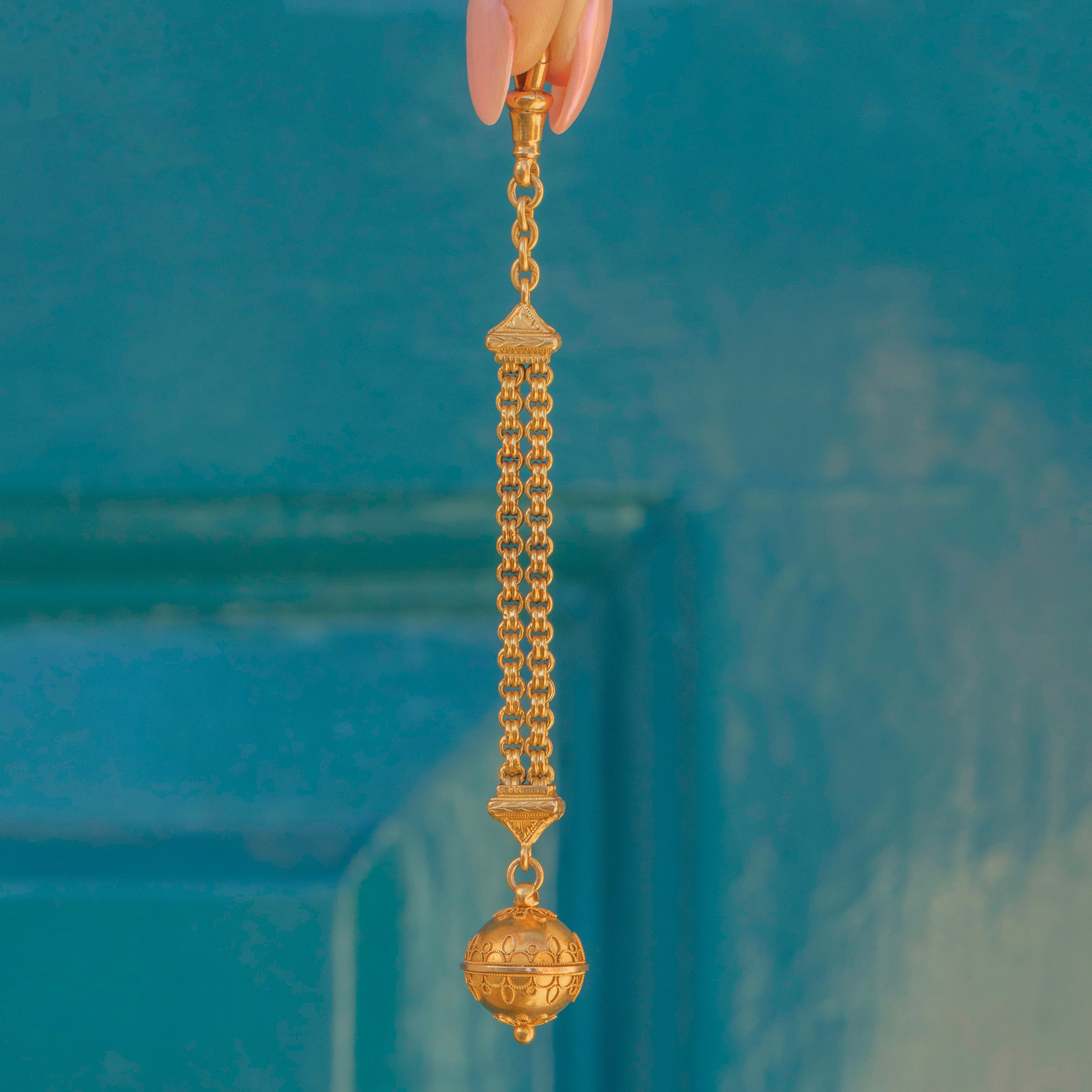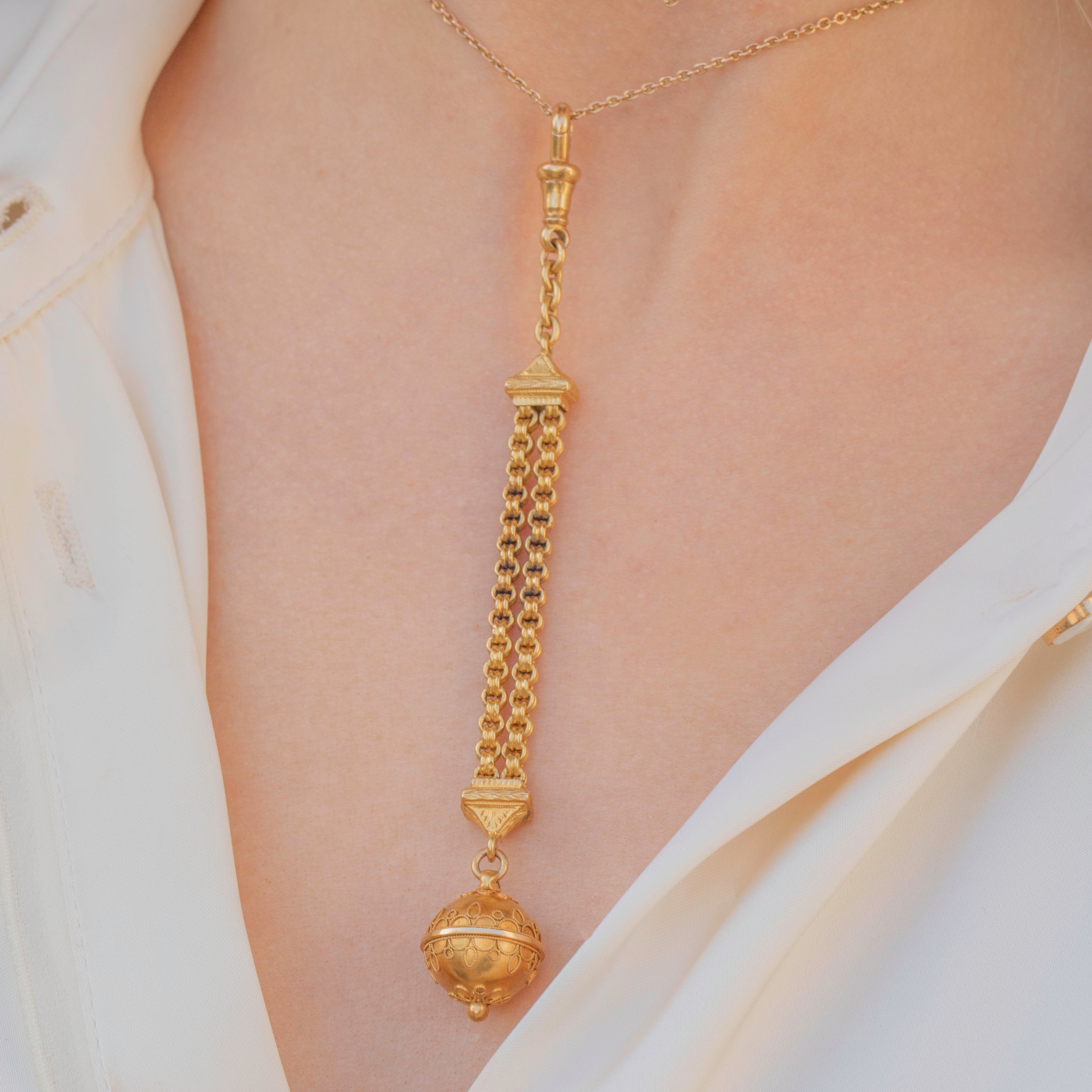 This Victorian 18ct Gold orb drop pendant is a captivating piece, featuring an ornate Gold orb that hangs elegantly from a richly saturated Gold belcher chain. The orb is attached to a classic Victorian-style dog-clip clasp rendering her both classy and functional!