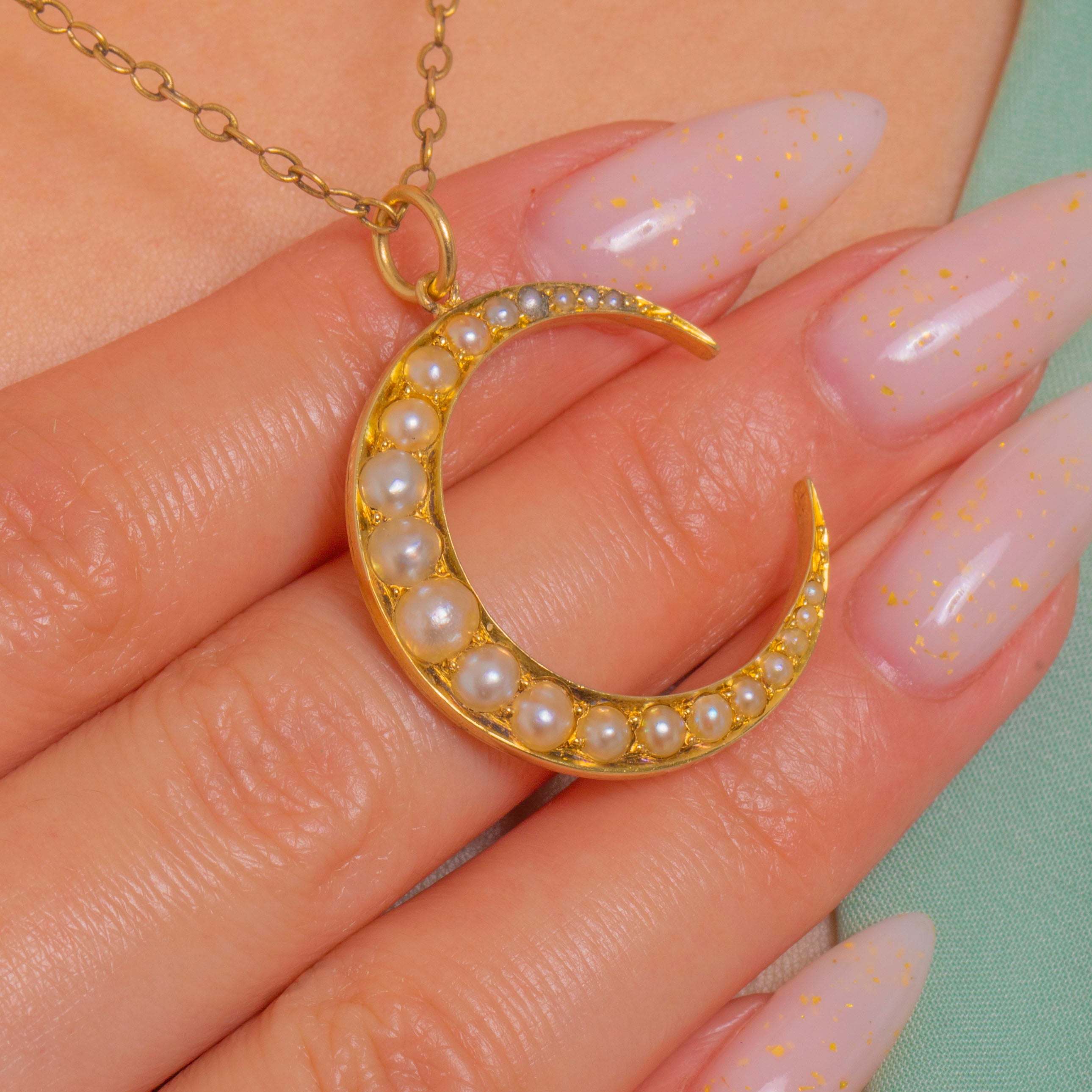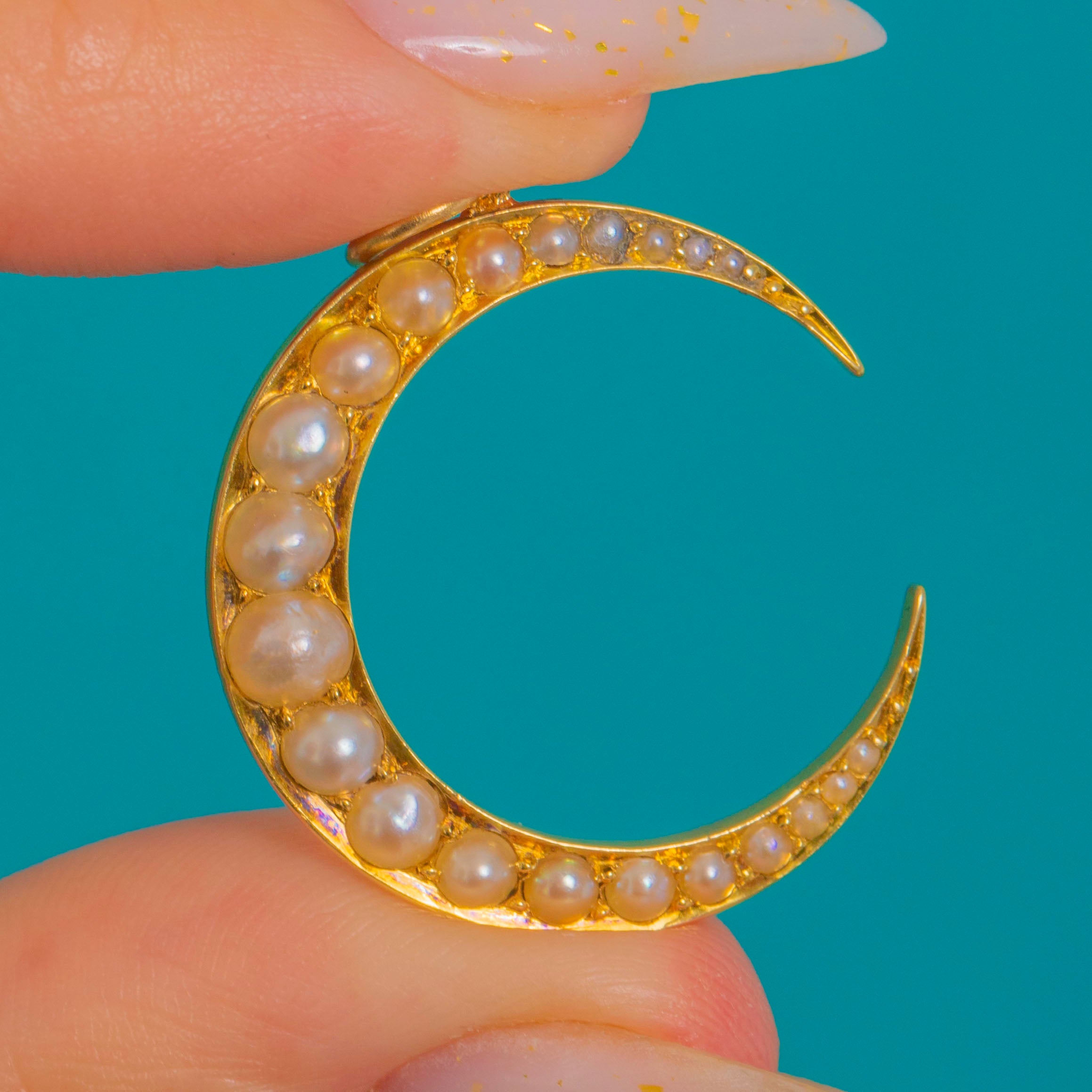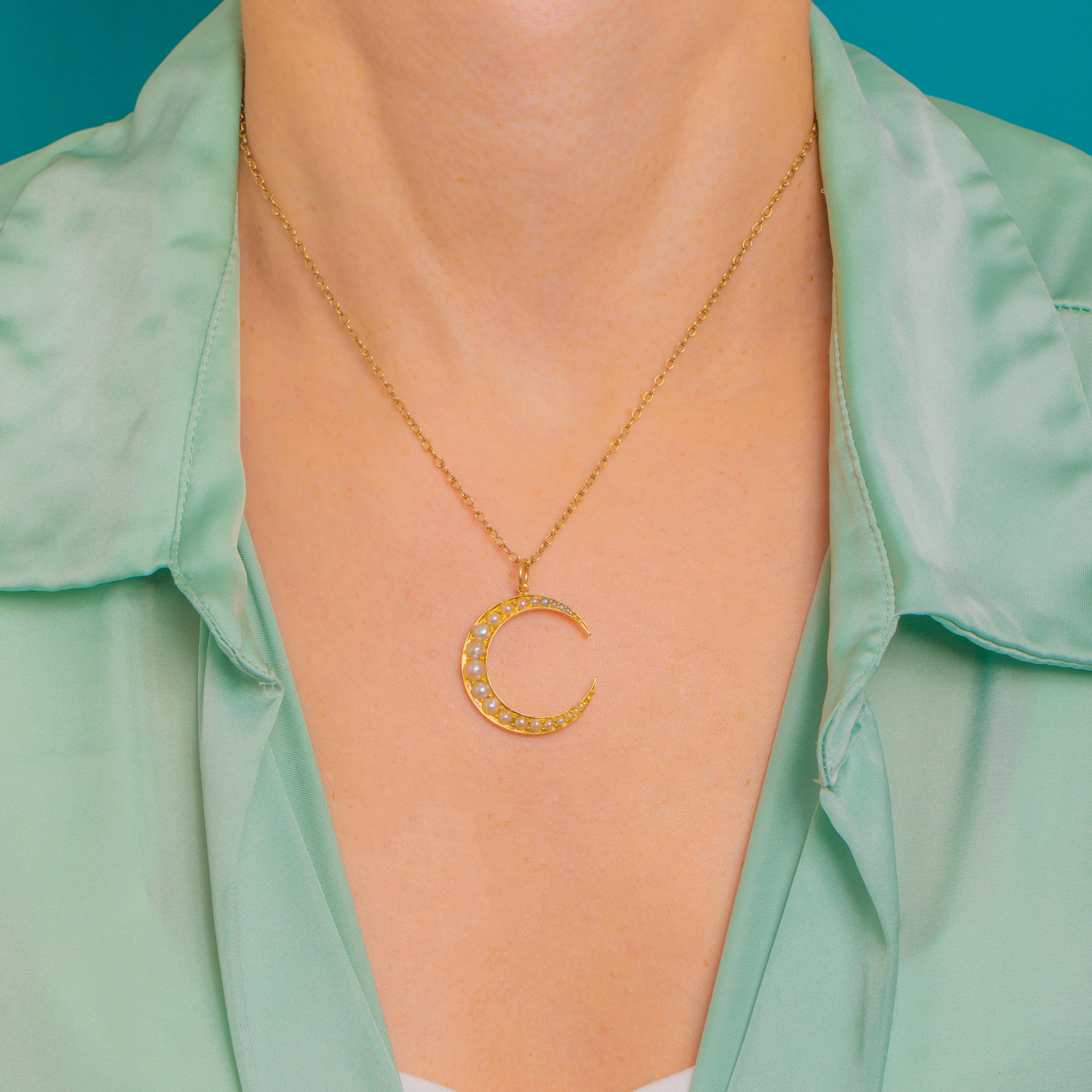 The slim crescent silhouette is refined and polished, its Pearls neatly arranged for a harmonious, balanced look. Finished with an 18ct Gold jump ring, it’s a timeless antique treasure that layers seamlessly into modern jewellery wardrobes.