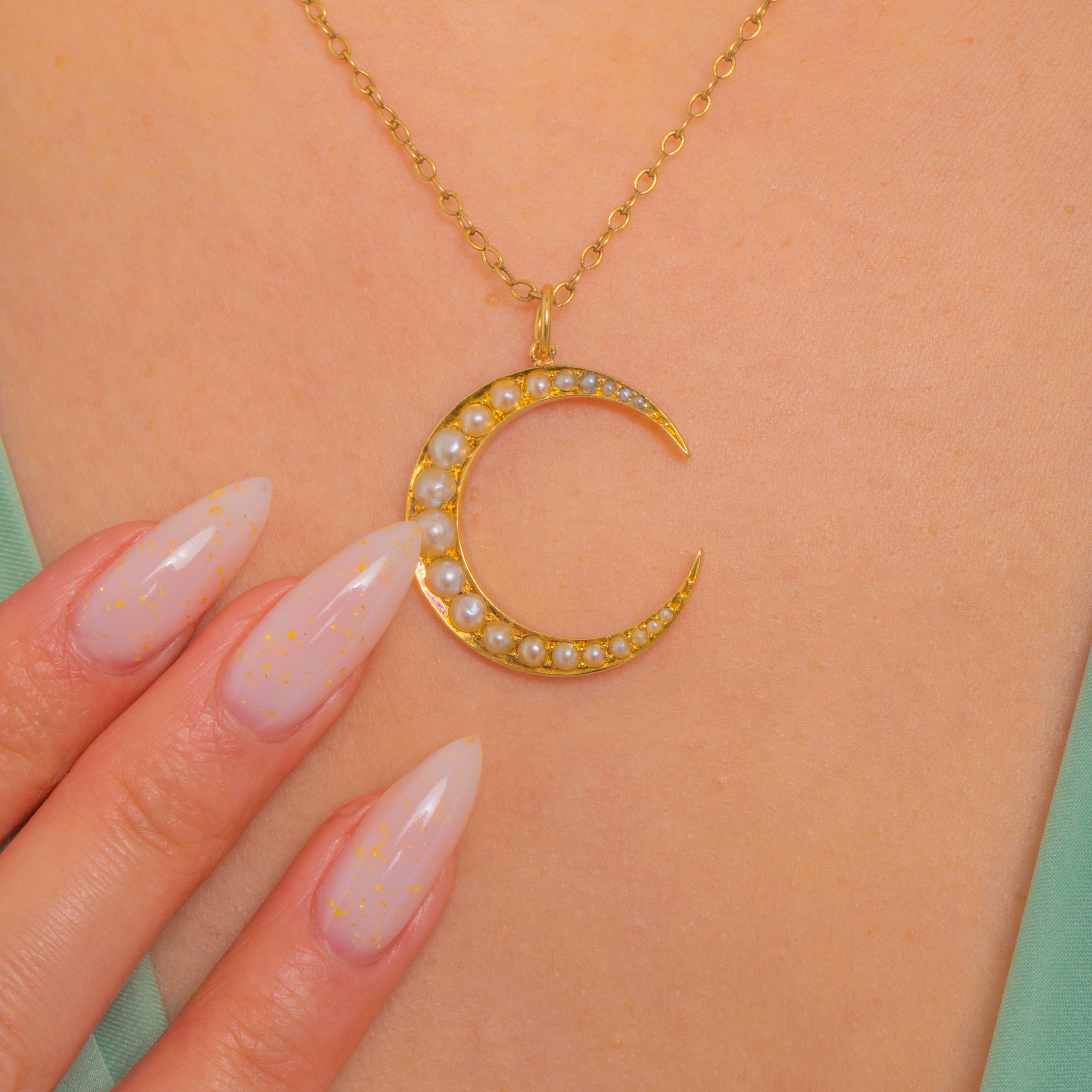 A luminous Victorian crescent moon pendant crafted in rich 18ct Gold, set with a beautifully graduated row of creamy Pearls from 1mm to 3.5mm that taper gracefully to the tips. Romantic and celestial, this classic motif captures the era’s fascination with the night sky, lending an effortlessly elegant glow to any neckline.