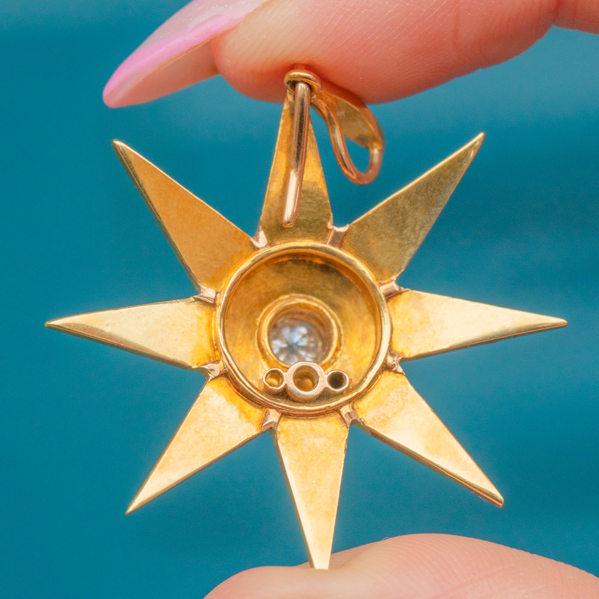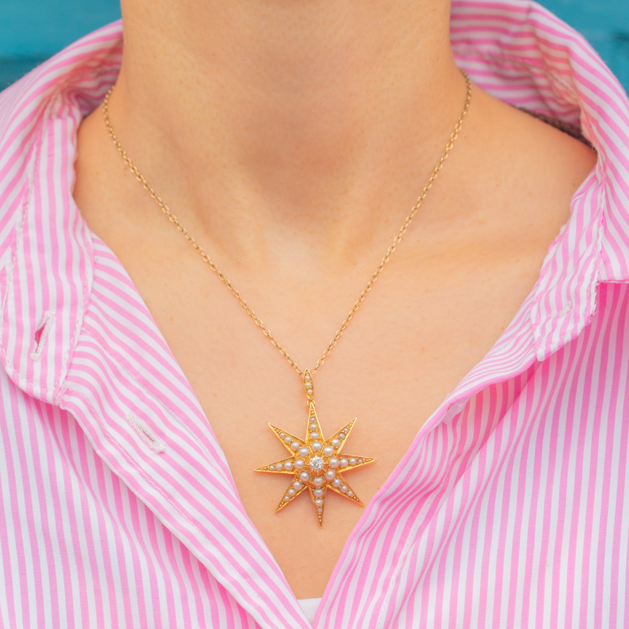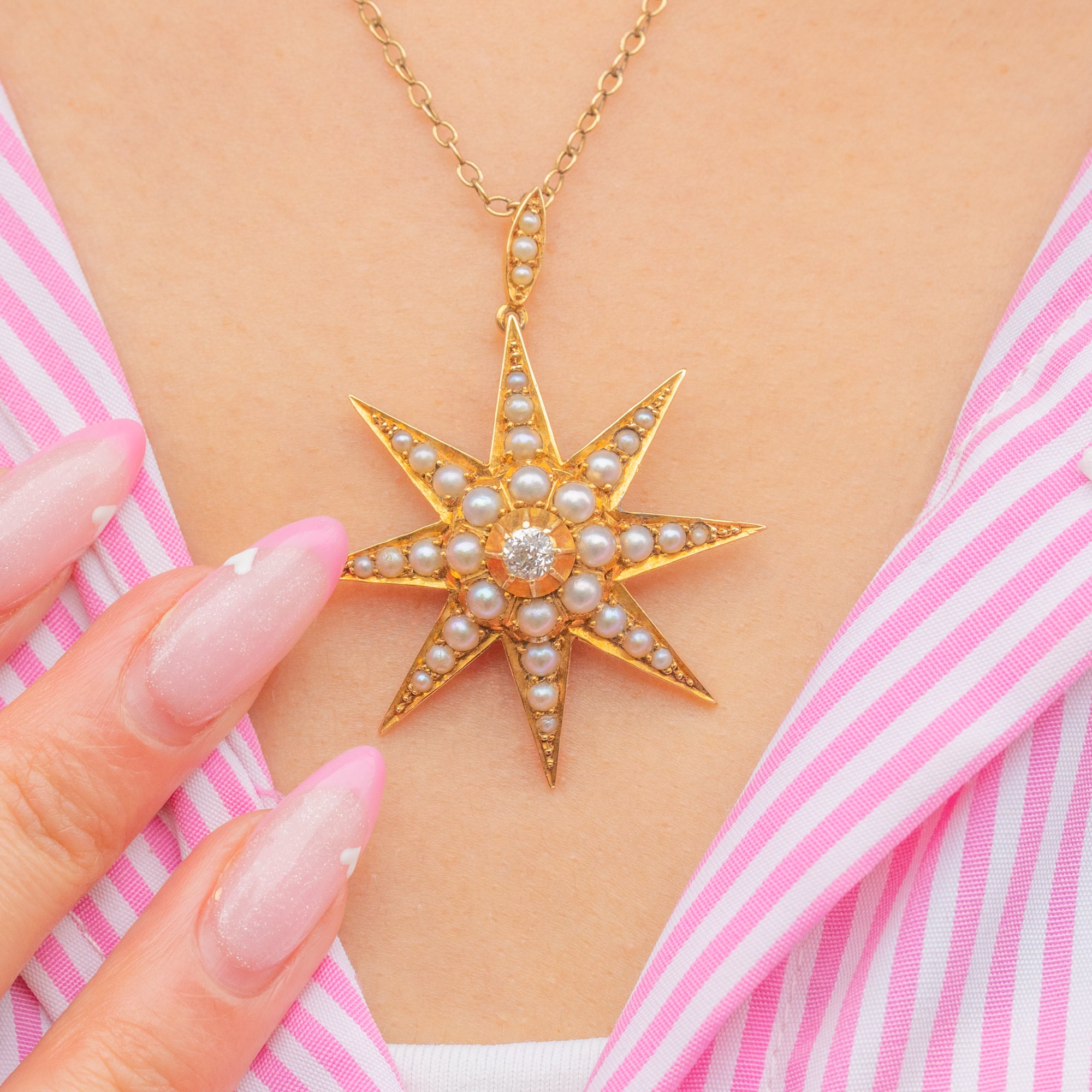 This breathtaking Victorian star pendant radiates antique splendour. Crafted in rich 18ct Gold, it glows with lustrous natural Pearls surrounding a sparkling Old Mine Cut Diamond at its heart. The eight-point starburst design captures the celestial fascination of the late 19th century — a symbol of guidance, love, and light.