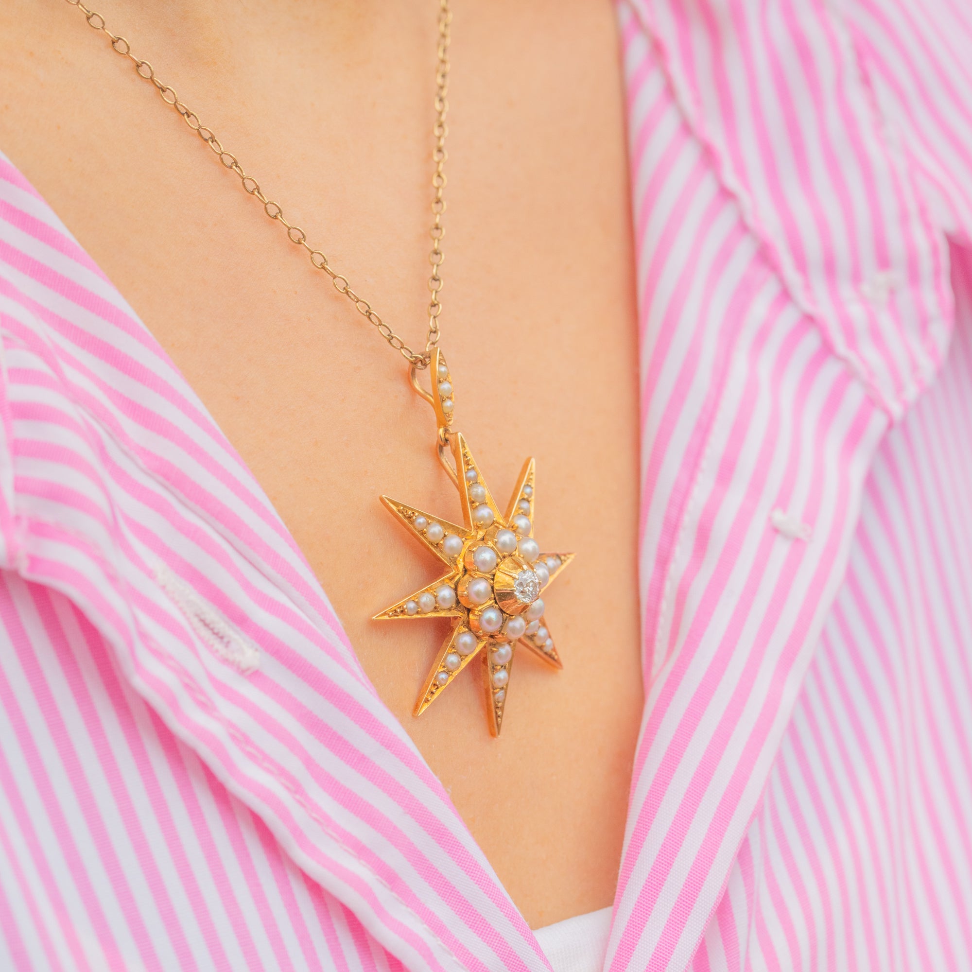 EXCELLENT: The Pearls are clean and lustrous, the Diamond bright and well-set. The Gold is immaculate with crisp detail and a beautiful antique sheen. A truly pristine Victorian star pendant.