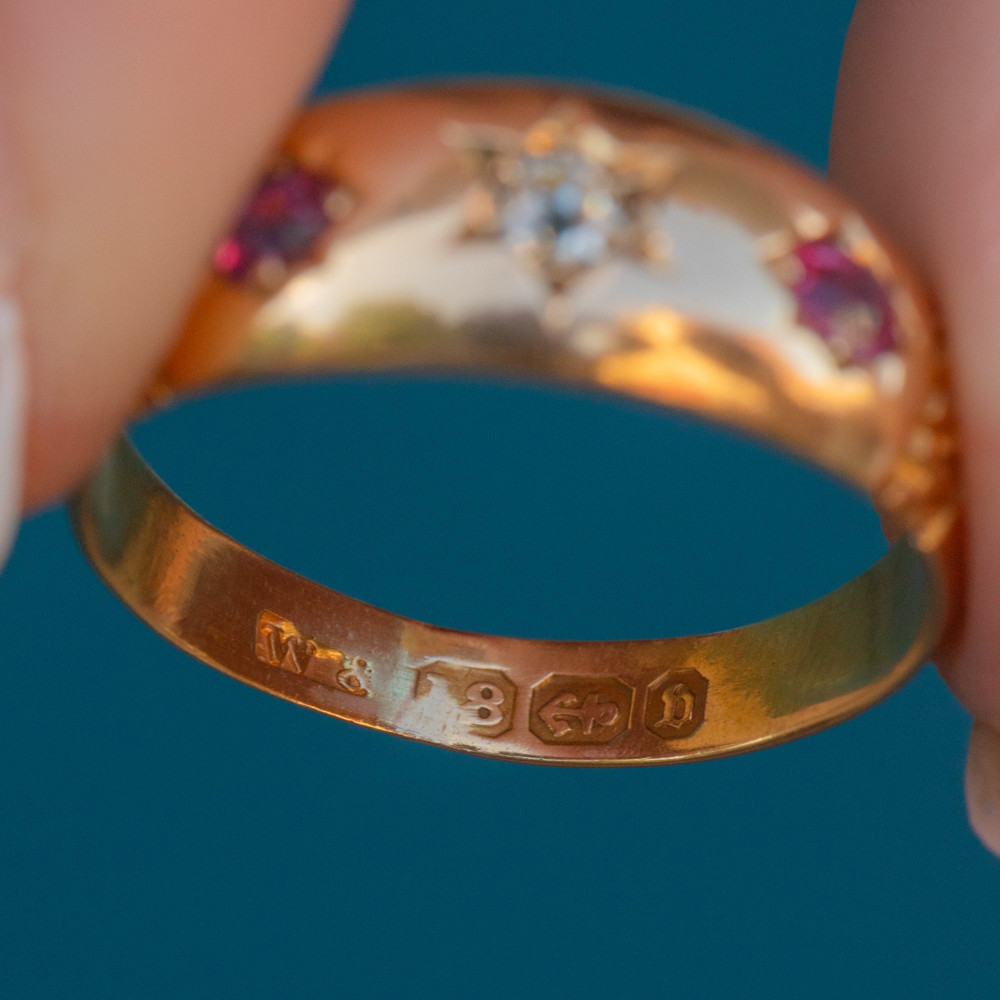EXCELLENT. This Victorian 18ct Gold Diamond Ruby gypsy ring is in very good condition. The ring band is fully hallmarked to 1876, and the gemstones are secure within their settings. The ring has a bright and buttery finish, and you can wear her with absolute confidence!