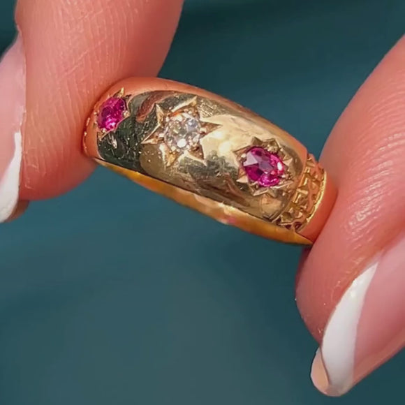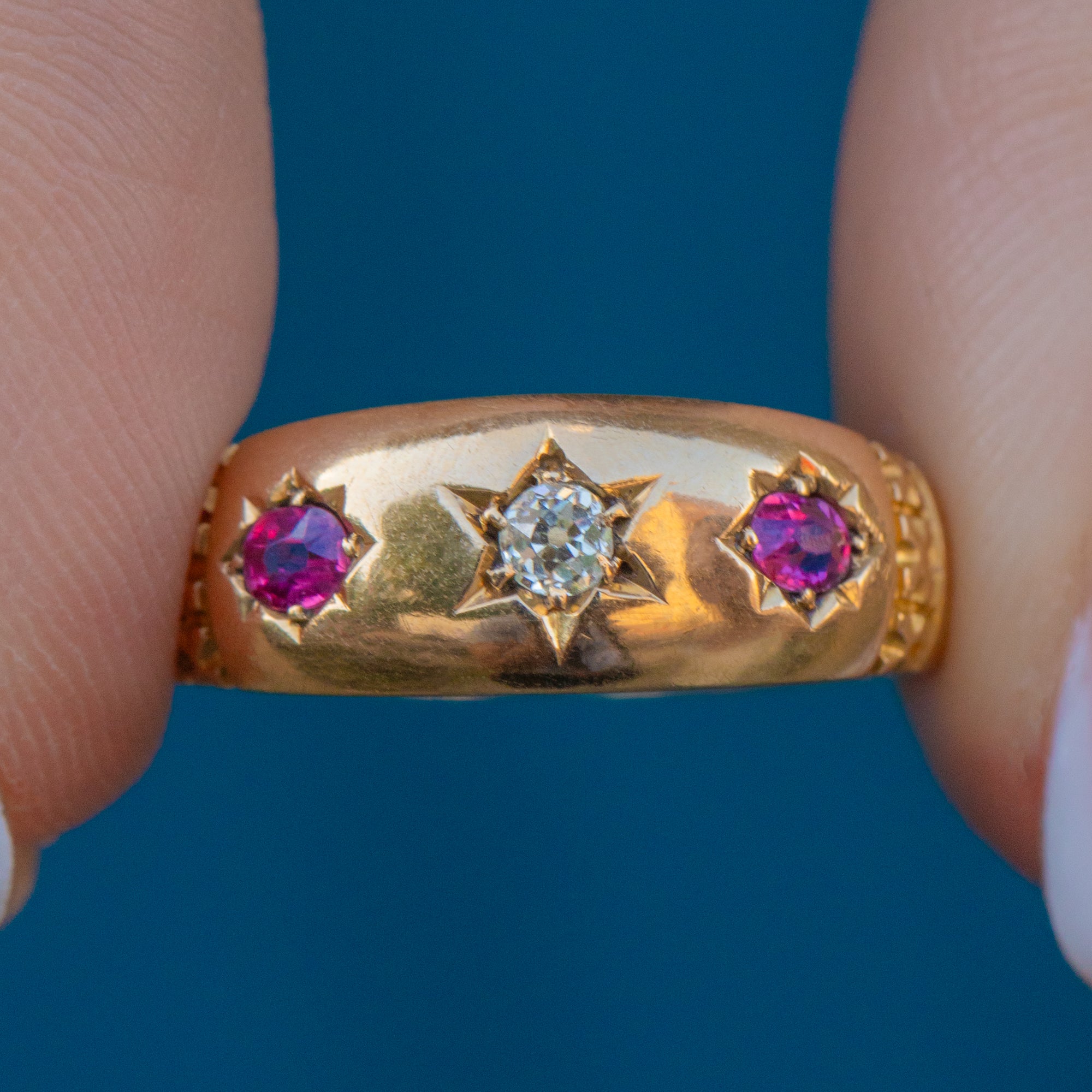 We have fallen head over heels for this Victorian 18ct Gold Diamond Ruby gypsy ring! This gorgeous piece boasts a sparkling Diamond in the centre, adorned by two berry red Rubies on either side displayed within star settings adding a celestial touch.