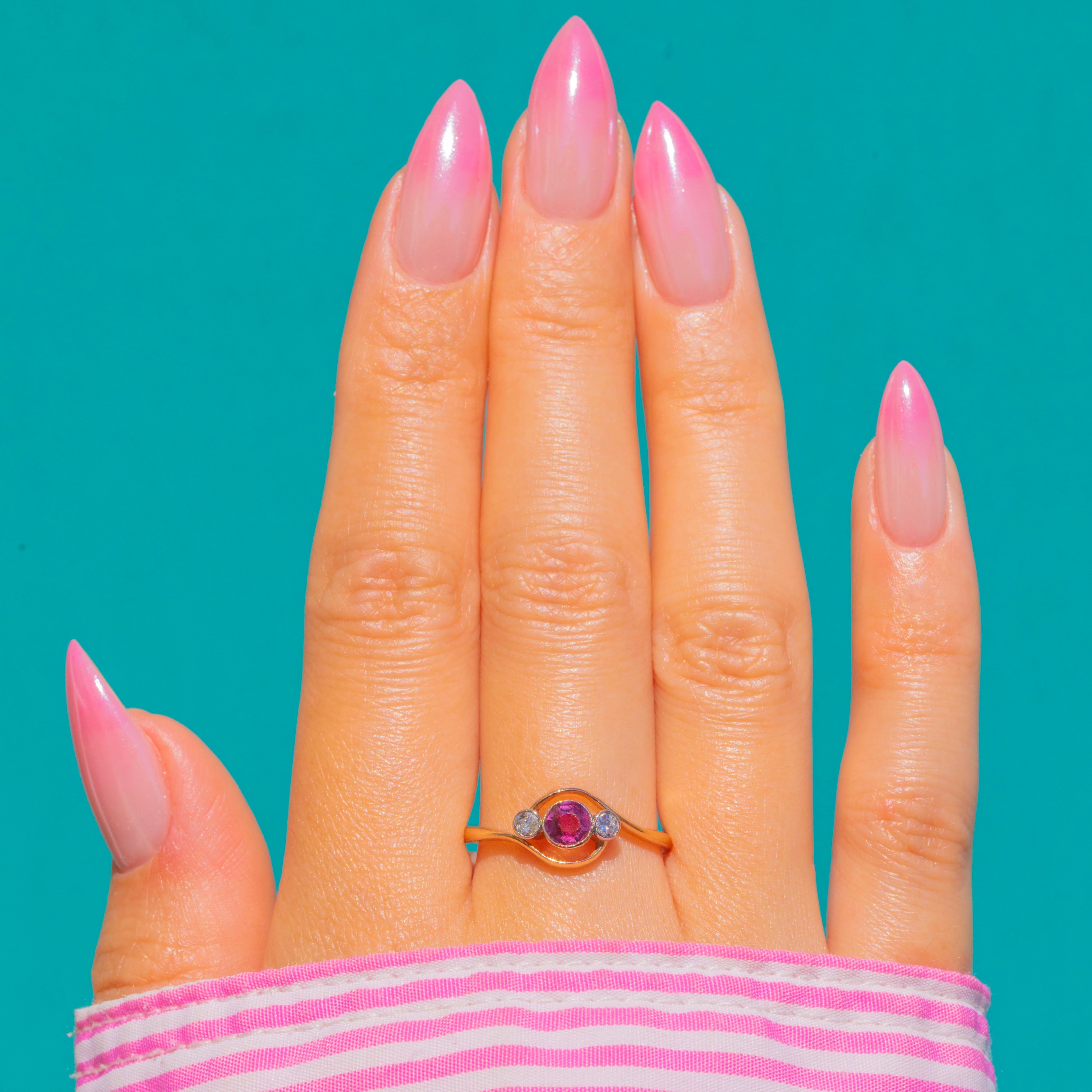 A refined Victorian twist ring in rich 18ct Gold, set with a glowing round Ruby embraced by two sparkling round Diamonds. The trio is secured in smooth bezel settings that flow seamlessly into elegant, scrolling shoulders for a beautifully fluid, romantic silhouette.