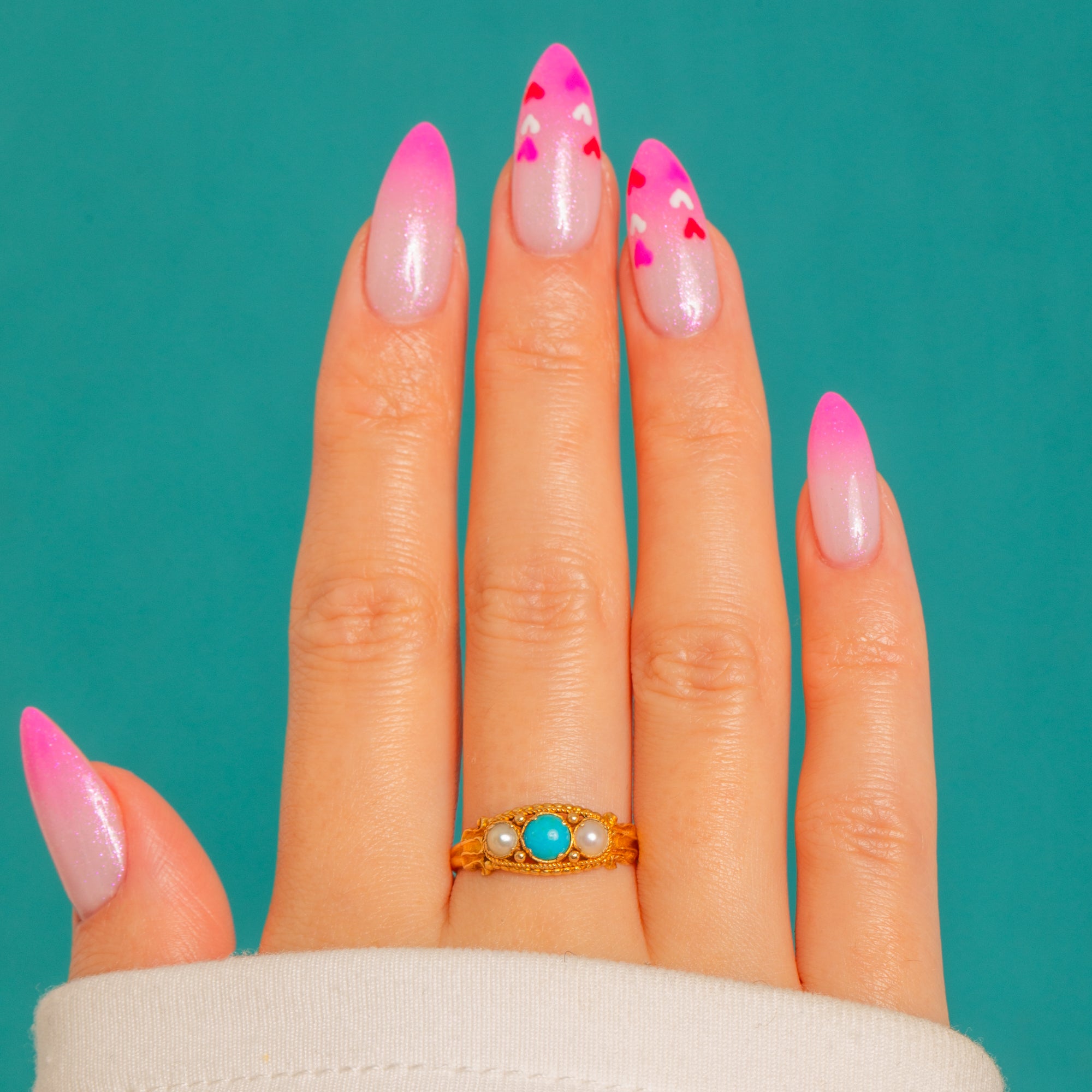A delicate Victorian three-stone ring, gleaming in rich 18ct Gold with a bright sky blue Turquoise cabochon at the centre and creamy Pearls to each side. The trio is framed by a pretty rope border, with softly foliate, lightly ribbed shoulders lending an ornate, romantic finish.