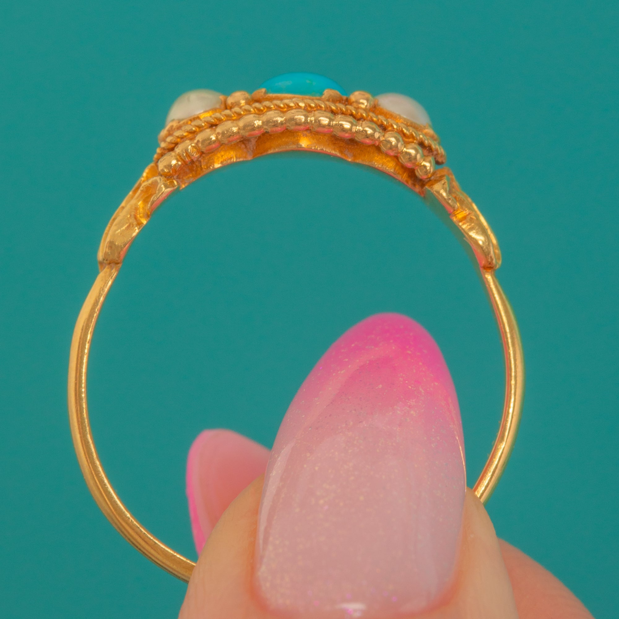 EXCELLENT: The Turquoise and Pearls are secure and display only the most minimal surface wear visible under close inspection. The Gold setting and shank are in excellent order with light age-related marks and a lovely patina; subtle solder/tool marks are visible near the head. Overall the ring has been well cared for, with wear commensurate with age and no notable damage.