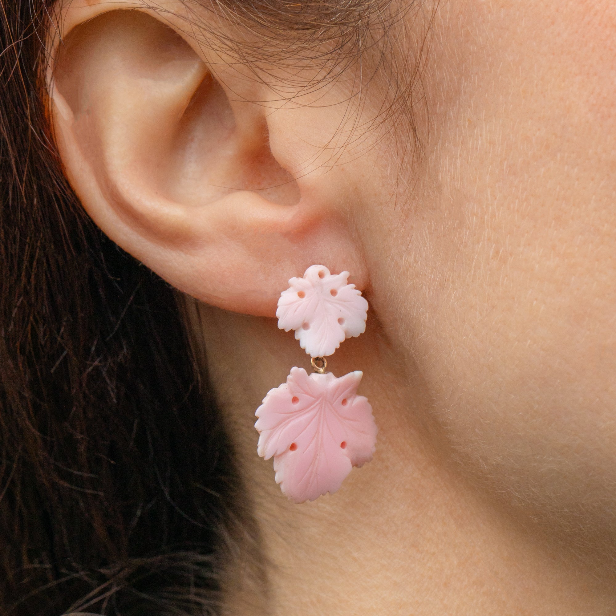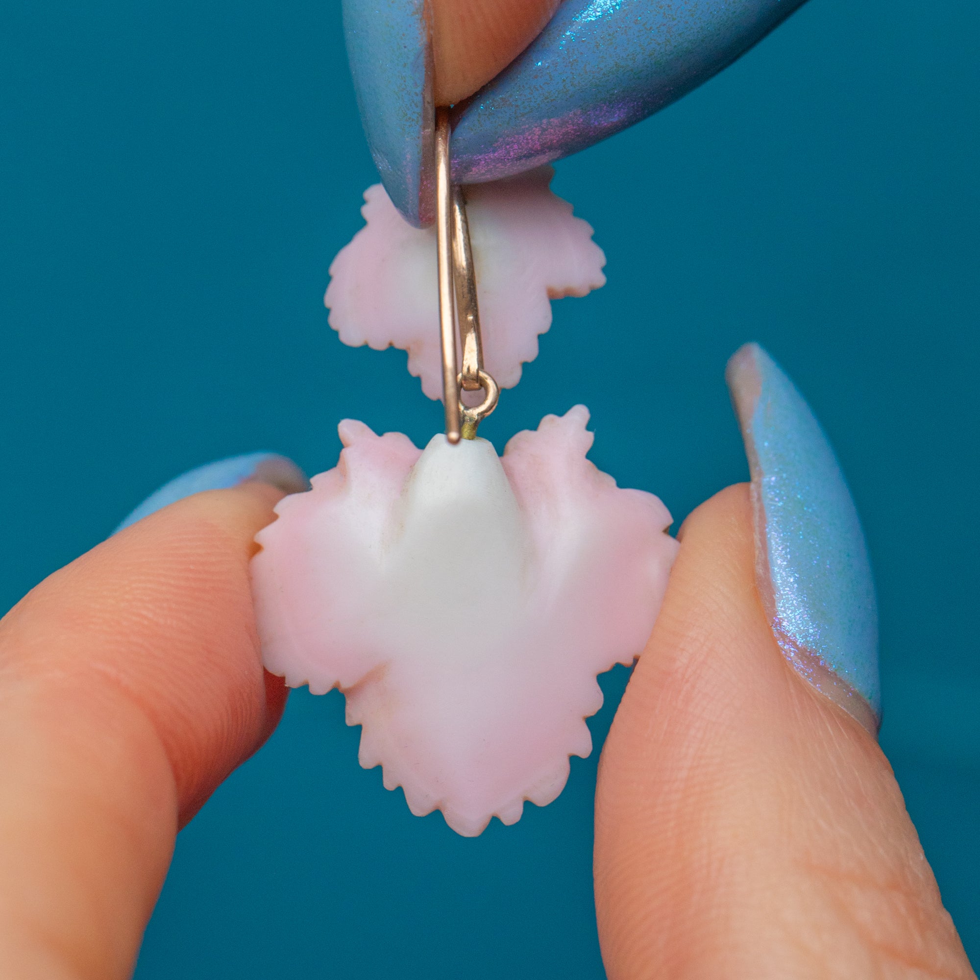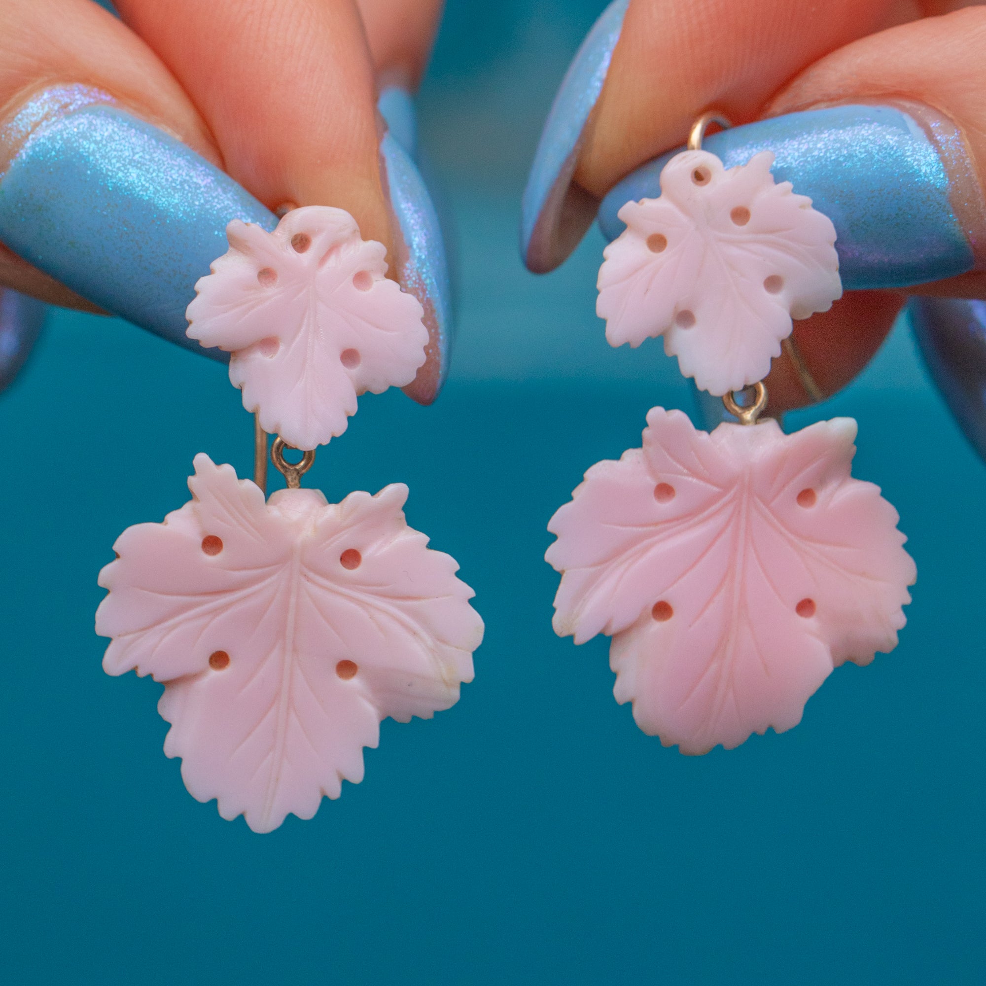 These Victorian 9ct Gold angel skin Coral leaf drop earrings are divine! With buttery 9ct Gold hooks, each drop earring features two maple leaves, crafted meticulously from delicate angel skin Coral. Each boasts a stunning soft pink saturation, with intricate leafy detailing.