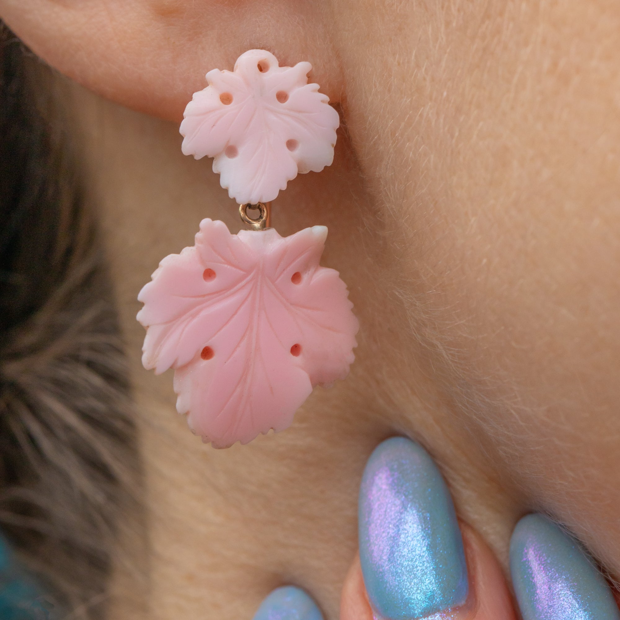 VERY GOOD. These Victorian 9ct Gold angel skin Coral leaf drop earrings are in very good condition. The angel skin Coral has a lovely rose hue and the details have remained defined. There are some signs of wear and discolouration on the back of the Coral, however this is not visible while the earrings are worn. With securely attached hooks, you can wear them with the utmost confidence!
