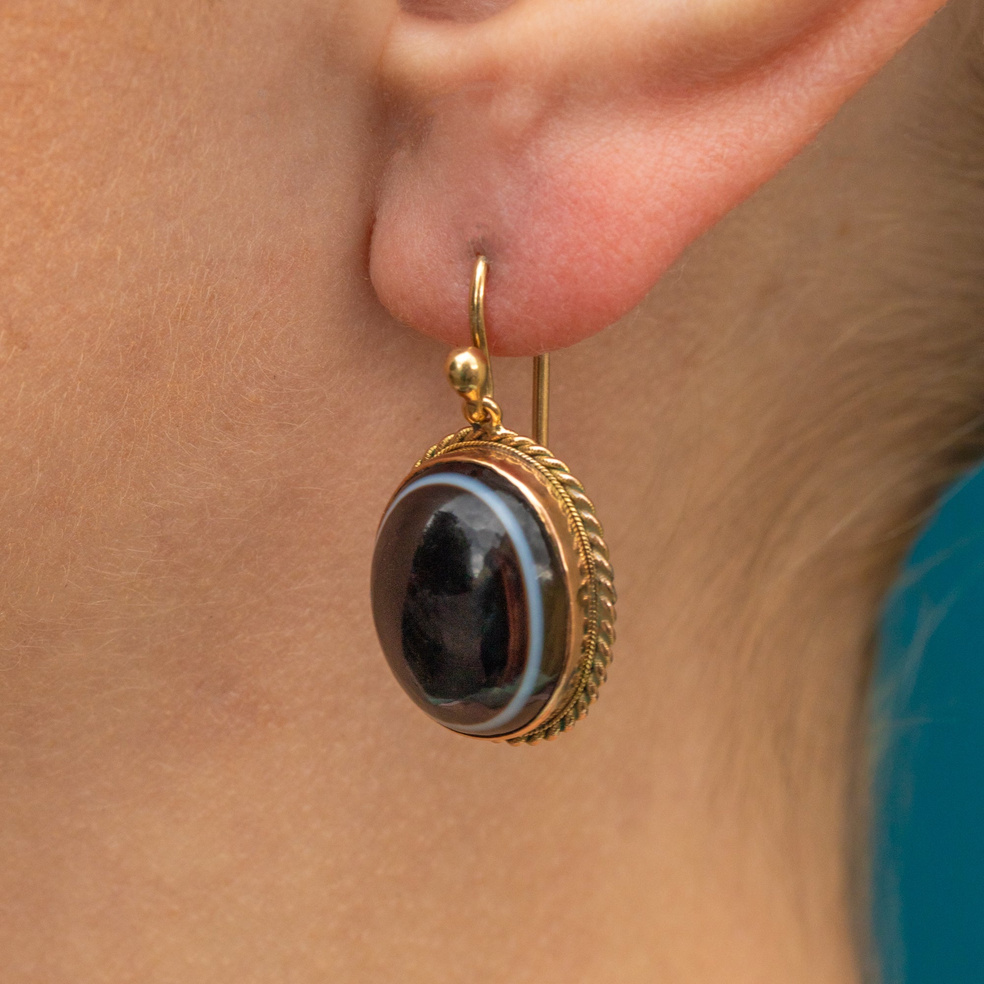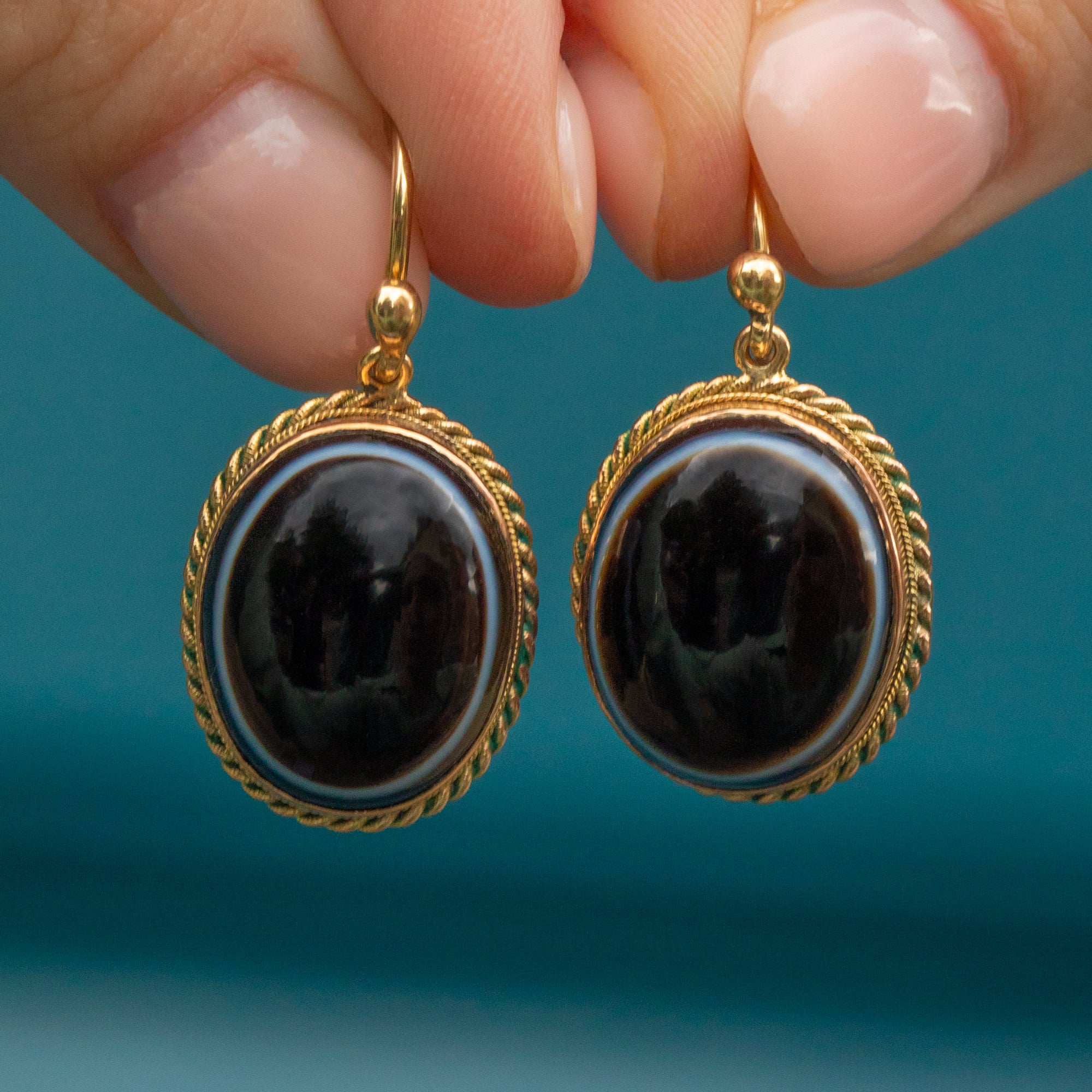 VERY GOOD. These striking Victorian 9ct Gold banded Agate earrings are in great condition! The Agate stones are set securely and are smooth to the touch with no cracks or chips. There is very minor surface wear on the smooth Gold backs, but this is to be expected given their grand age! With 9ct Gold hooks enjoy how these Victorian earrings sway softly as you move.