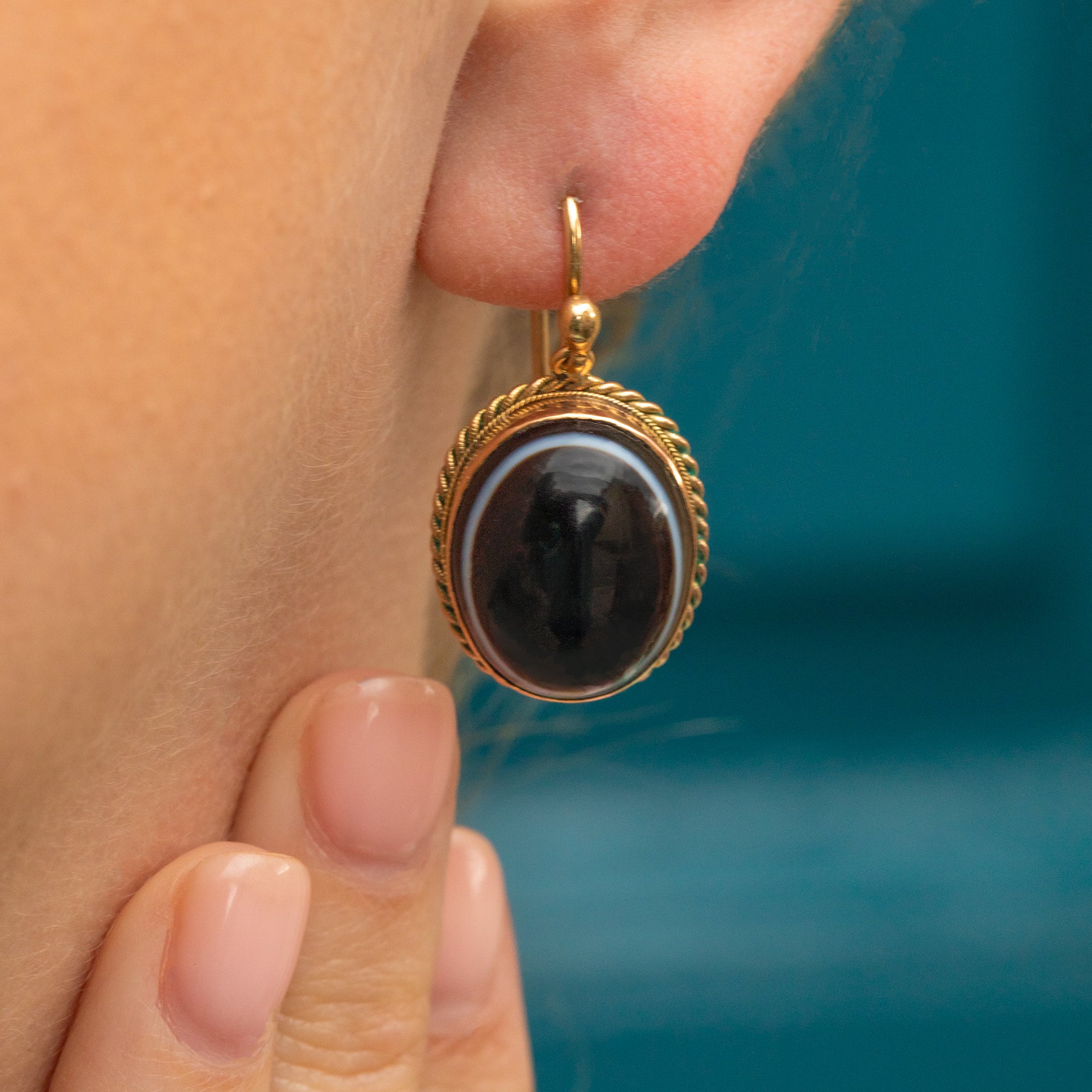 We love these plump Victorian 9ct Gold banded Agate earrings! It is impossible not to become enticed by the Agate cabochons with their pools of jet-black hues circulated by a cream band running along the edge.