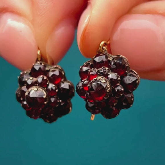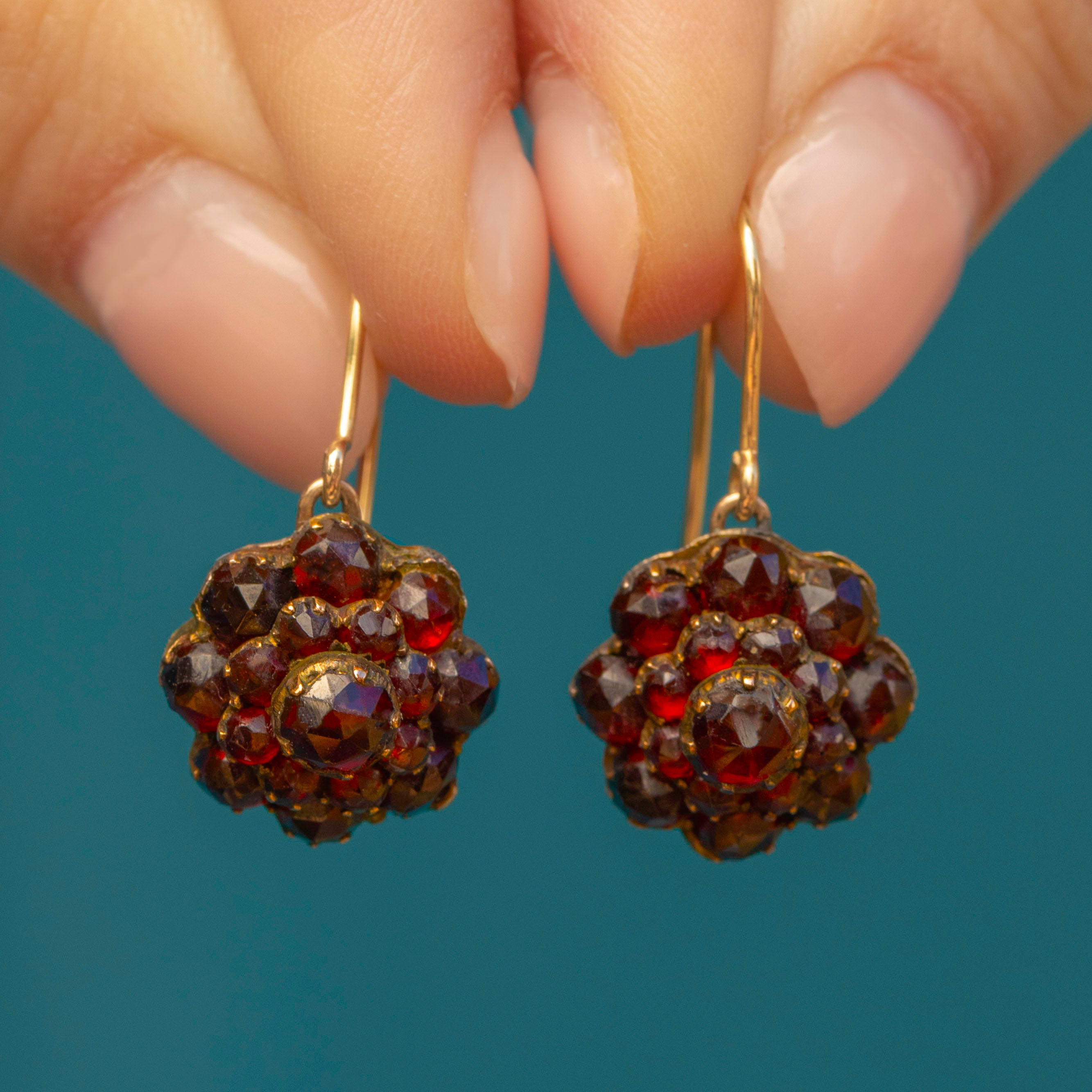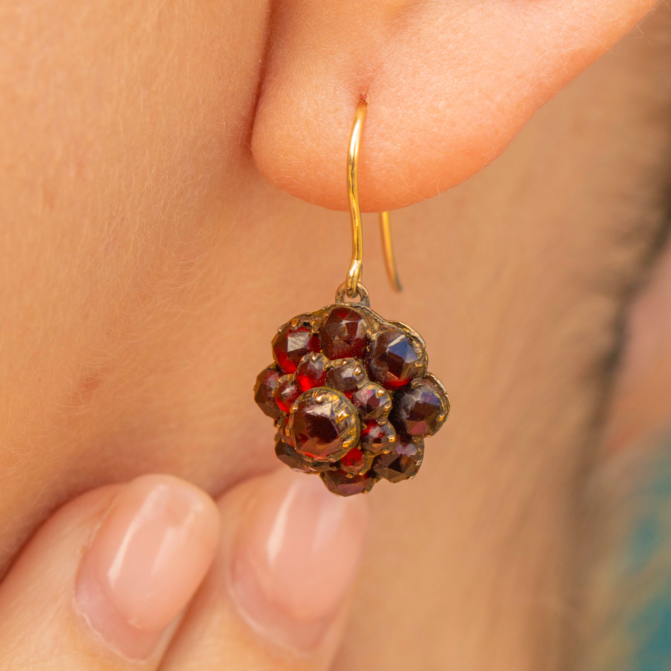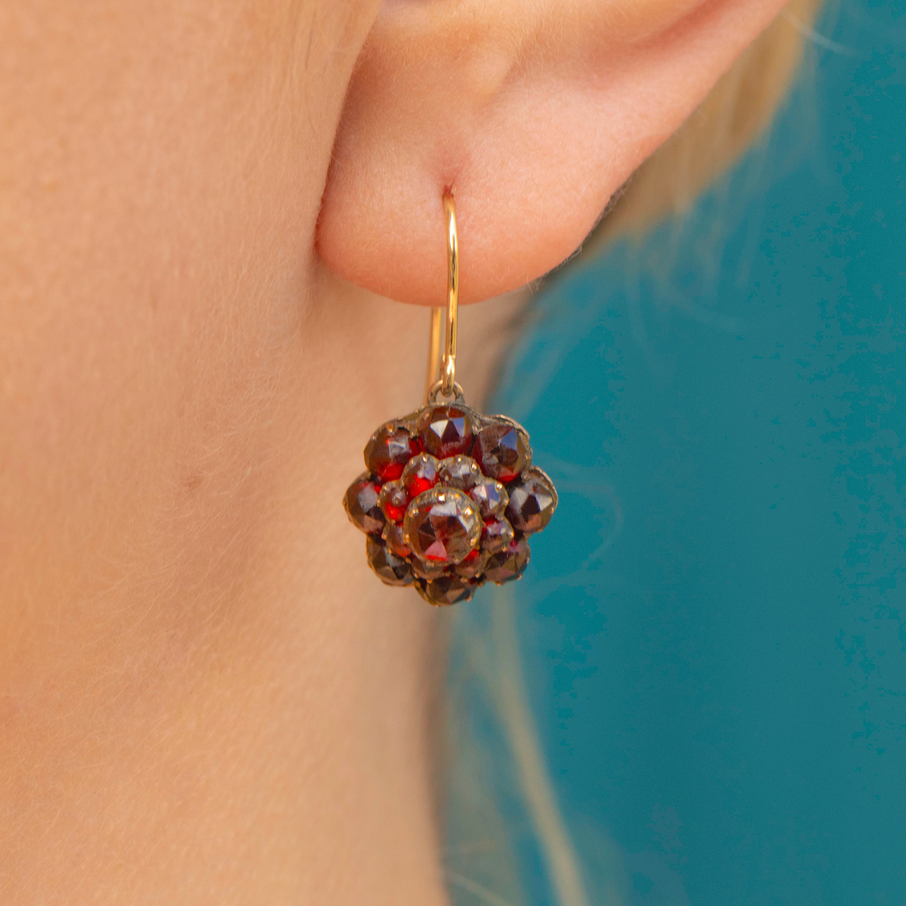 Let these Victorian 9ct Gold Bohemian Garnet earrings do all the talking as they ooze seduction from your lobes! Inlaid with dainty berry red rose-cut Garnets arranged into petite floral clusters, these Victorian earrings glisten beneath the light; you can even catch a glimpse of them with your hair flowing beside your face.