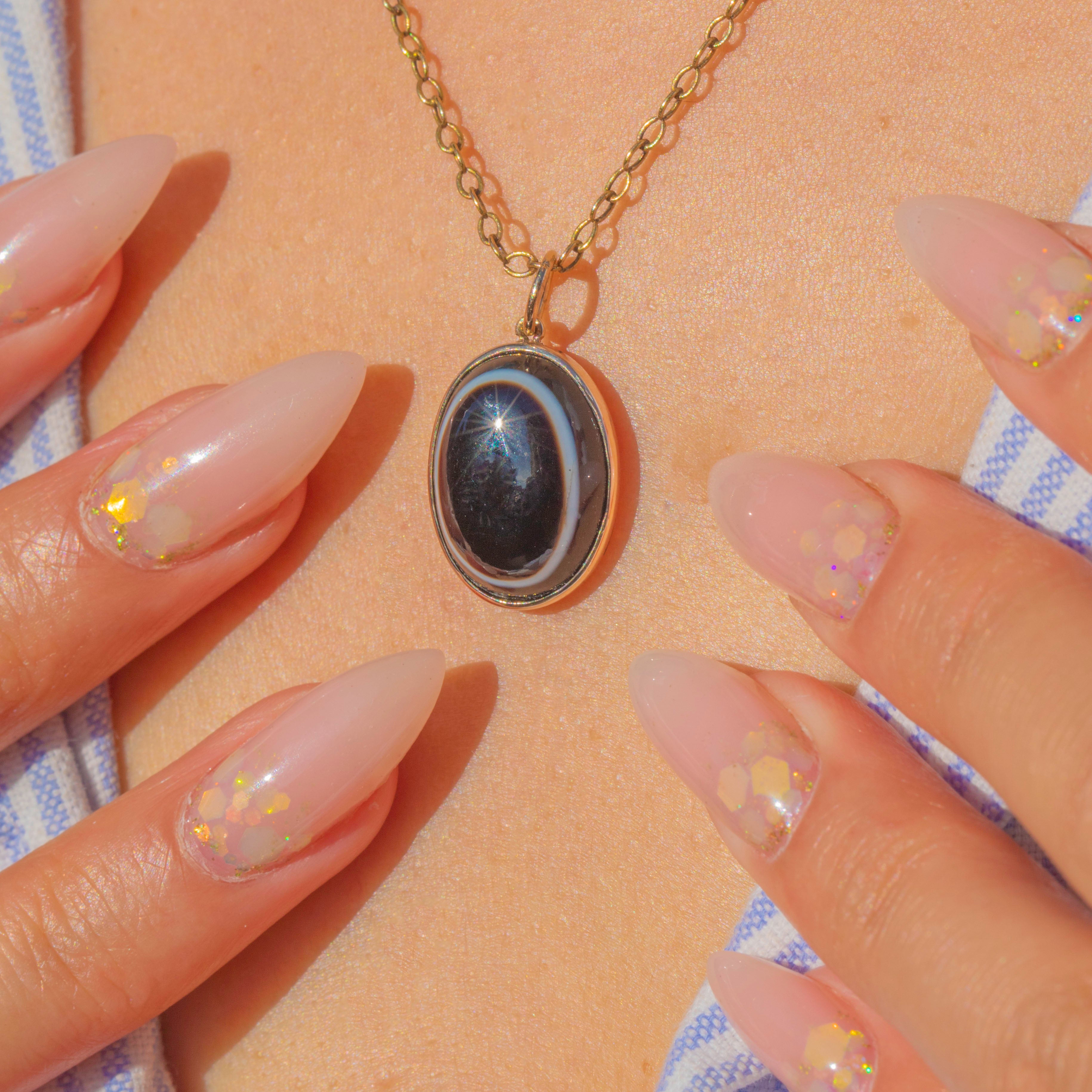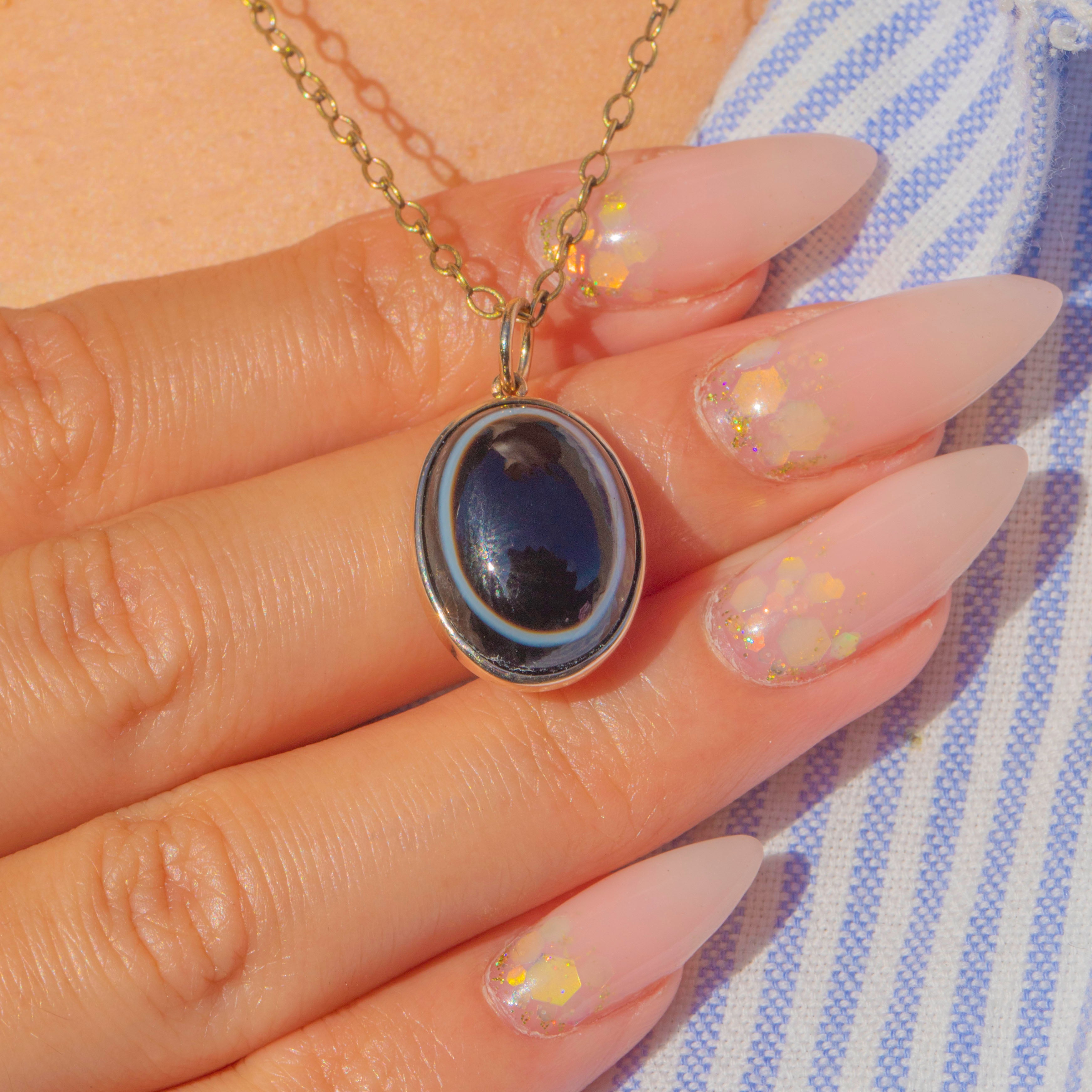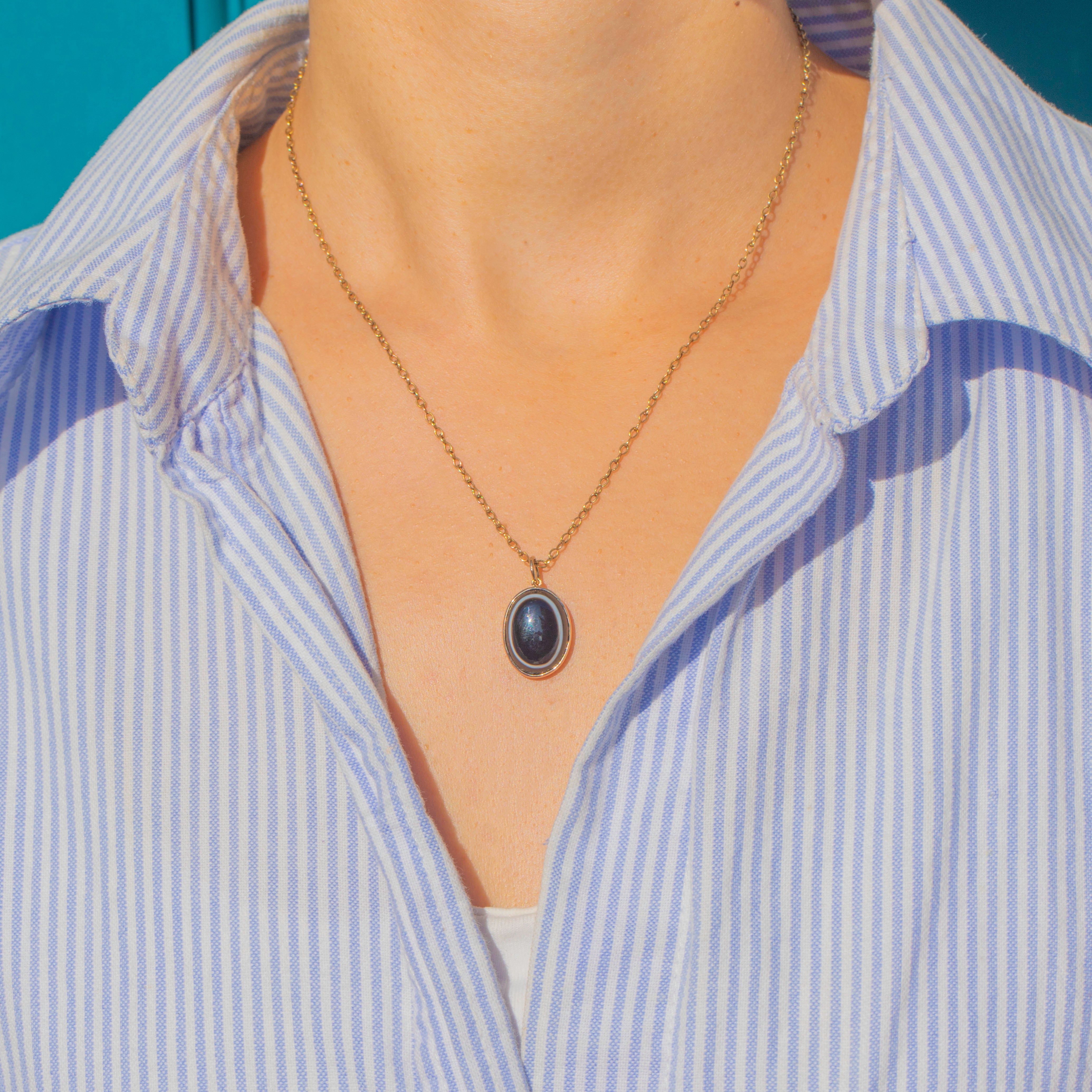 This striking Victorian pendant is crafted in 9ct Gold and set with a glossy Banded Agate cabochon. The natural black stone displays bold white and brown layers, creating a dramatic and eye-catching contrast.