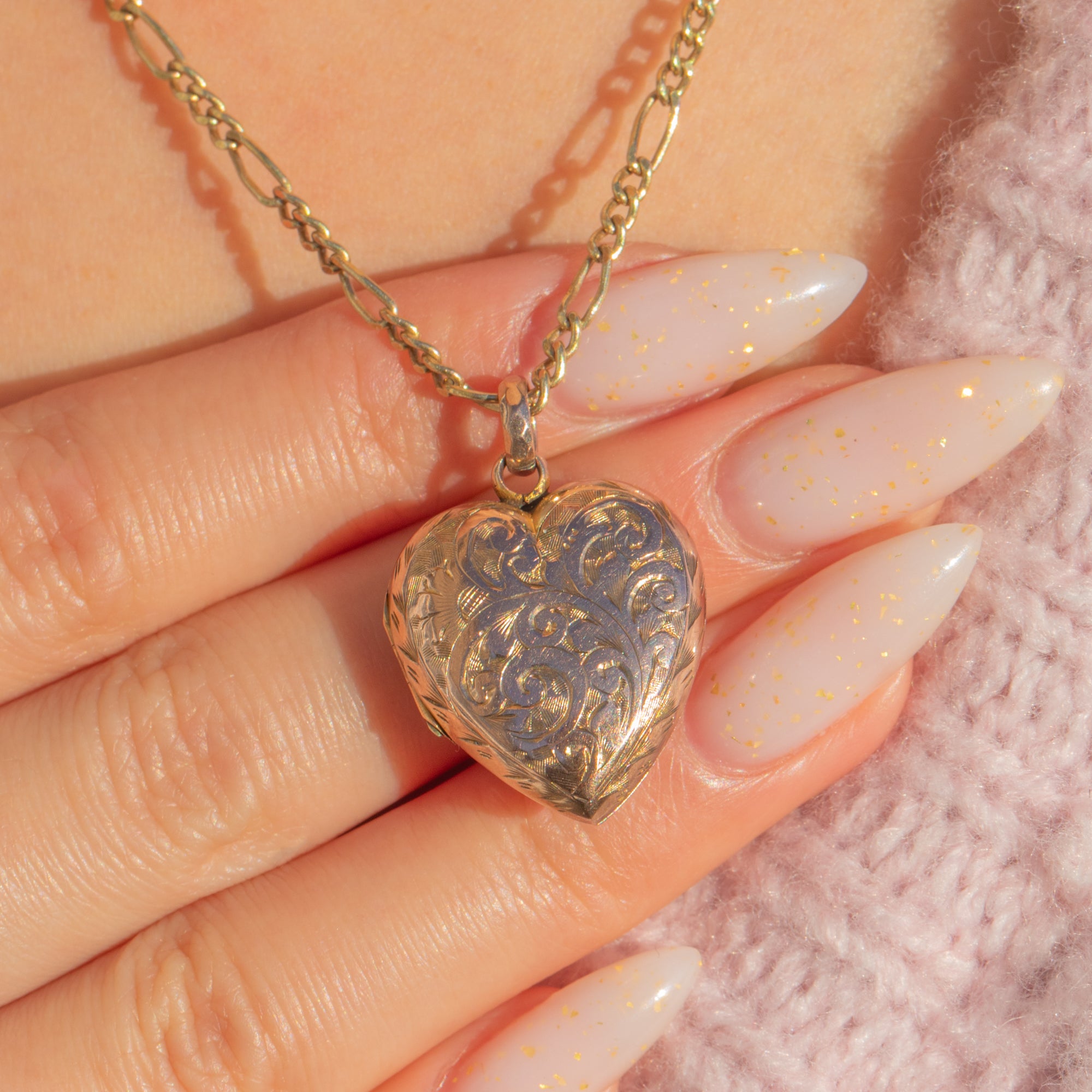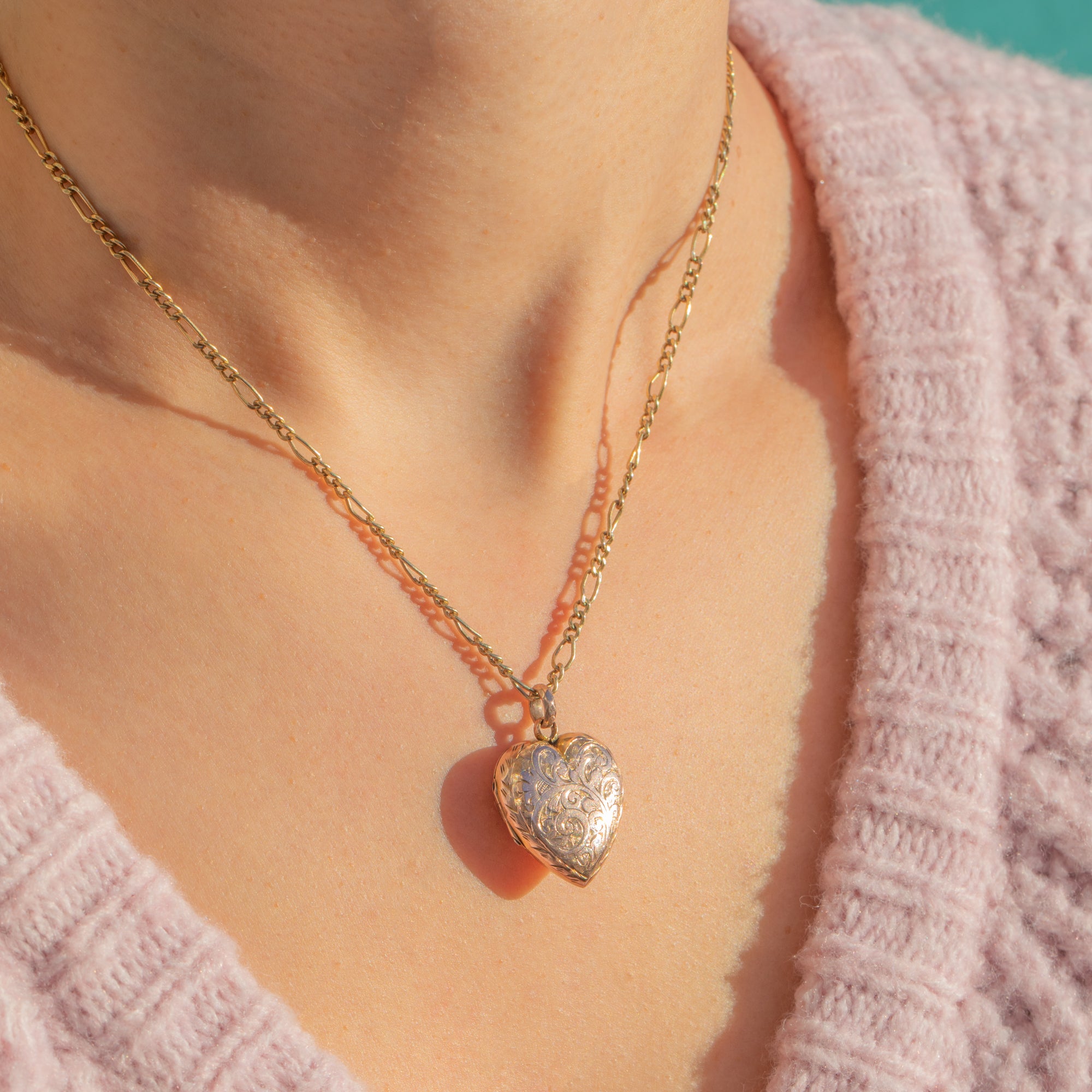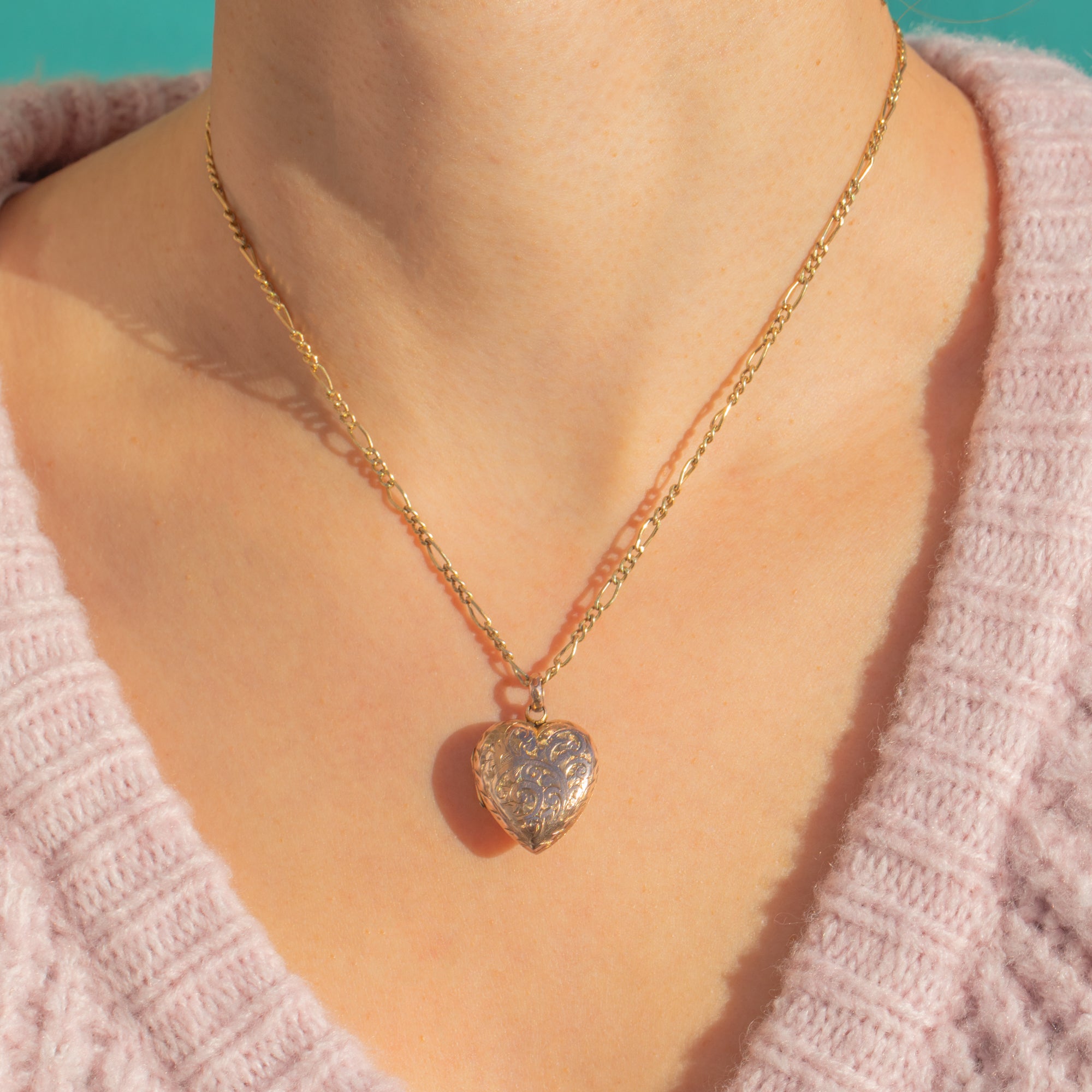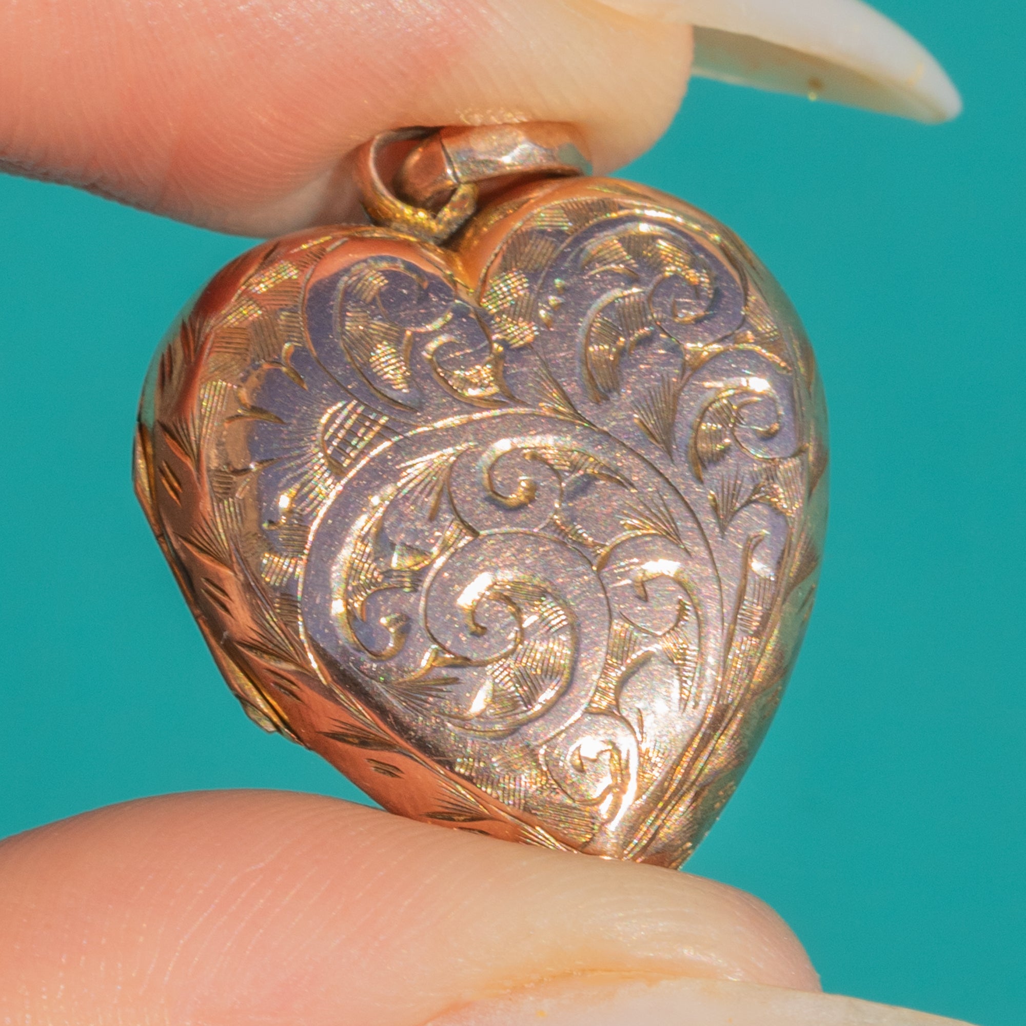 A romantic Victorian heart locket with a charming rosy hue. The warm 9ct Gold back and front are decorated with beautifully bright-cut foliate scrolls and chevron accents that dance in the light. Its softly domed “puffy” profile and petite scale make it a sweet, wearable keepsake.