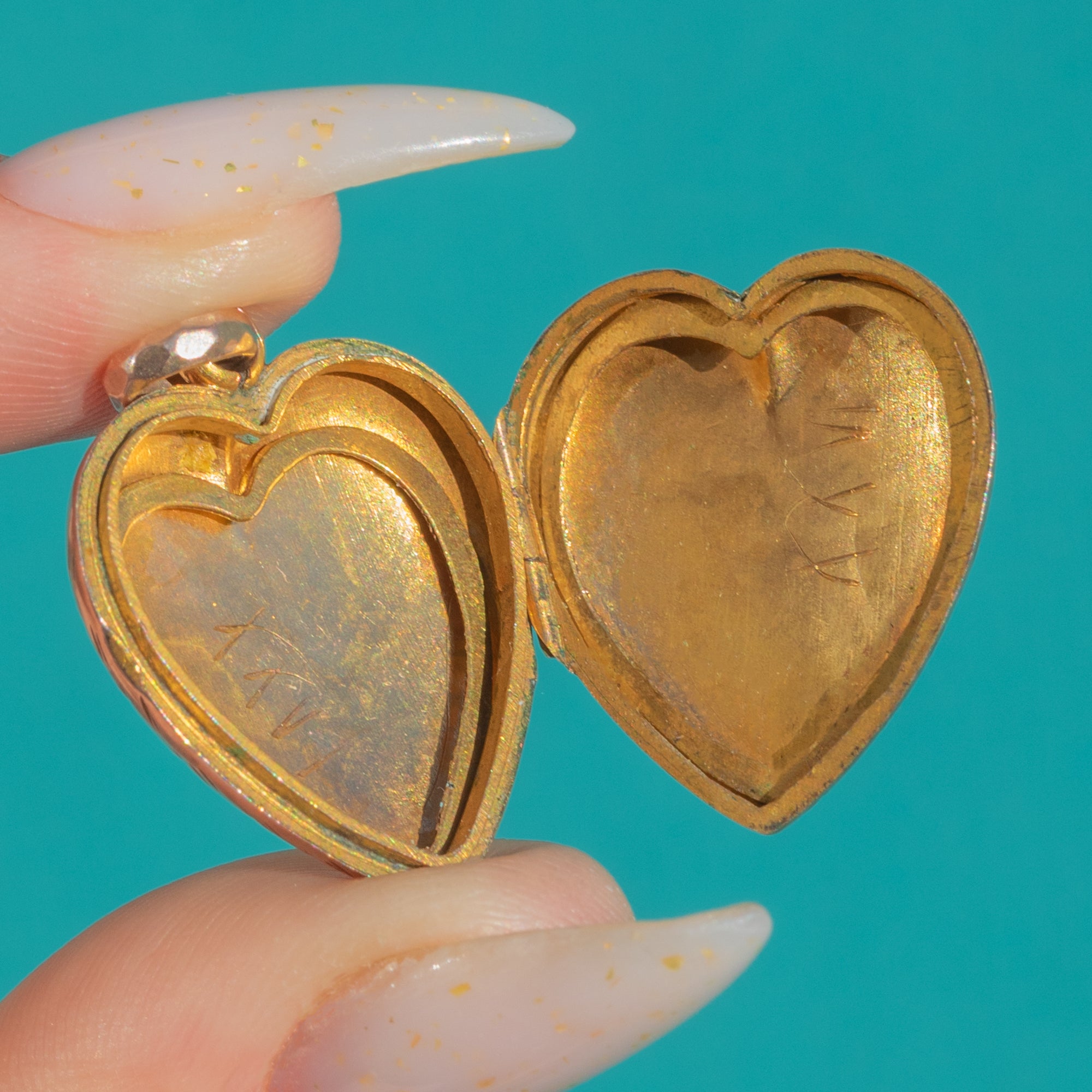 VERY GOOD: Light surface wear and fine scratches throughout, with crisp, reflective engravings. The hinge is sound and the locket closes securely, though not with an audible click; interiors show typical scuffs and small tool marks, and both picture rings are present. No obvious dents, splits, or visible repairs.