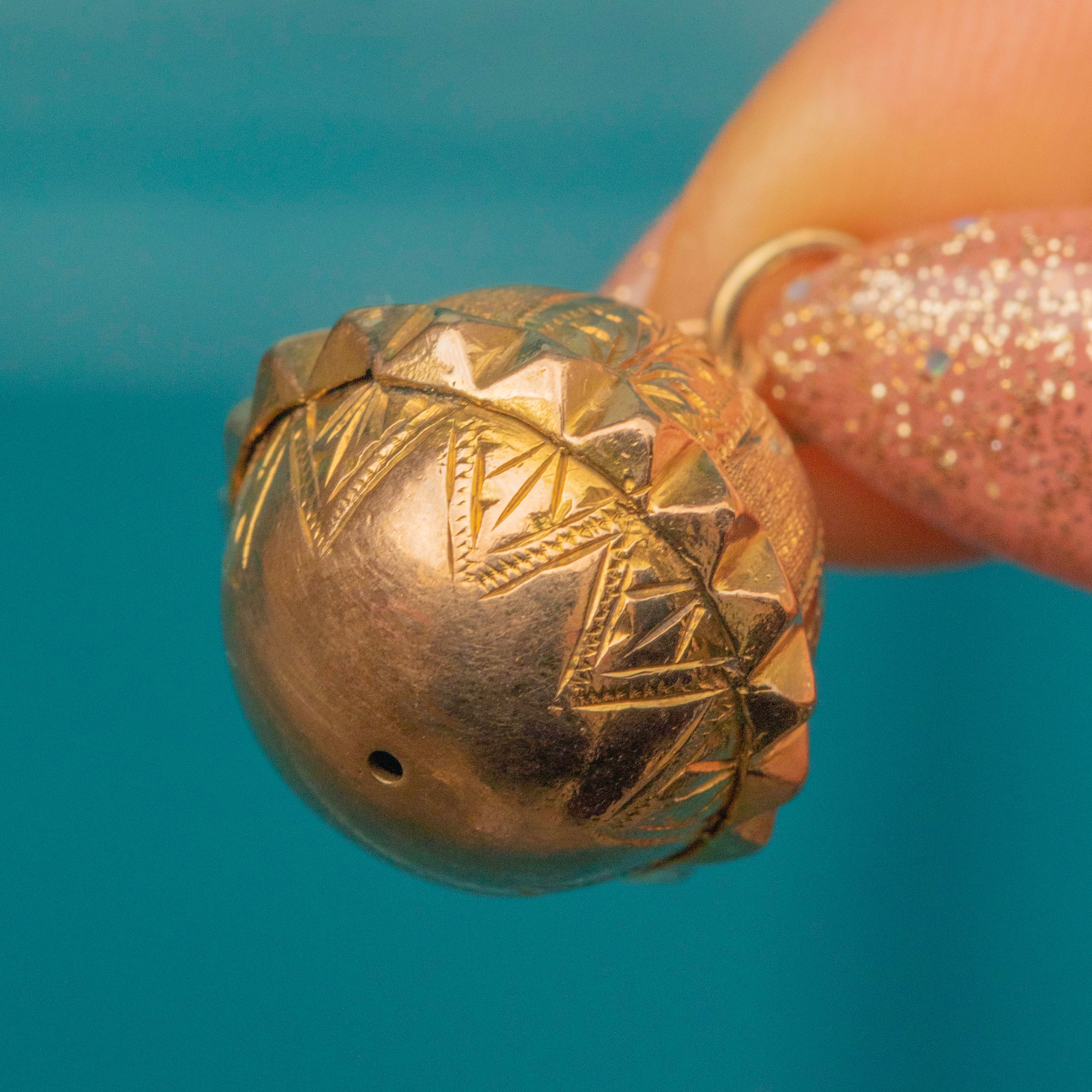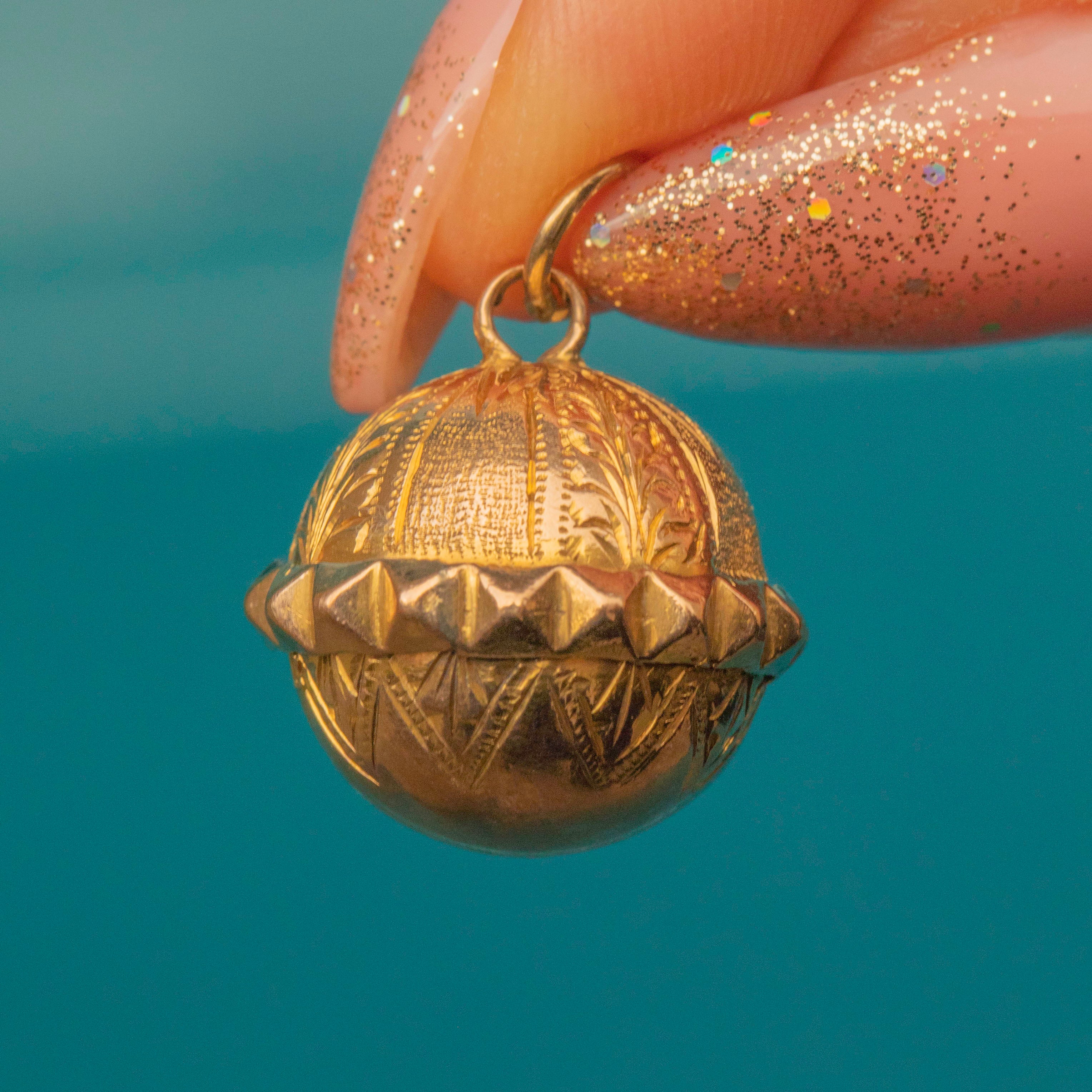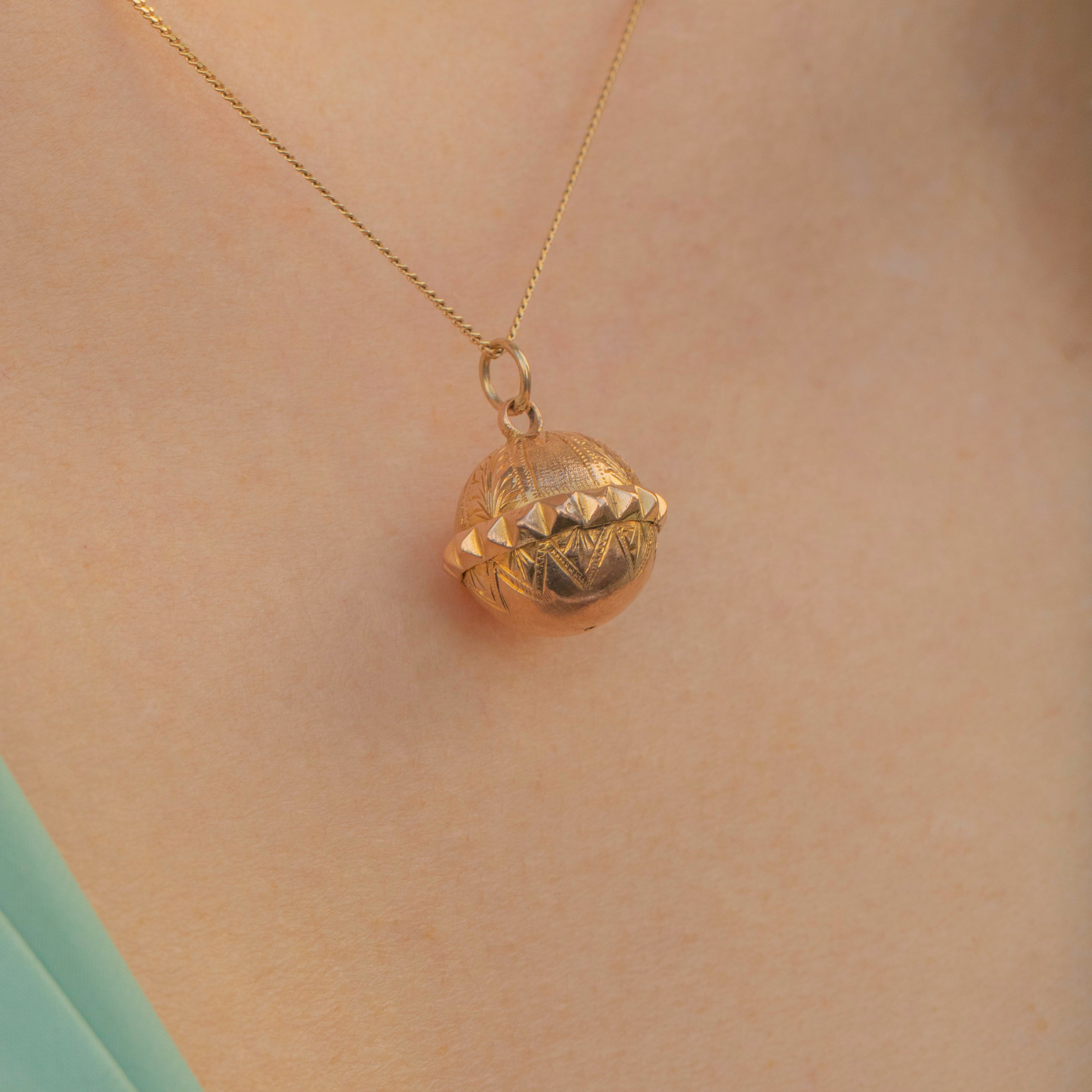 EXCELLENT This Victorian 9ct Gold engraved orb pendant is in very good condition. The orb has no dings or damage to note, with gorgeous engravings to absorb from every angle. The Gold has a splendid pale hue, and she is sure to remain so for many decades more. There is also a large jump ring so you can attach her onto a chain of your choice!
