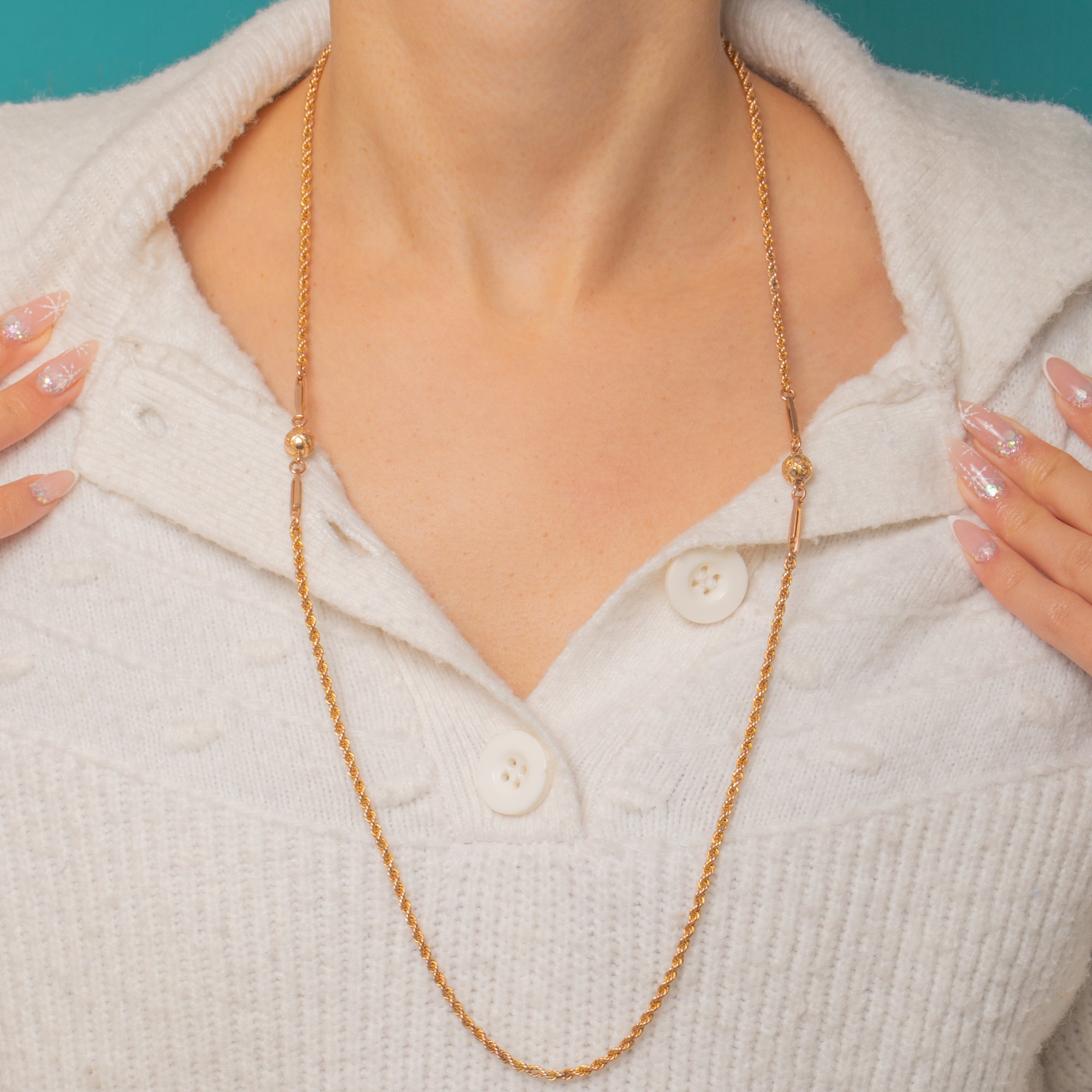 An elegant Victorian fancy link chain in glowing 9ct Gold. This long beauty flows with twisted rope links with ball and fetter sections formed of chased beads flanked by chunky paperclip links. The interplay of textures and the subtle rosy‑to‑yellow hues give it that unmistakable antique allure—ornate yet refined, with a graceful drape.