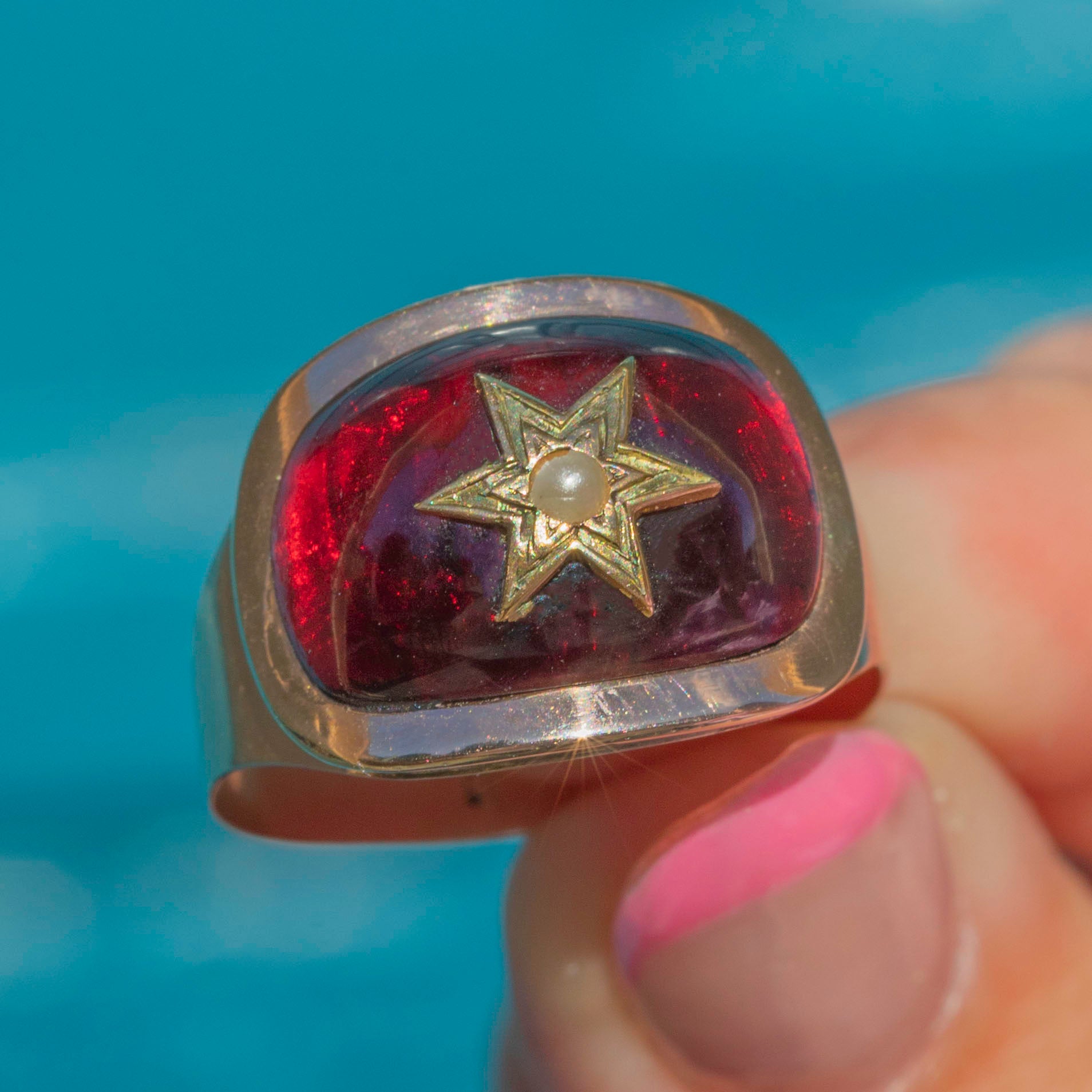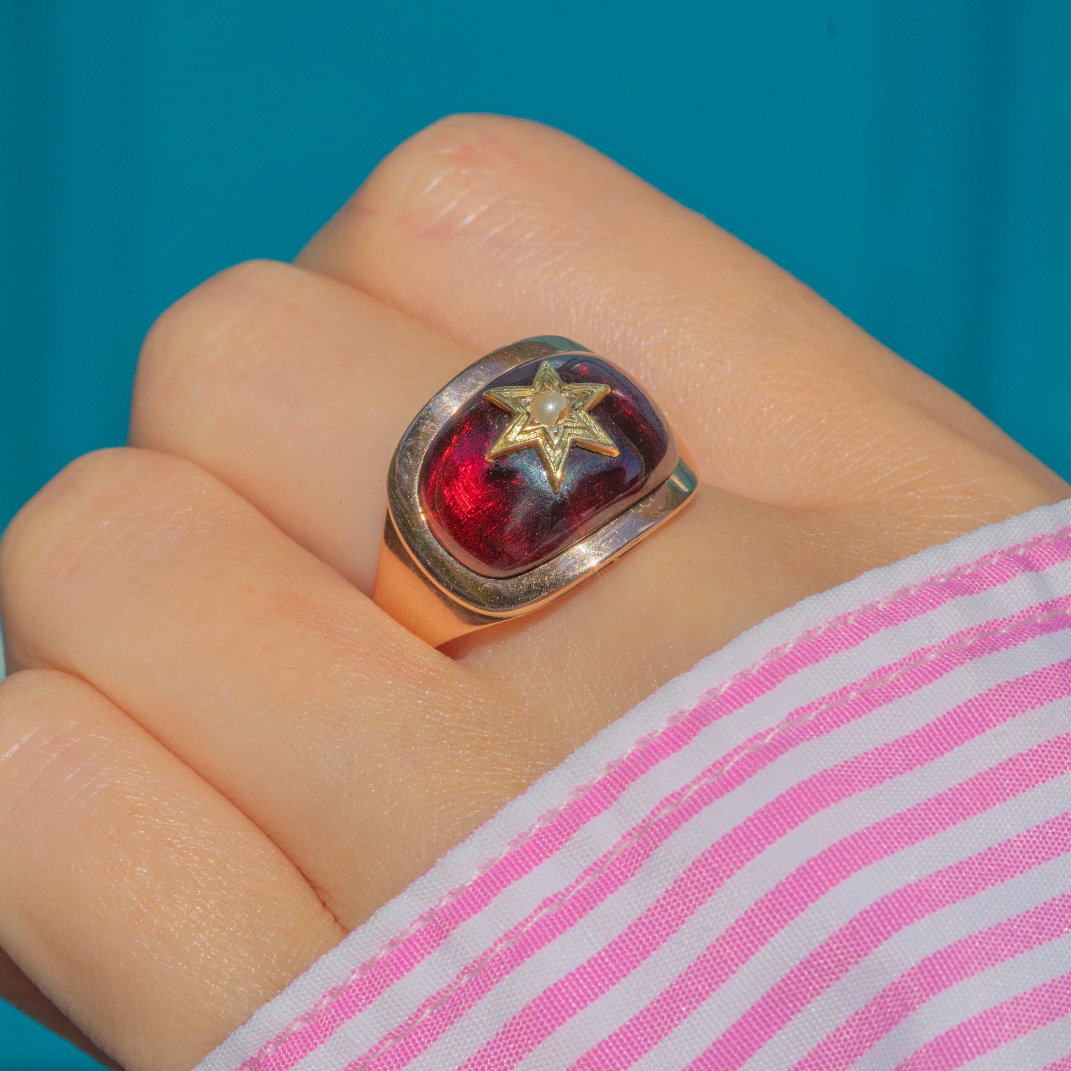 A true celebration of Georgian craftsmanship, this chunky Gold ring boasts a vibrant Garnet cabochon inlaid with a bold star, set with shimmering Pearl. The inside of the band has been intricately engraved with the words "Sacred I Keep This Relic", adding intrigue to this magnificent piece.