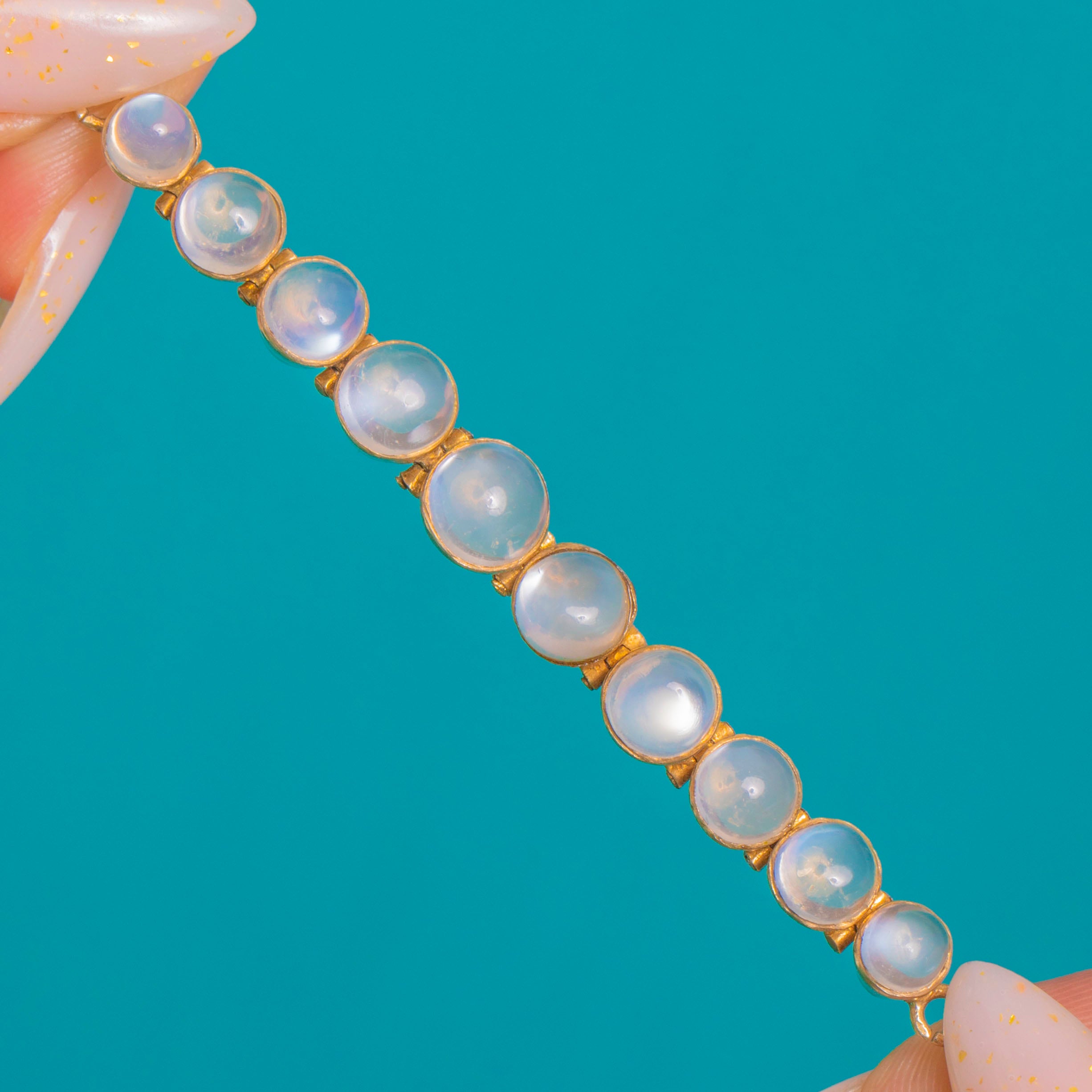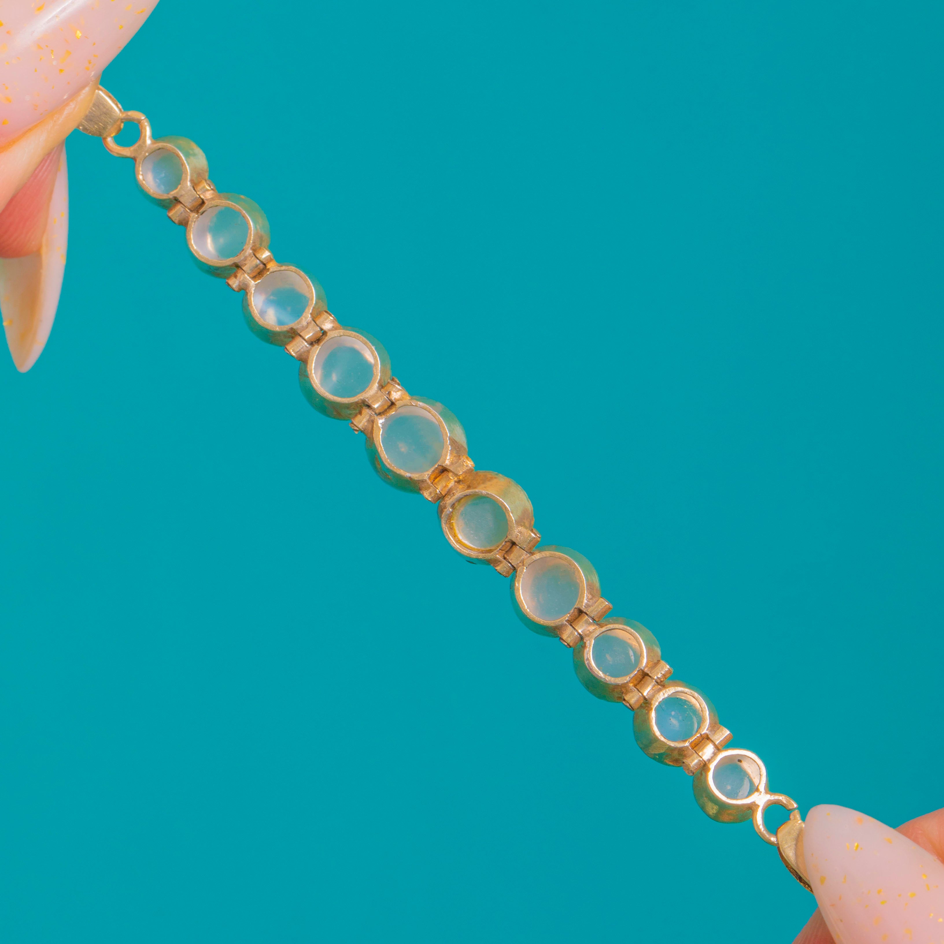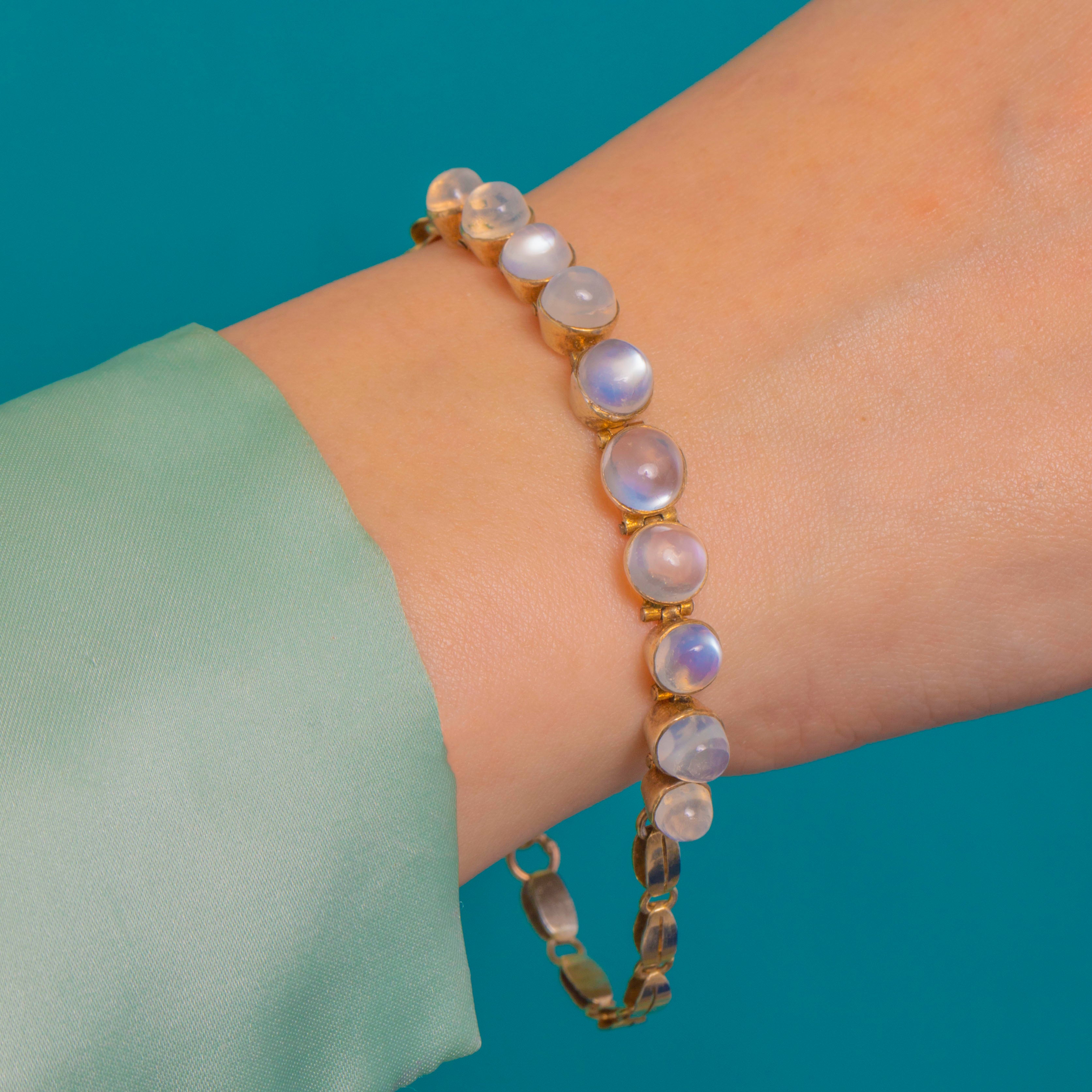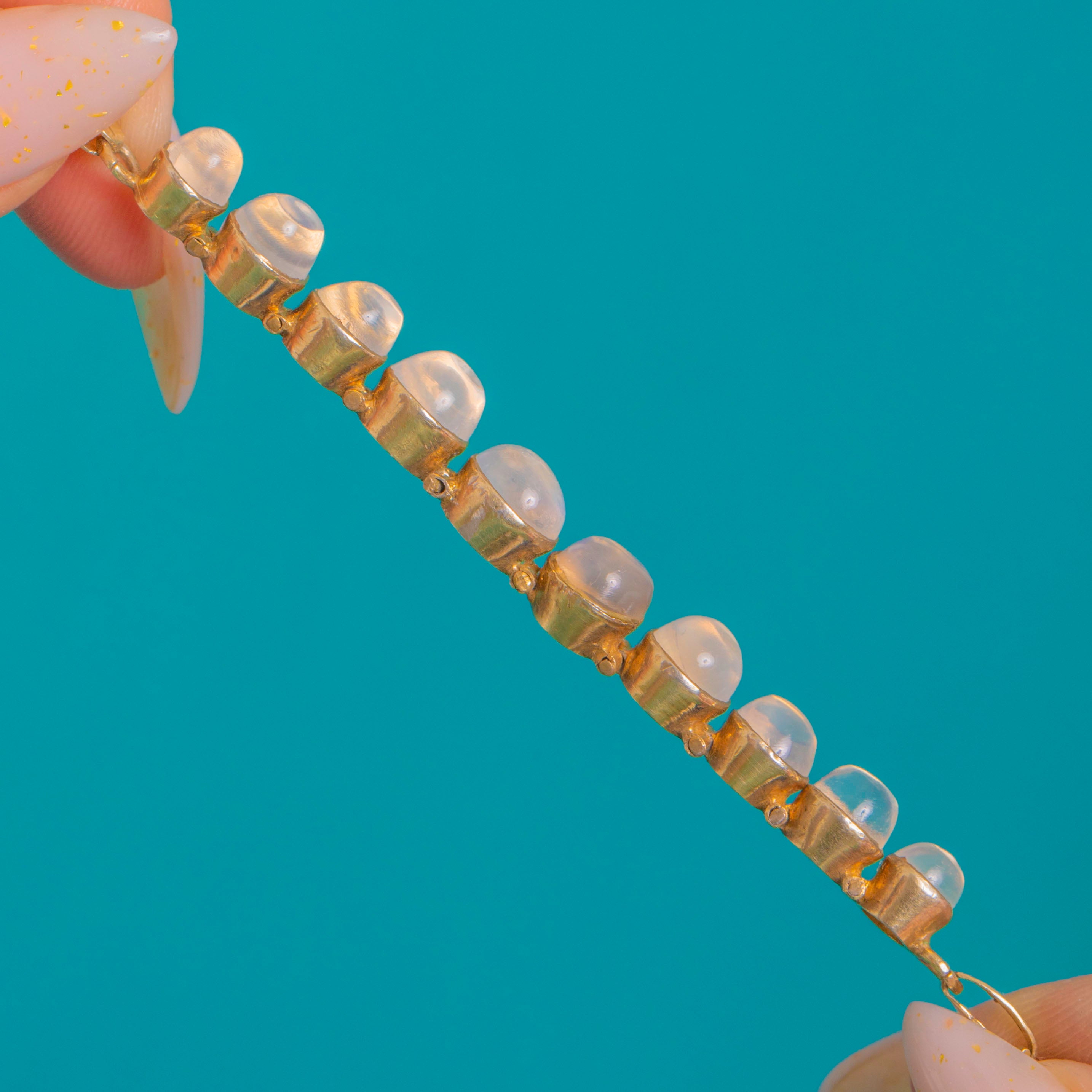 A luminous line of Moonstone cabochons graces this Victorian bracelet, each stone displaying a gentle blue-white glow. Individually collet-set and articulated, the cabochons form a refined rivière that sits slim and fluid on the wrist.