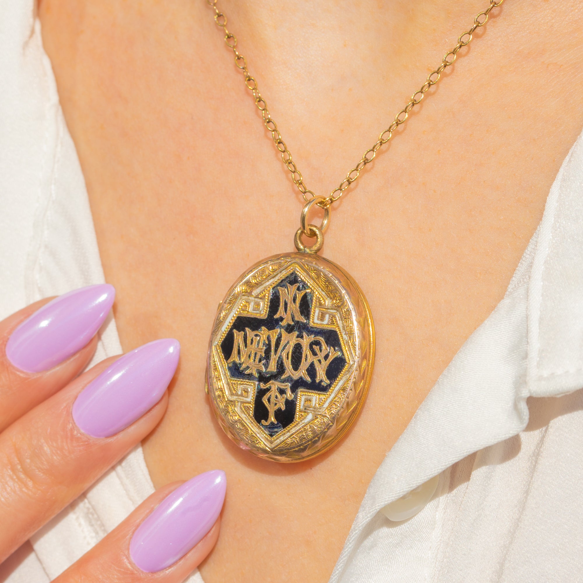 An evocative Victorian “In Memory Of” locket crafted in 9ct Gold, richly detailed with Black and White Enamel. The front features a recessed black Enamel octagonal cartouche with raised Gothic “IN MEMORY OF” lettering, framed by crisp engine-turned fields and finely hand-engraved foliate borders for a beautifully decorative, late 19th-century look.