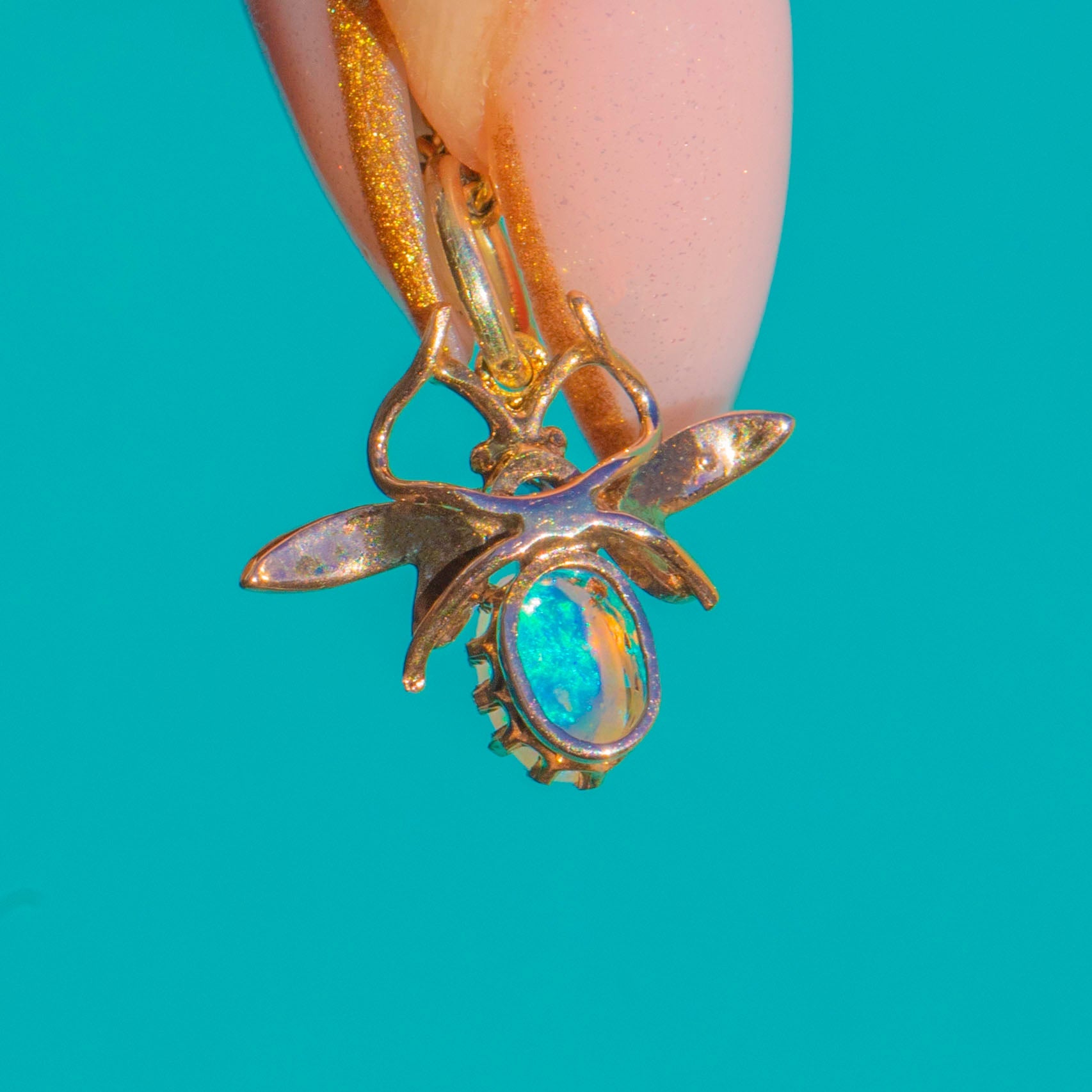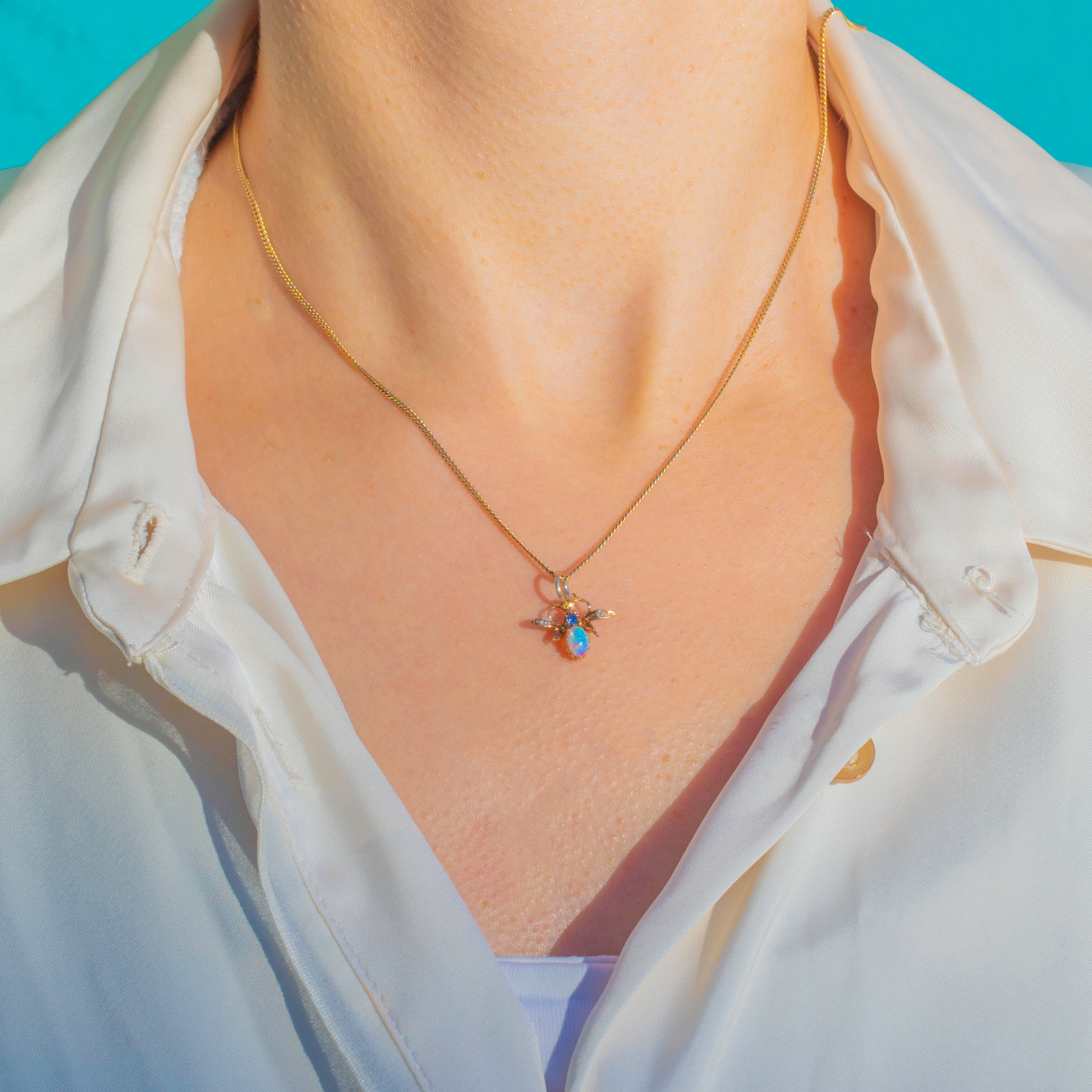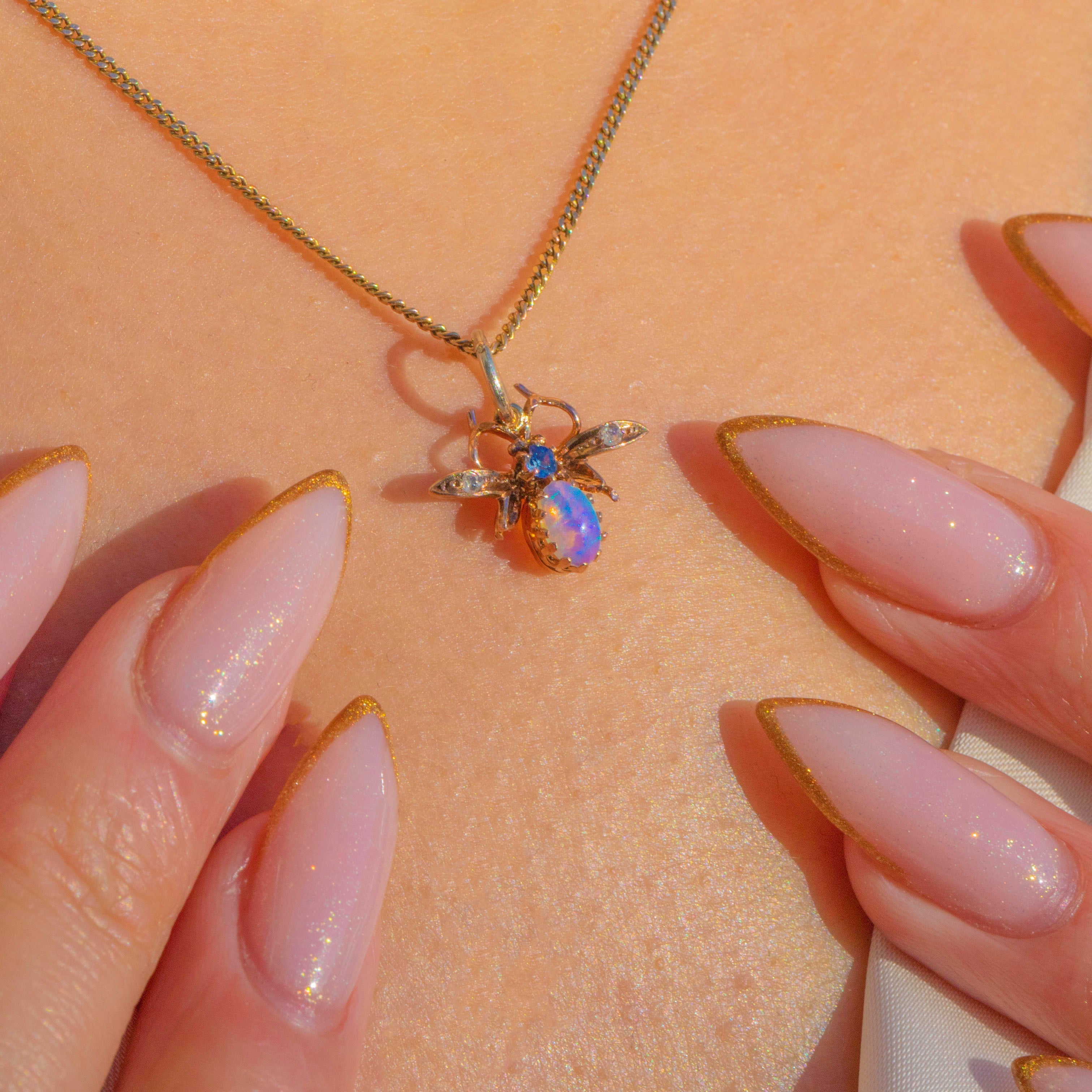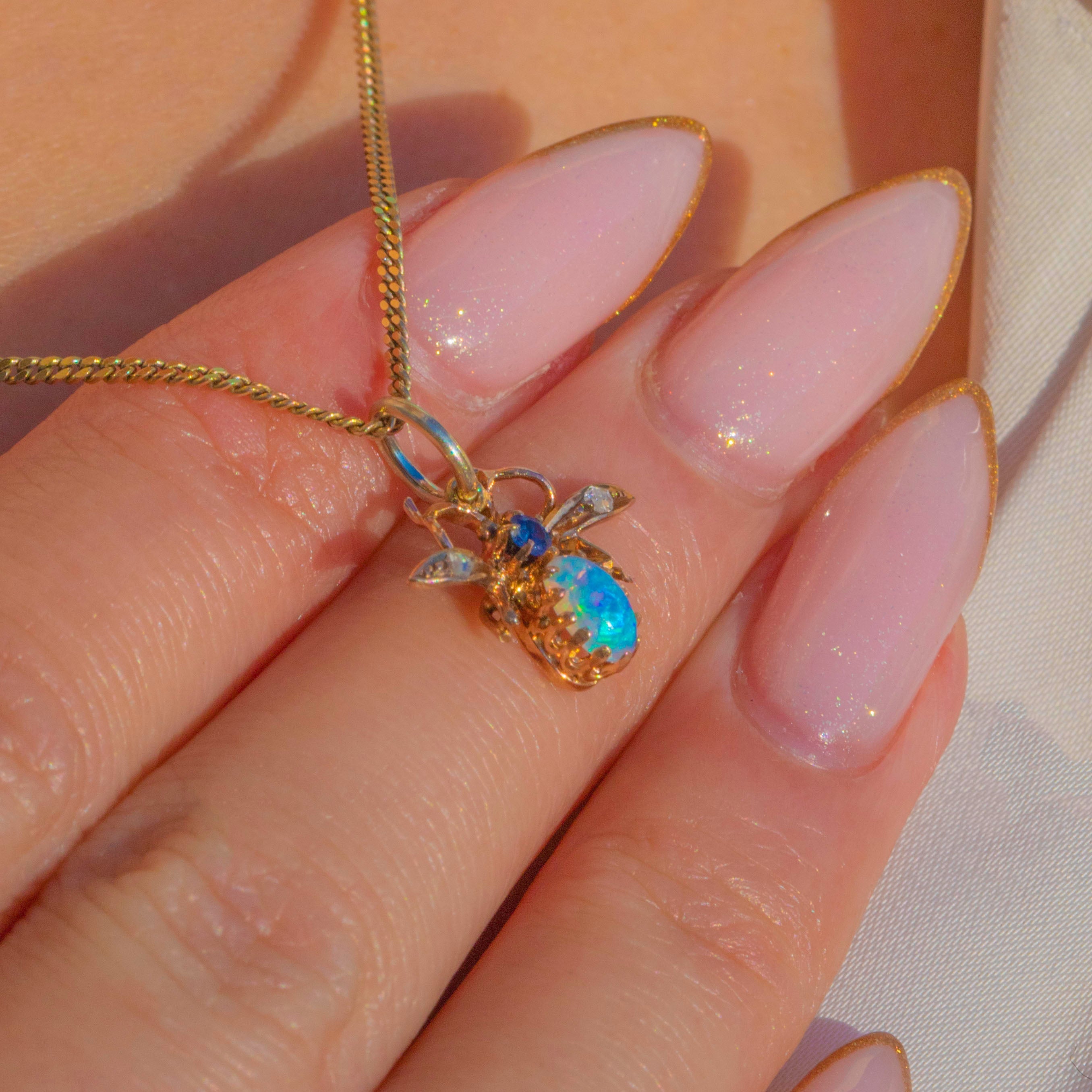 This charming Victorian bug charm is crafted in 9ct Gold and set with a bright opal body, sparkling Diamond-set wings, and a vivid blue Sapphire at the head. The opal displays lively blues and greens, giving the piece a magical, glowing presence.