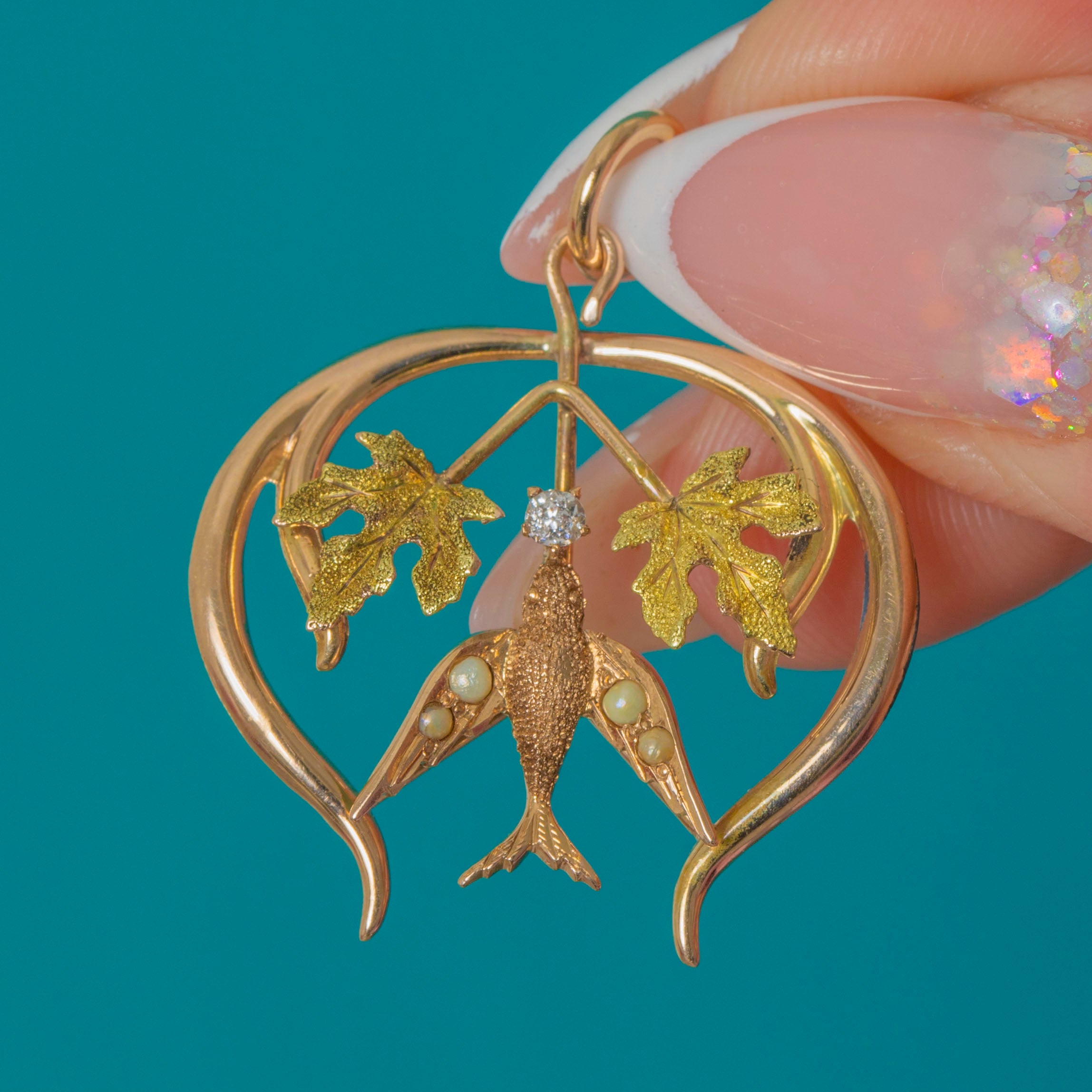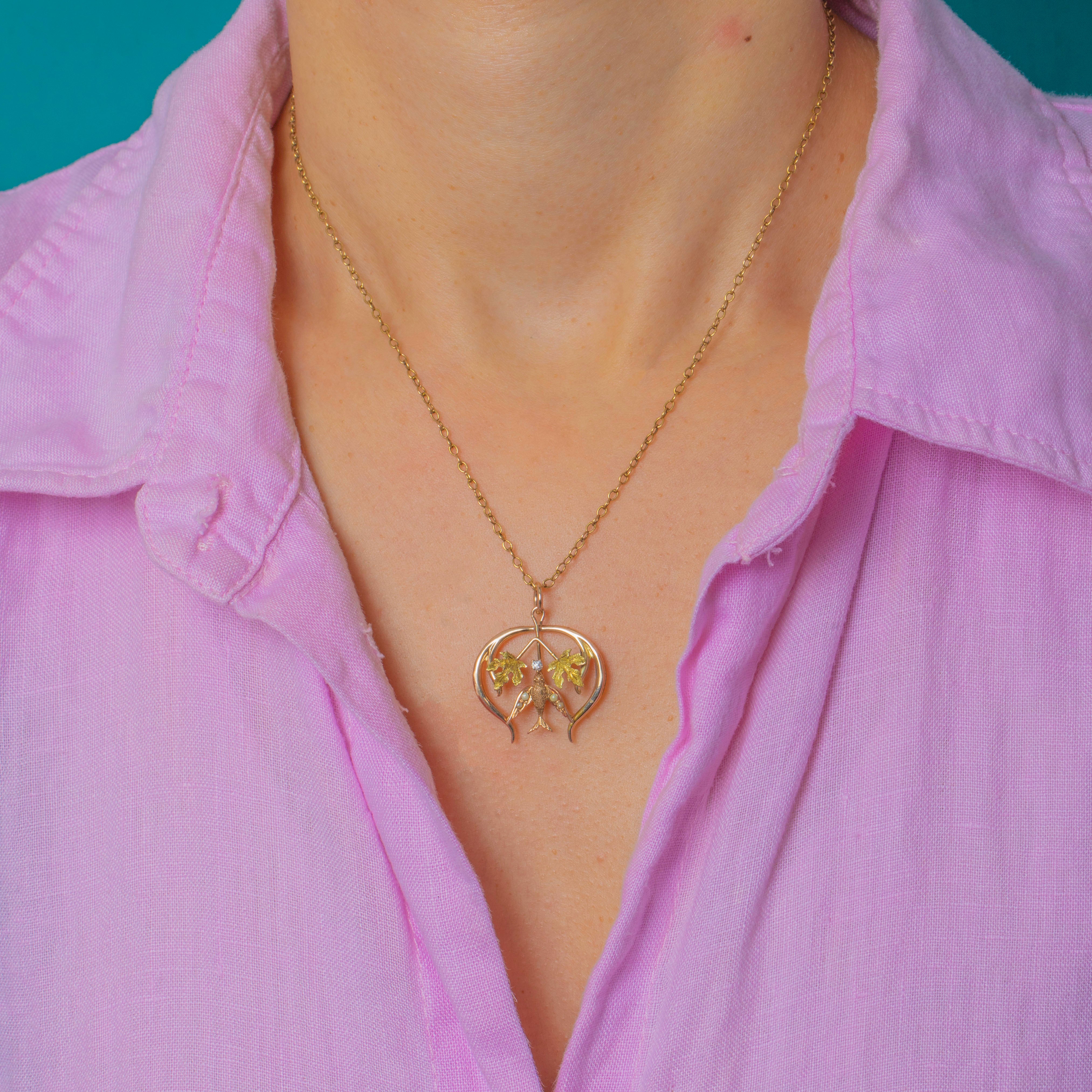 The pendant features a sparkling Diamond at the centre, and a graceful Swallow embellished with graduating seed Pearls. Light, expressive and beautifully made, it captures the romantic artistry of the era.