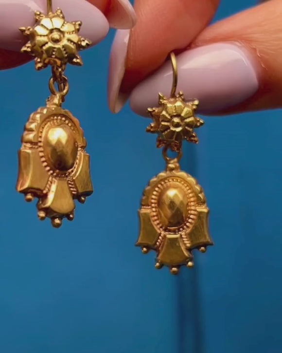 EXCELLENT. These Victorian 9ct Gold textured drop earrings are in excellent condition! The Gold possesses wonderful reflective qualities, with each component securely connected and the hooks firmly soldered allowing you to wear them confidently!
