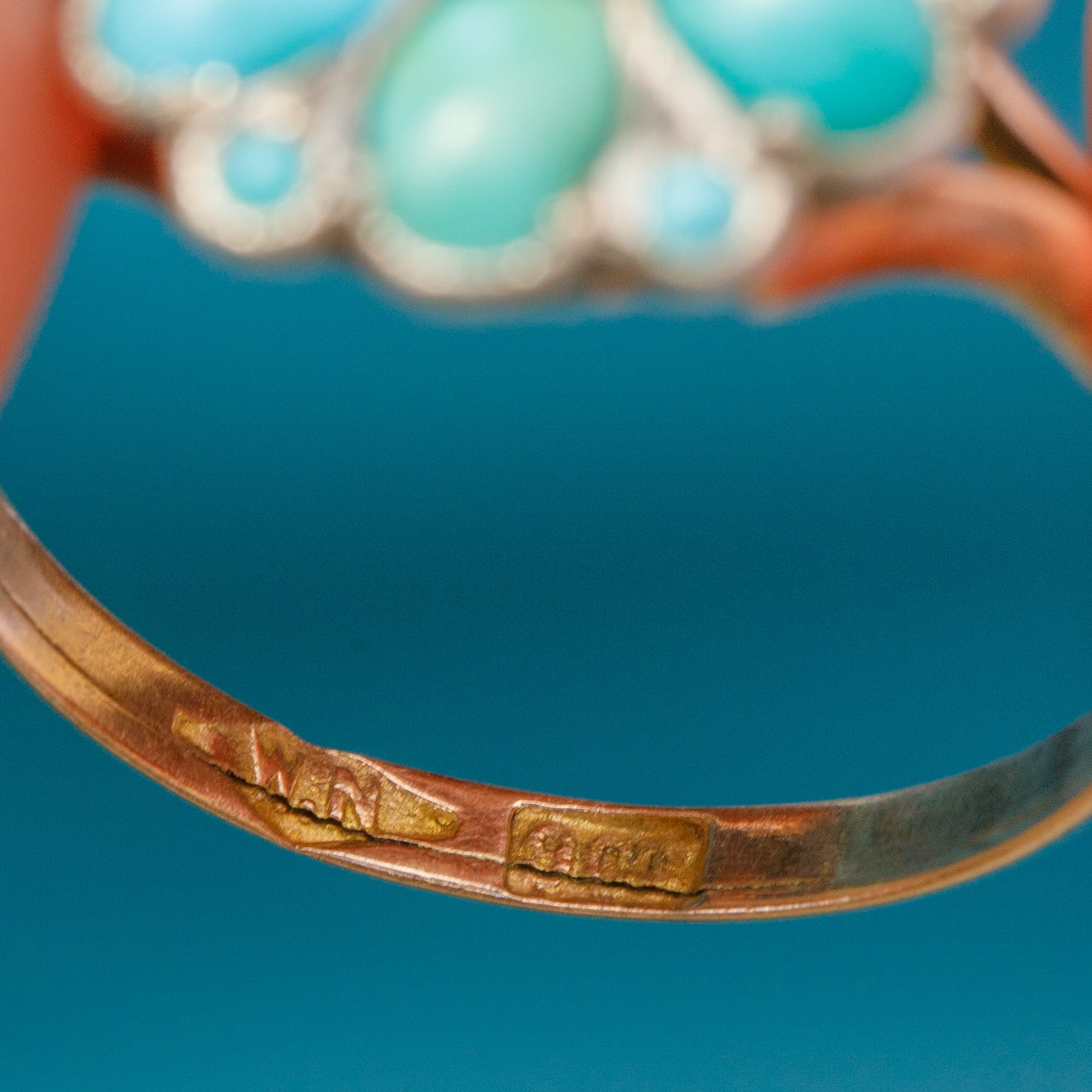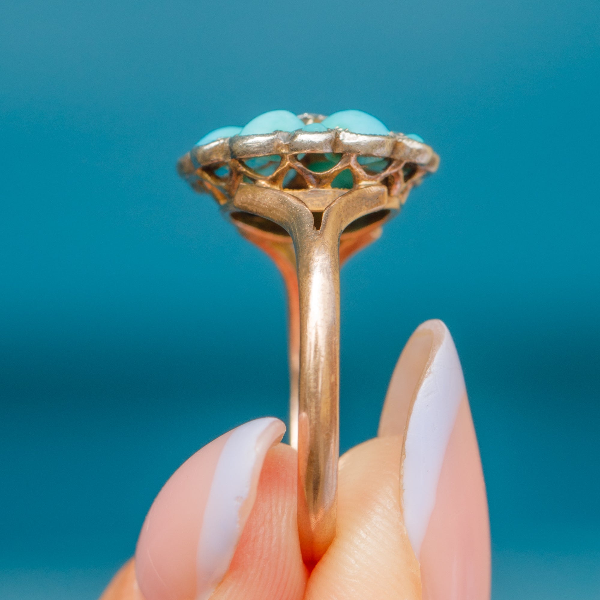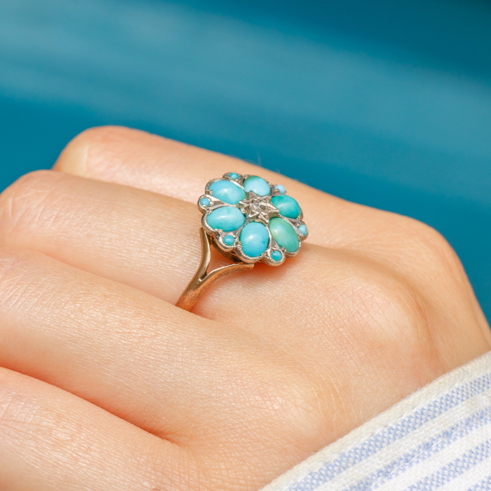 Crafted from rosy 9ct Gold, her large ring face has been formed into an adorable floral motif, with a central scintillating rose-cut Diamond surrounded by vibrant Turquoise petals. Each Turquoise stone has a distinct azure and green tone, giving this Victorian cluster ring a lovely, unique charm.